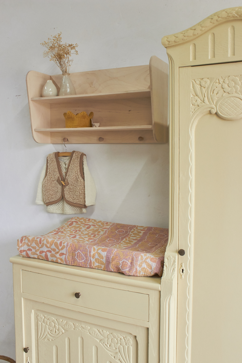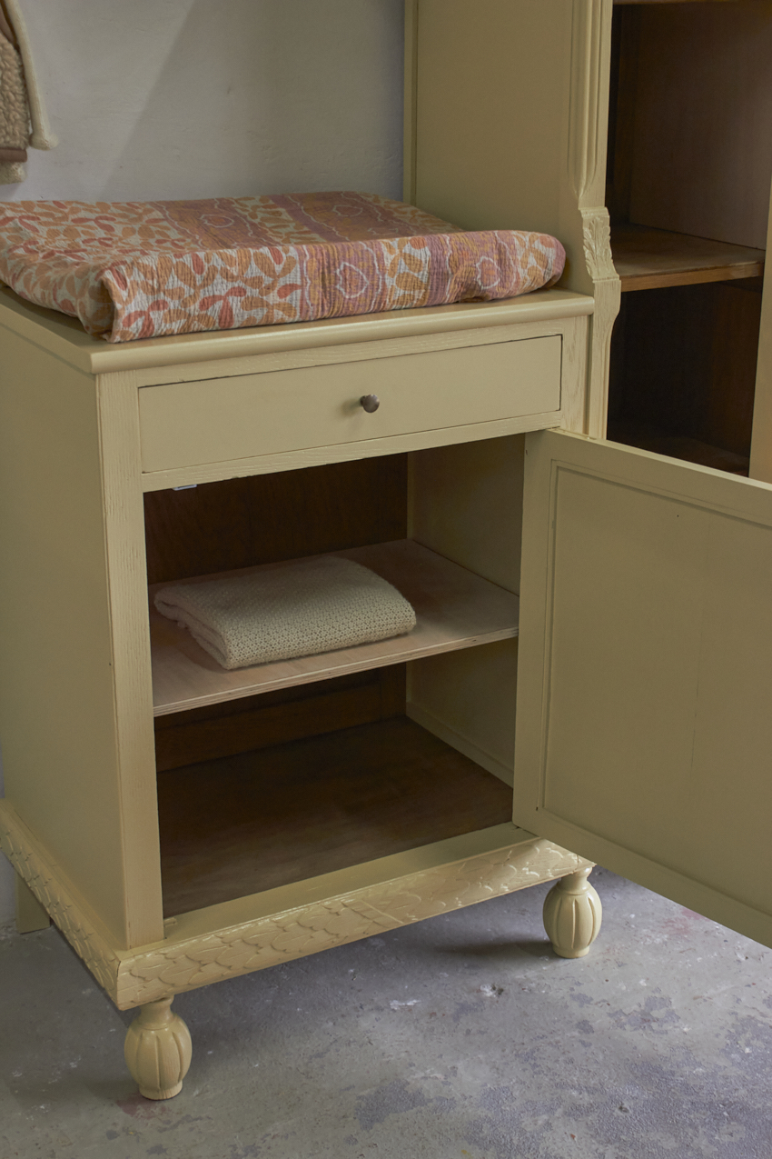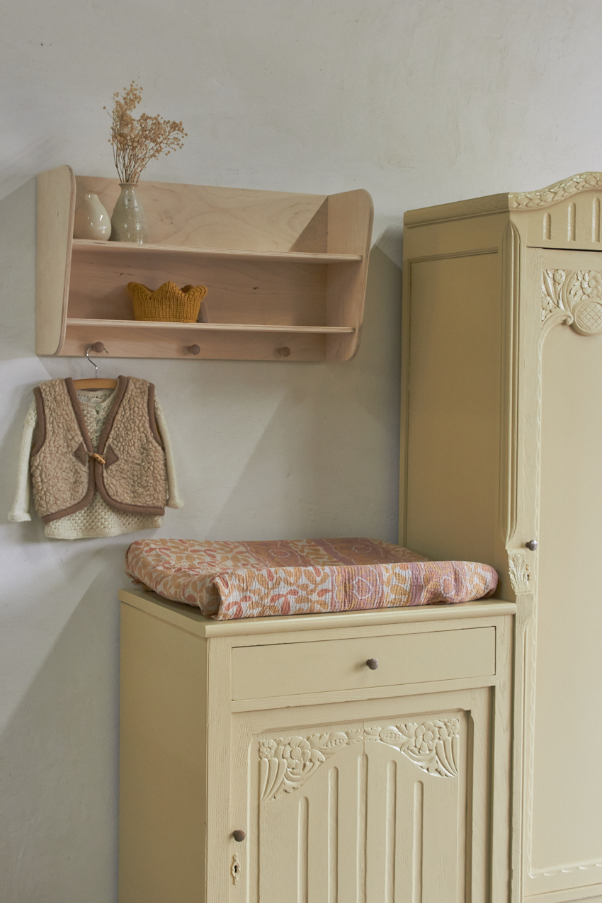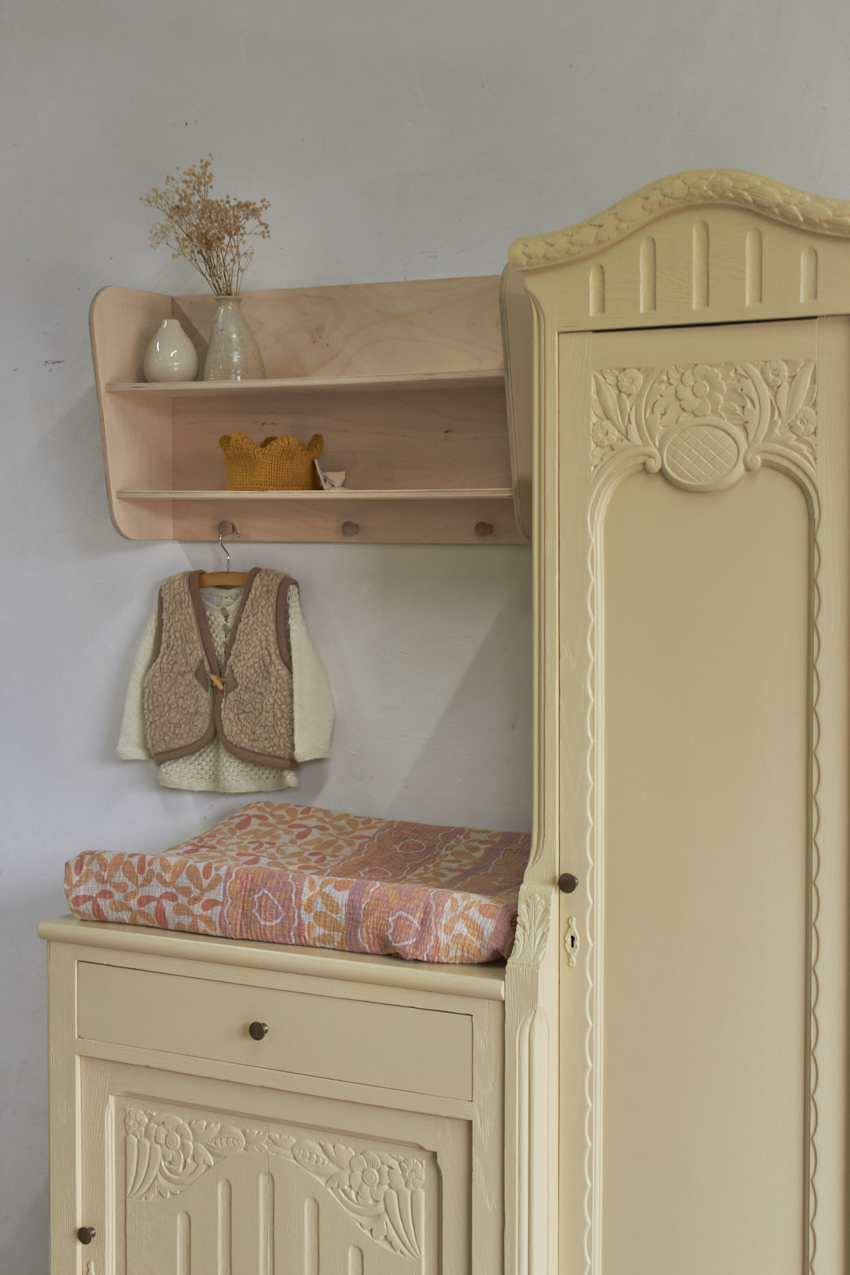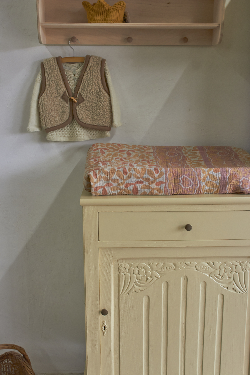 Wauw! Wat een plaatje dit! Een vintage commode in de kleur Kamille. Ze is zo mooi geworden en echt perfect om als commode te gebruiken. Lekker veel opbergruimte door de vele plankjes. Prachtig voor op een babykamer en als de commode niet meer in functie is kan ze vervolgens ergens anders in huis een plekje krijgen, want deze kast zou natuurlijk ook fantastisch staan in de woonkamer als dressoir of als speelgoed kast in de kinderkamer. Kortom, je kan er alle kanten mee op! Wij zijn er heel blij mee.