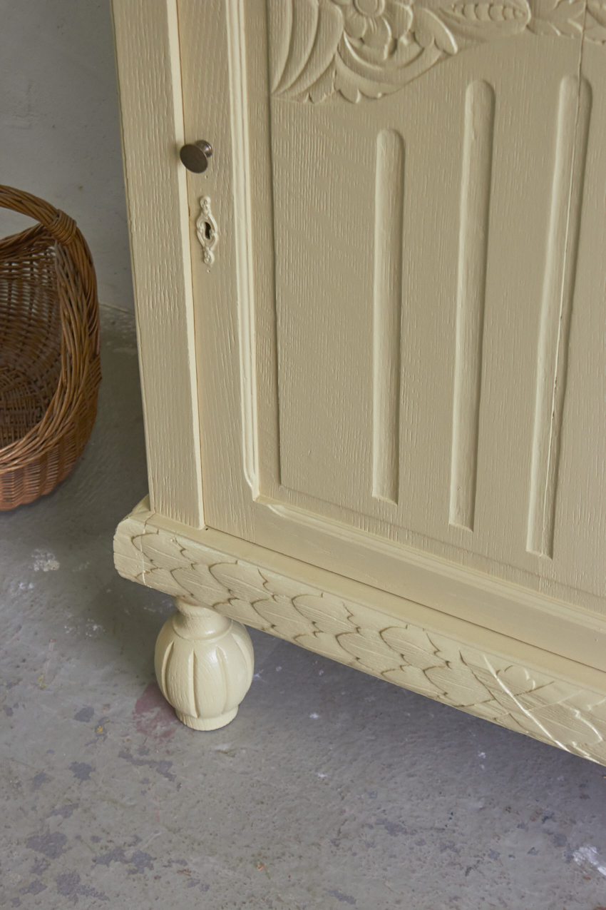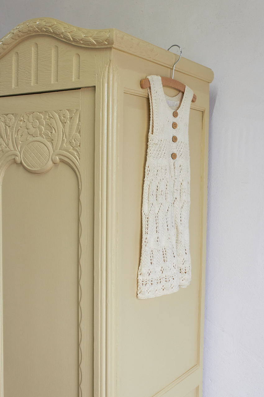 Dit meubel is eerst naar de meubel stralers gegaan, zij hebben alle oude lak verwijderd en wij hebben daarna de kast grondig schoongemaakt en behandeld met een anti-houtworm spray. Zo zijn we er zeker van, mocht er nog houtworm in zitten, dat deze niet meer leeft. Wel zo’n fijn idee! Ze heeft de nodige reparaties ondergaan. En vervolgens in onze mooie kleur Kamille geschilderd. De deurtjes sluiten met een magneetje. We hebben de kast afgewerkt met bronzen knopjes en nu is ze weer helemaal klaar voor een nieuwe plek! En ja dat lieve dekentje is ook te koop bij ons. Klik hier.