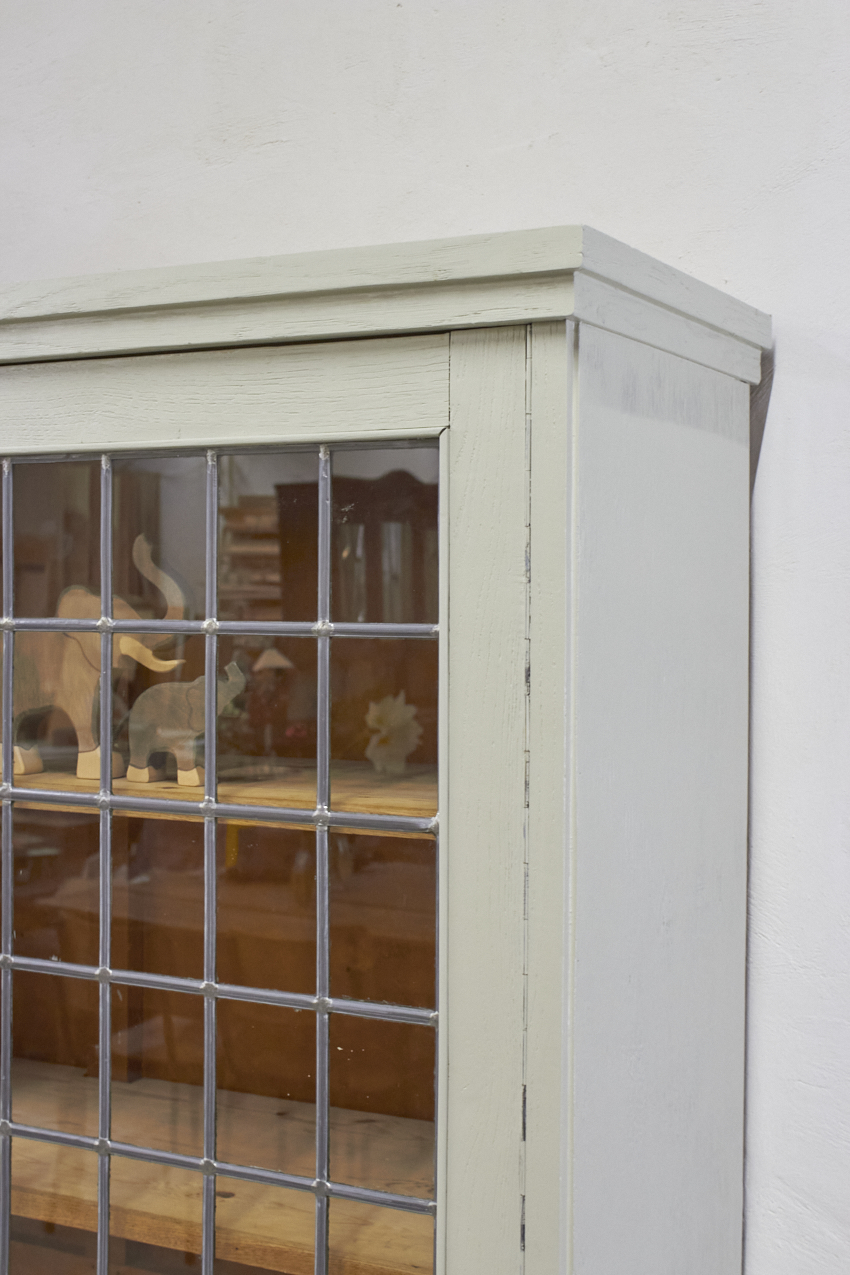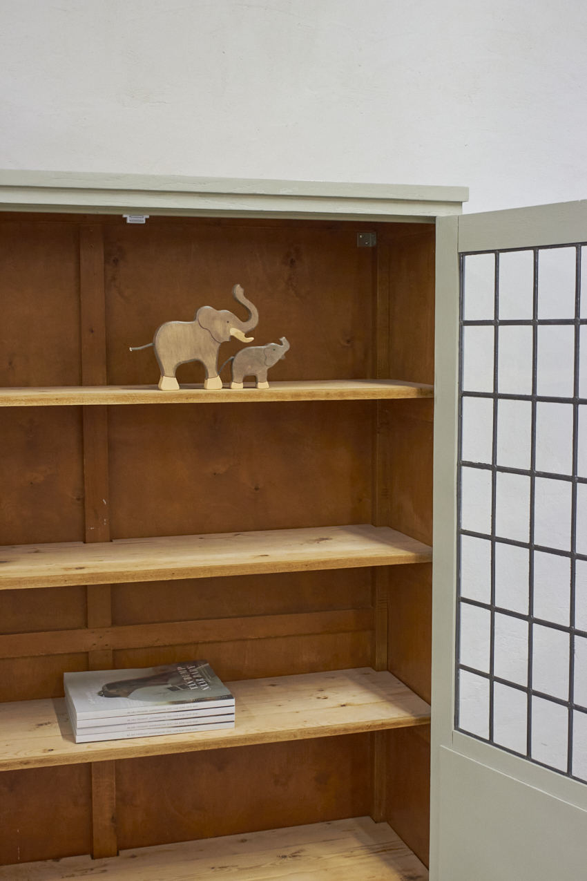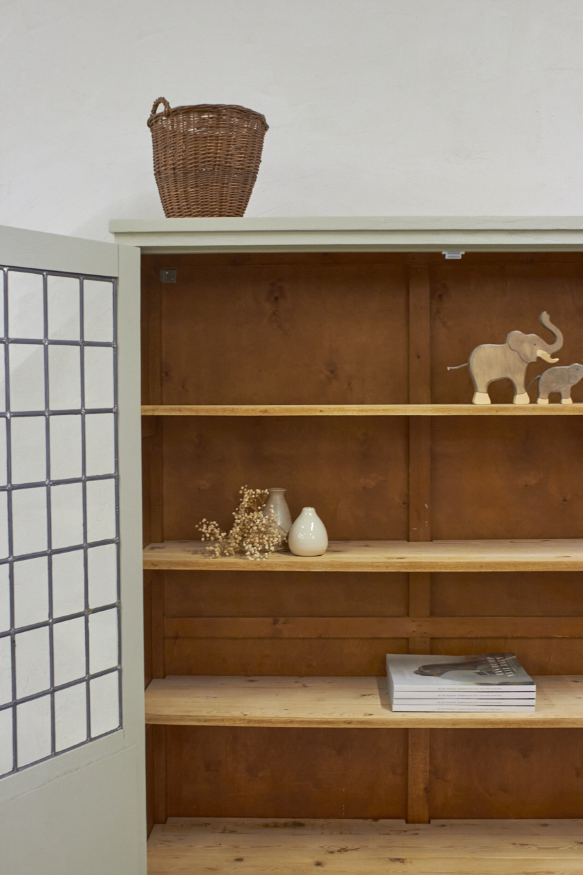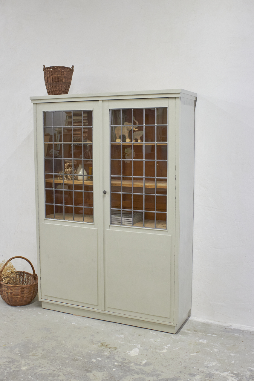 Wat een unieke vitrinekast is dit, met échte glas in lood ruitjes. Deze kast stond jaren in een Nederlands klooster. En toen kwam hij bij ons, zo leuk! De glas in lood ruitjes hebben we er voor het stralen natuurlijk voorzichtig uitgehaald, vervolgens is hij gestraald en kwam hij kaal bij ons terug. We hebben hem grondig schoongemaakt en behandeld tegen houtworm. De originele planken waren nog helemaal goed, alleen zat er een vettig laagje op wat we er volledig af hebben geschuurd, nu zijn ze weer als nieuw! We hebben een paar millimeter van de deurtjes afgezaagd, zodat deze gemakkelijk open en dicht gaan.