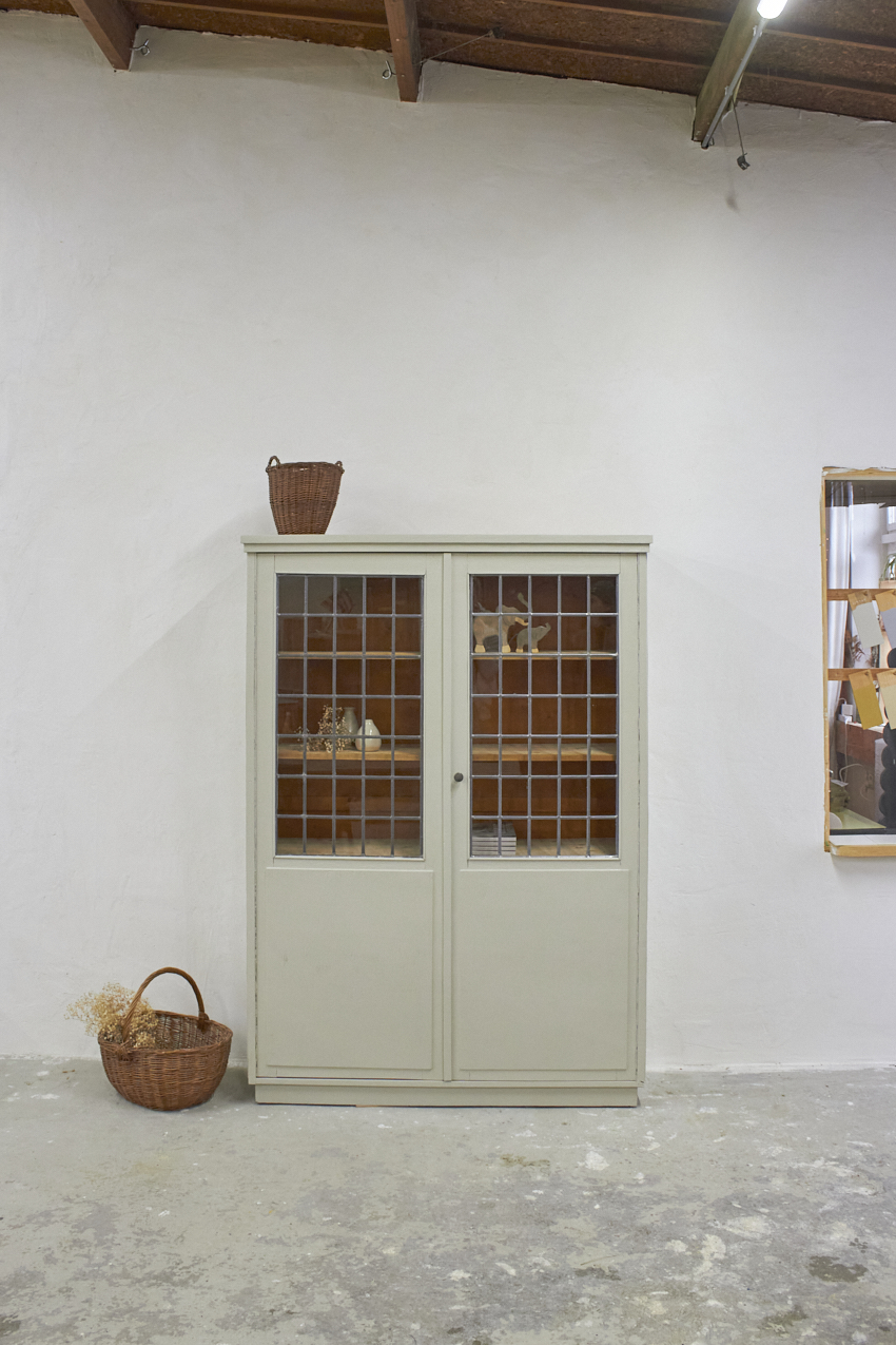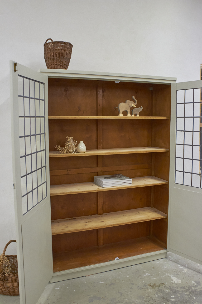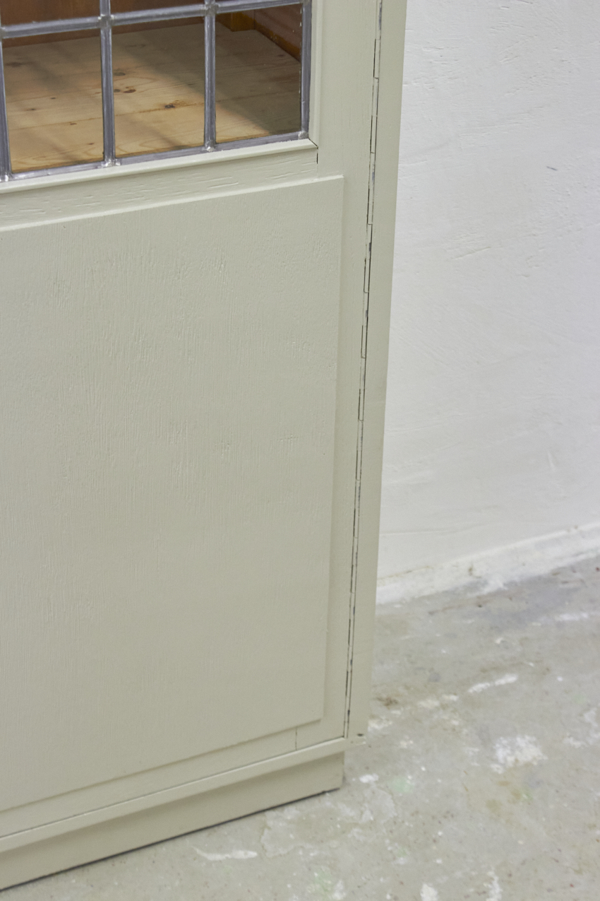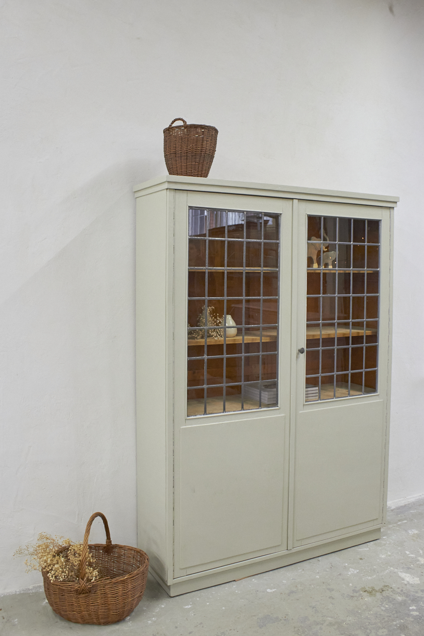 Wat een unieke vitrinekast is dit, met échte glas in lood ruitjes. Deze kast stond jaren in een Nederlands klooster. En toen kwam hij bij ons, zo leuk! De glas in lood ruitjes hebben we er voor het stralen natuurlijk voorzichtig uitgehaald, vervolgens is hij gestraald en kwam hij kaal bij ons terug. We hebben hem grondig schoongemaakt en behandeld tegen houtworm. De originele planken waren nog helemaal goed, alleen zat er een vettig laagje op wat we er volledig af hebben geschuurd, nu zijn ze weer als nieuw! We hebben een paar millimeter van de deurtjes afgezaagd, zodat deze gemakkelijk open en dicht gaan.