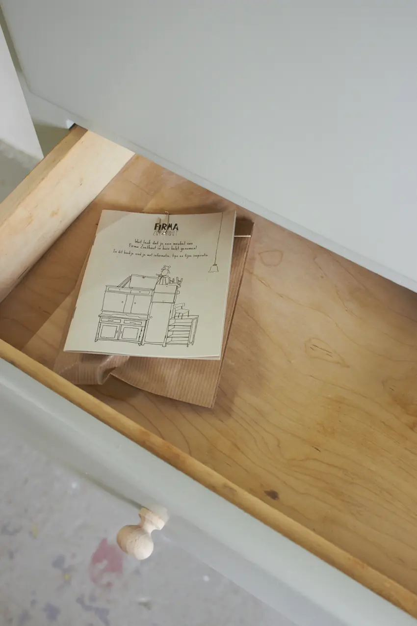 Deze leukerd heeft maar liefst vijf deurtjes, een klep en een lade, ideaal voor het opbergen van van alles en nog wat. De kast had wat liefde nodig, en die hebben we hem met veel plezier gegeven. Eerst hebben we de oude verflagen zorgvuldig afgeschuurd. Daarna hebben we de kast grondig schoongemaakt en behandeld met een anti-houtworm behandeling. Waar nodig hebben we reparaties uitgevoerd, zodat hij weer stevig en klaar voor gebruik is.