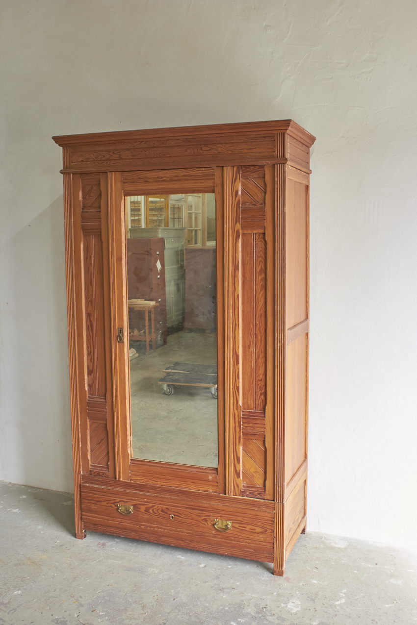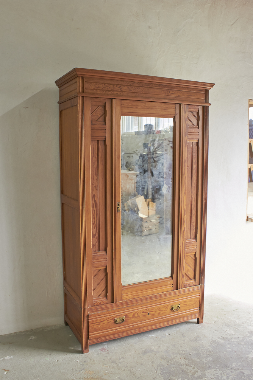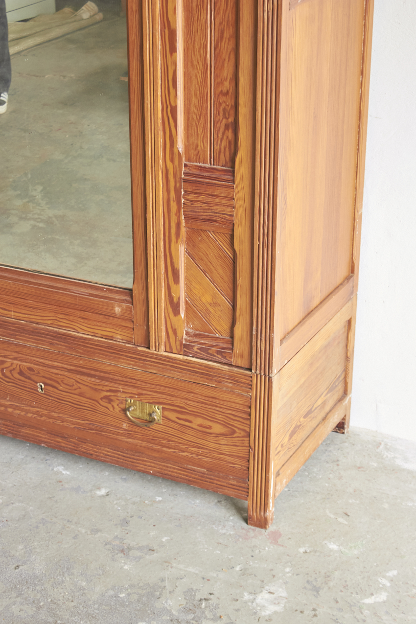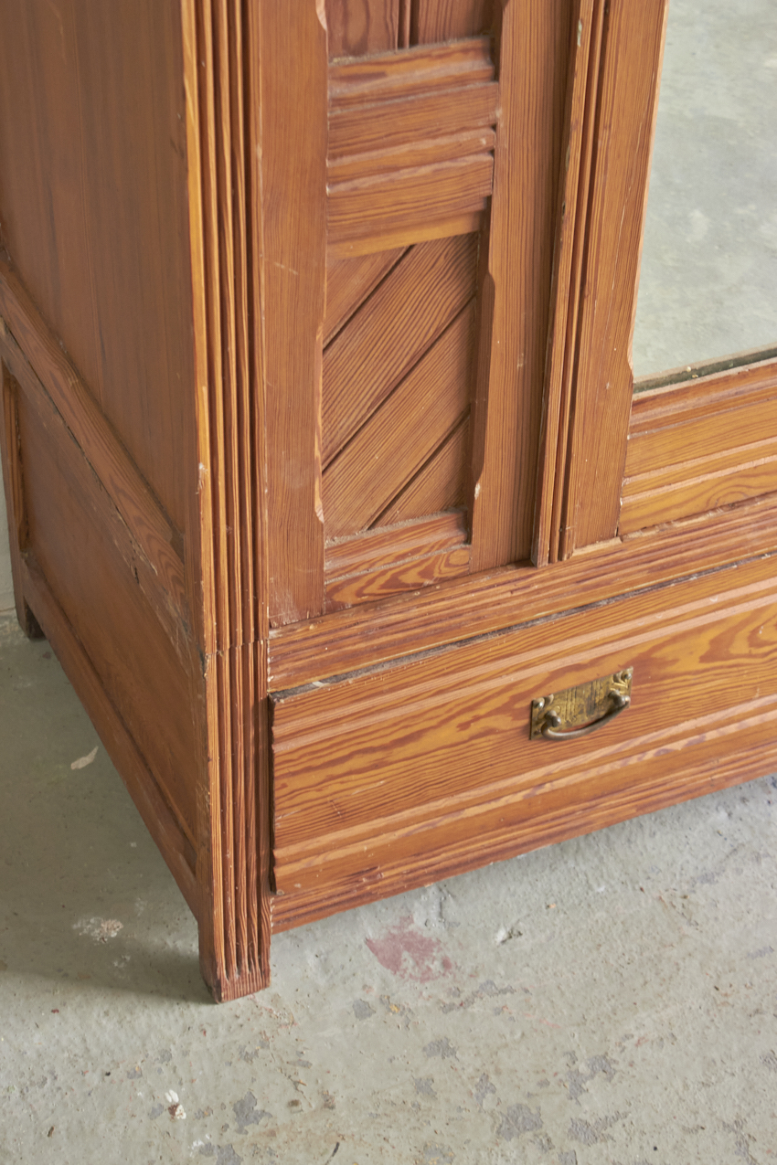 Een sierlijke demontabele spiegelkast met prachtig houtsnijwerk. En ook fijn demontabel. In overleg met jou kunnen we kijken of we de spiegel terugplaatsen of een paneeldeur er van maken. Met de twee lades in de bodem is dit een ideale kledingkast voor op de kinder- of slaapkamer die we met liefde voor jou willen opknappen.