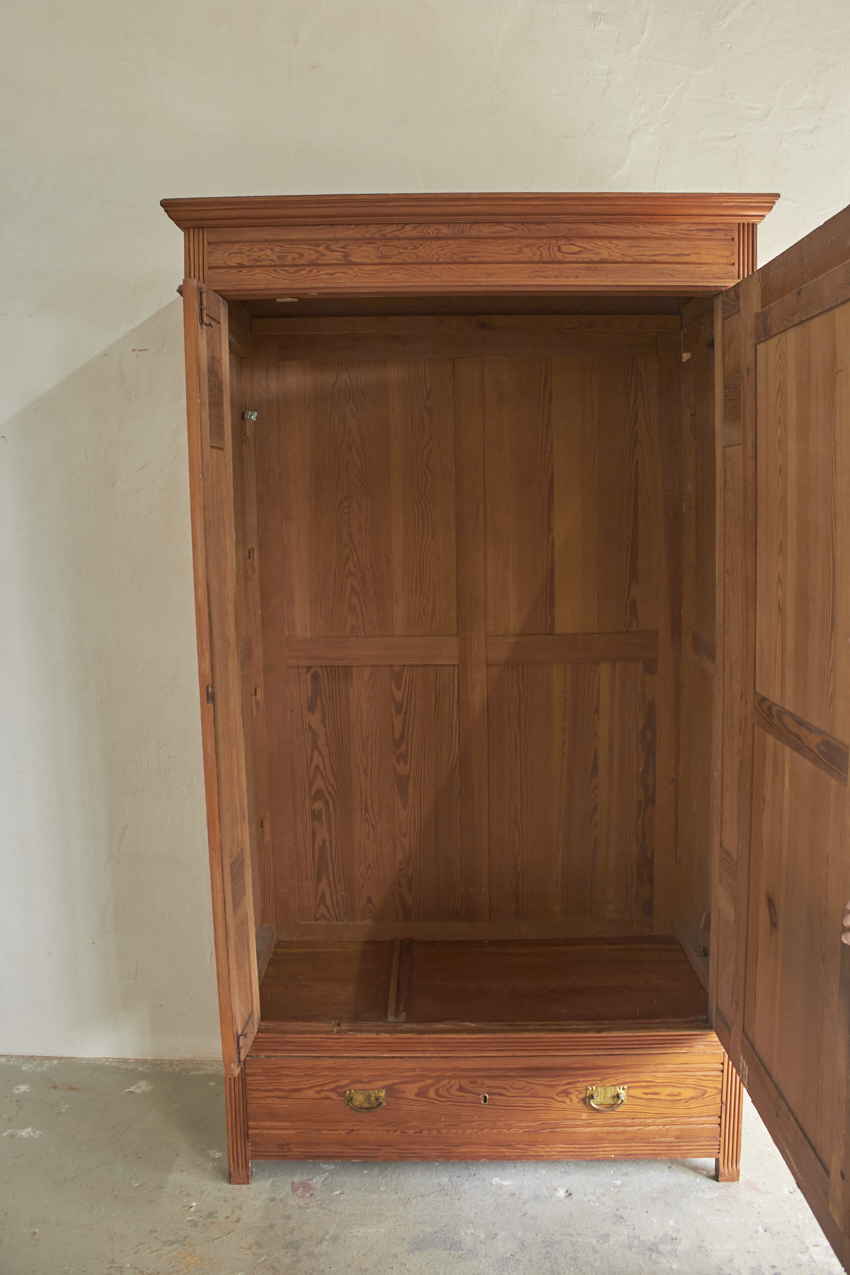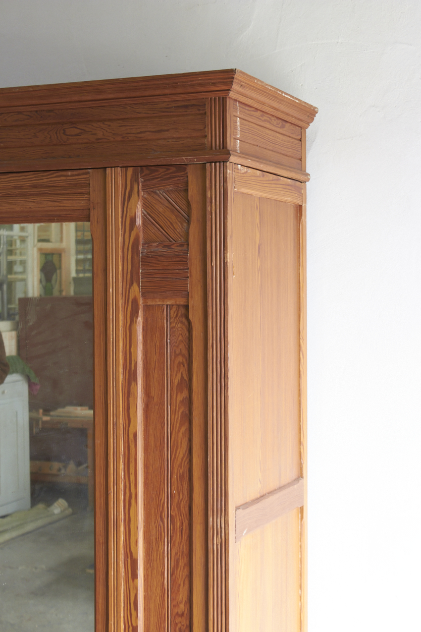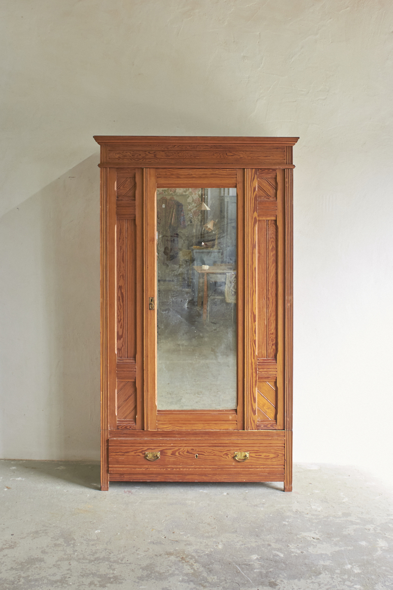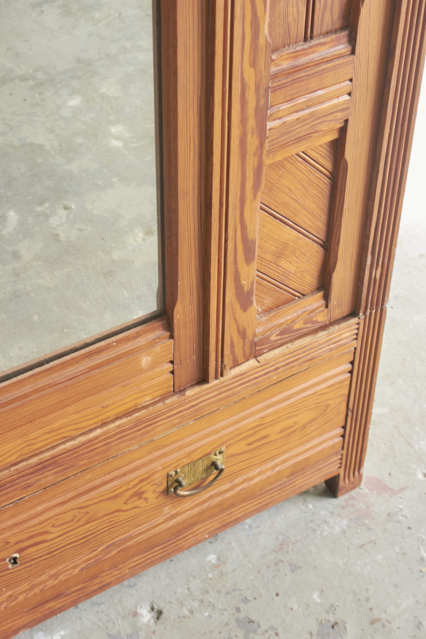 Een sierlijke demontabele spiegelkast met prachtig houtsnijwerk. En ook fijn demontabel. In overleg met jou kunnen we kijken of we de spiegel terugplaatsen of een paneeldeur er van maken. Met de twee lades in de bodem is dit een ideale kledingkast voor op de kinder- of slaapkamer die we met liefde voor jou willen opknappen.