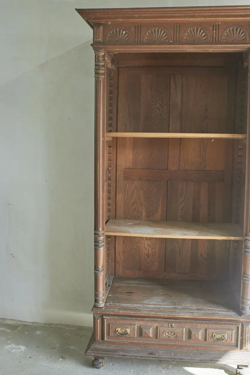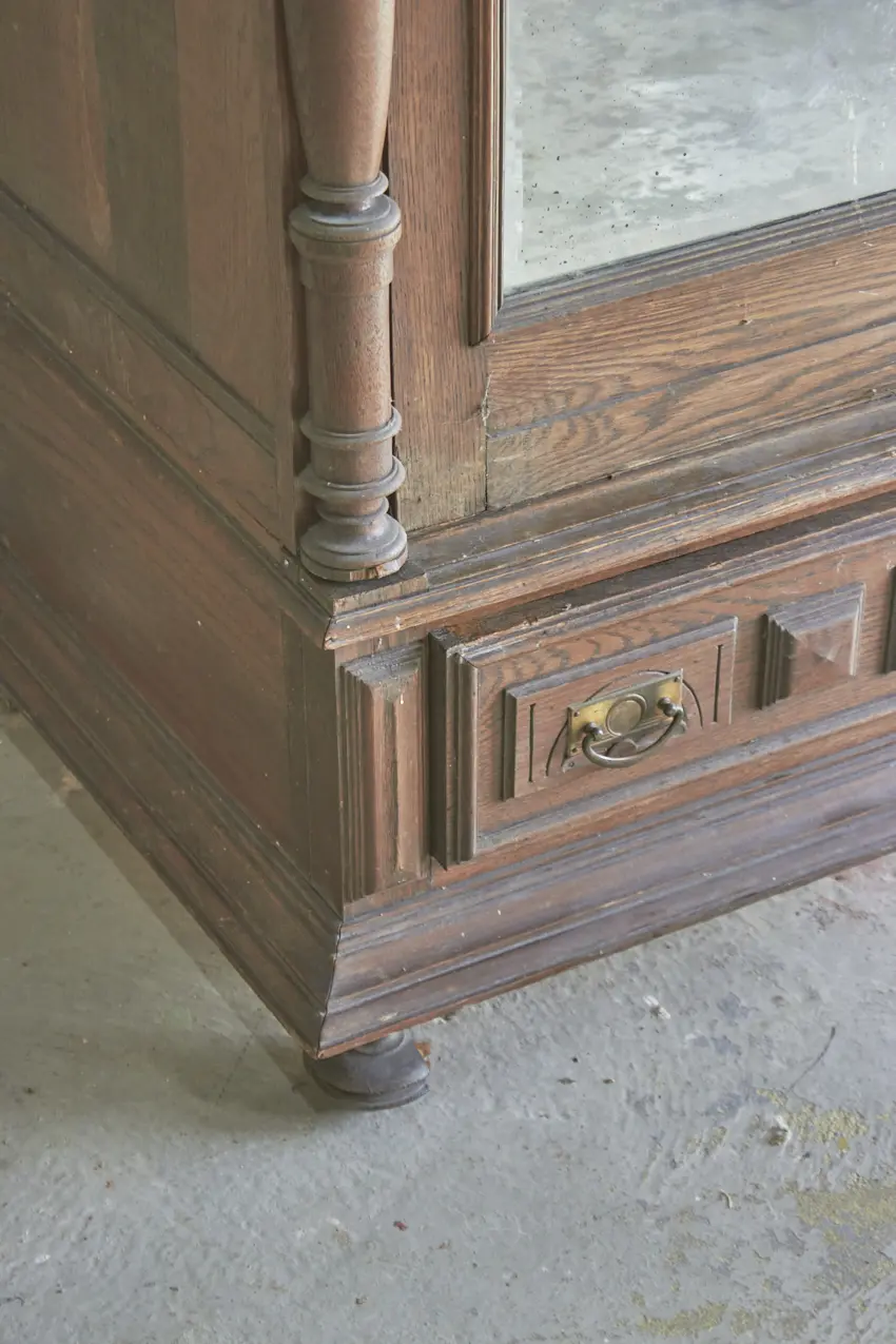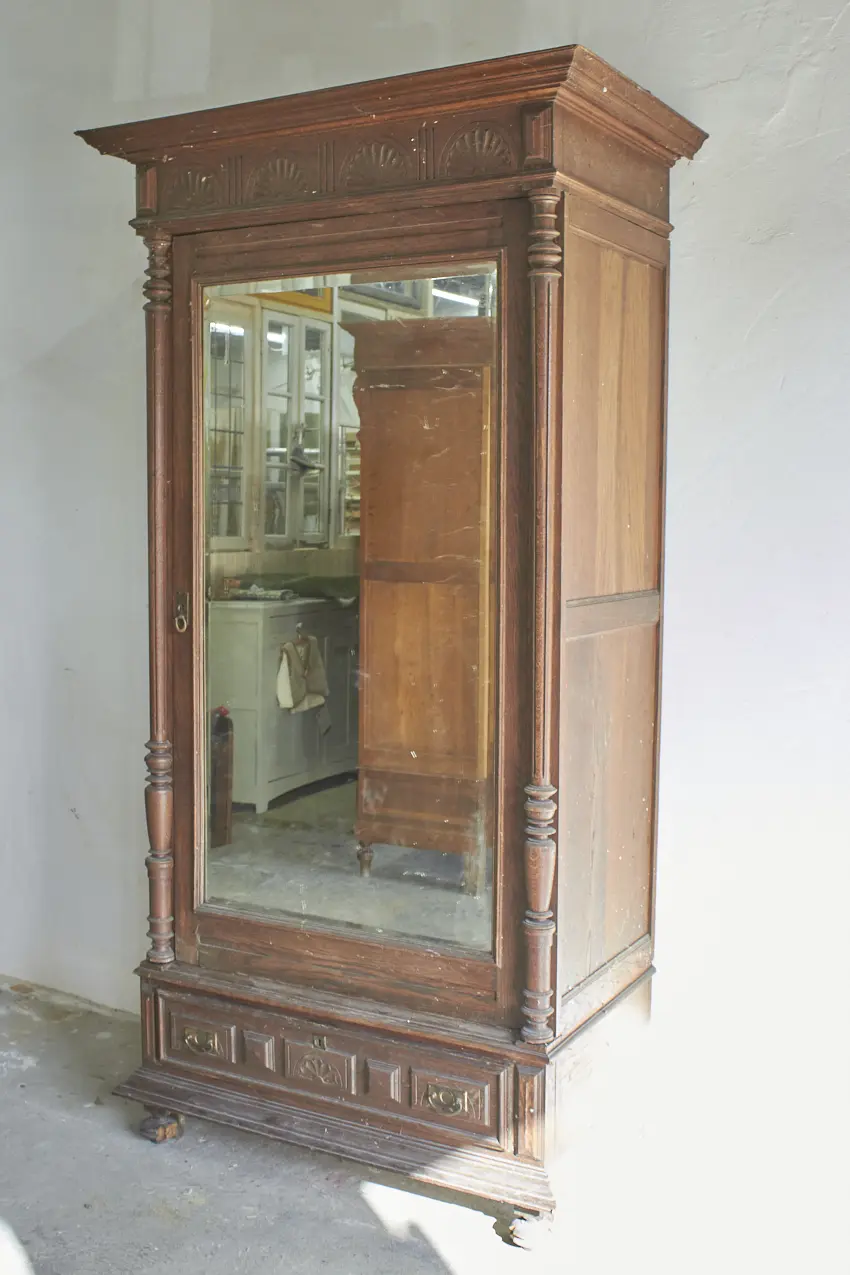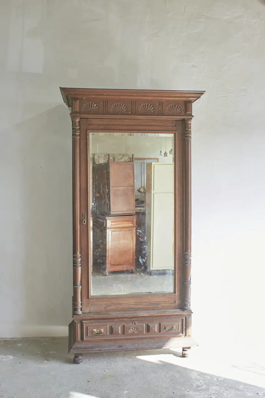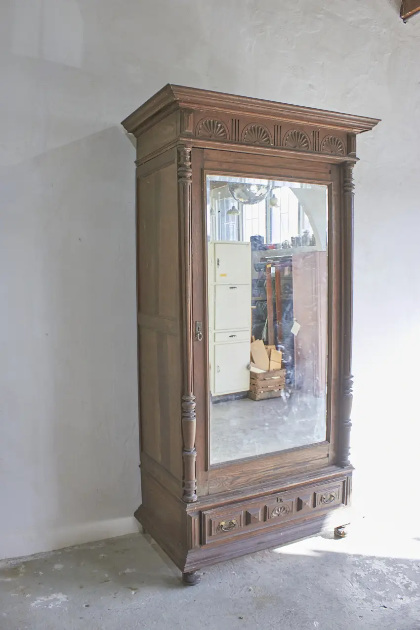 Wat een prachtig vintage meubel! Perfect voor op de slaapkamer voor kleding of voor in de hal voor jassen. Een fijn formaat dat overal in huis kan staan. We kunnen niet wachten om dit meubel op te knappen met jouw wensen. De spiegel kan eventueel vervangen worden voor een houten paneel.