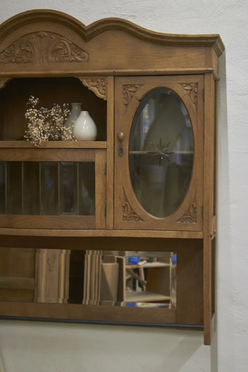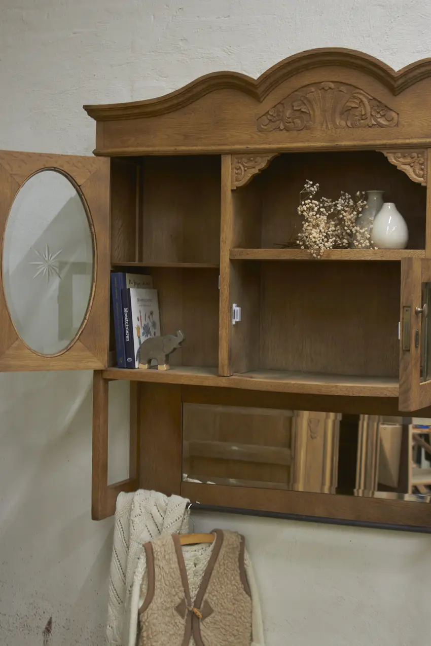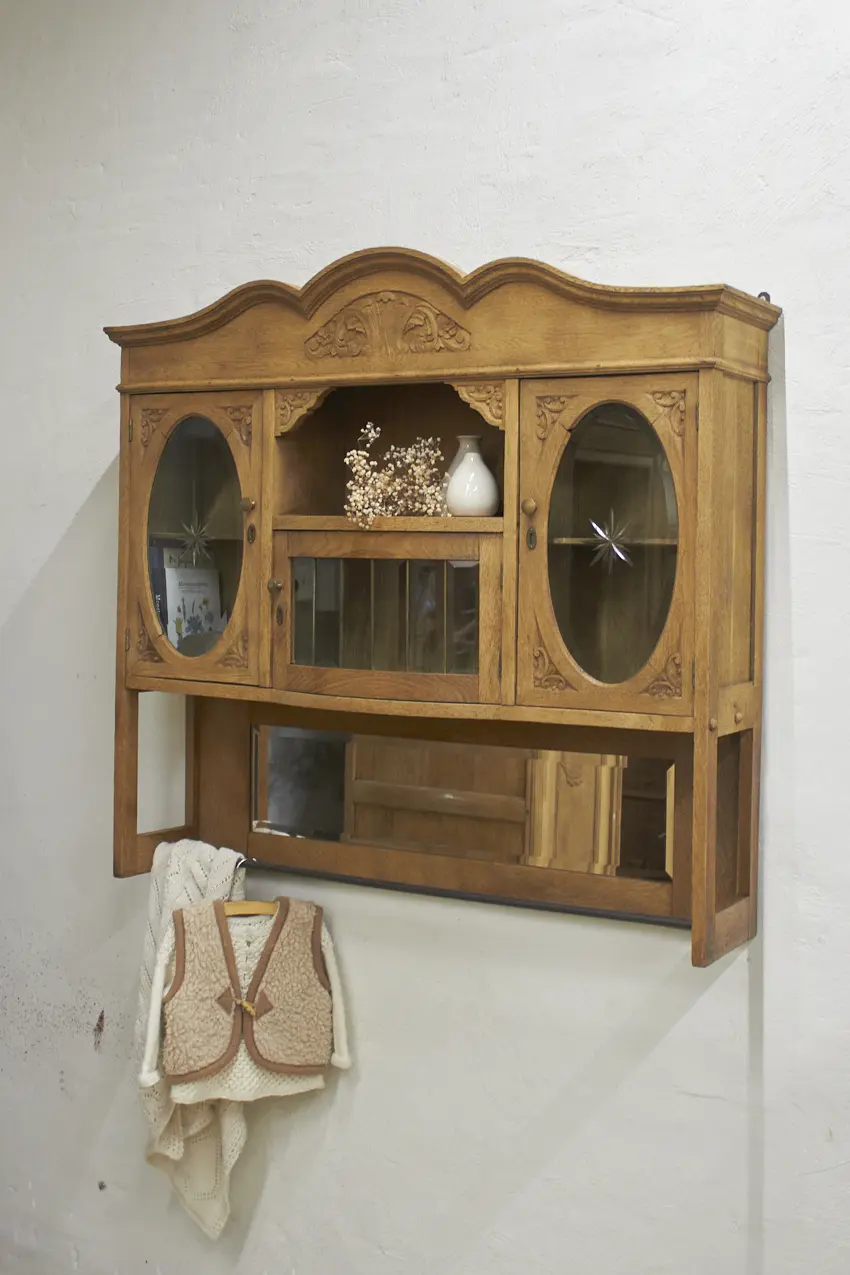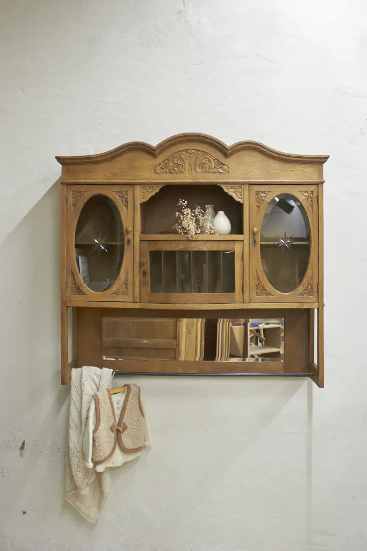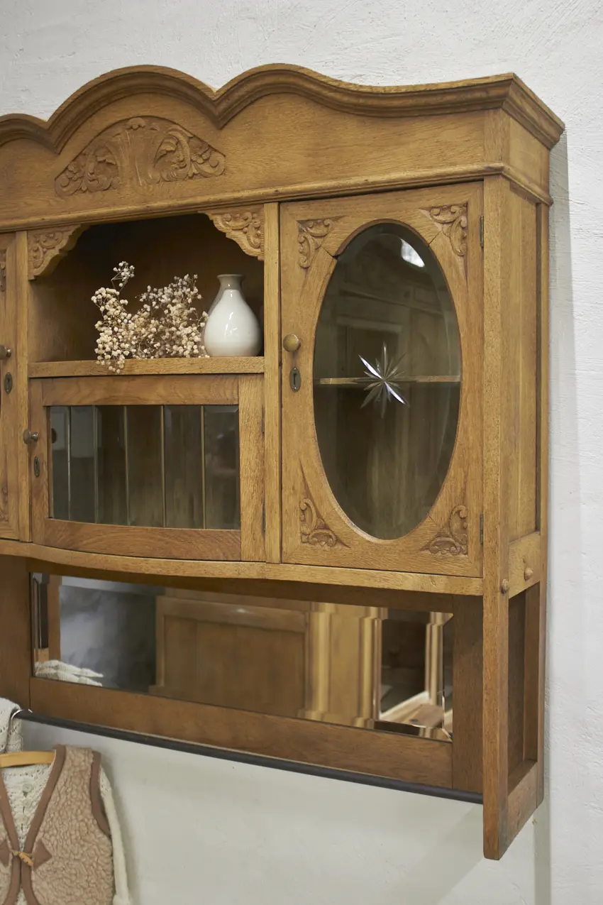 De prachtig geslepen, originele spiegel, en glas hebben we vóór het stralen zorgvuldig verwijderd. Daarna is de kast professioneel gestraald, grondig gereinigd en behandeld tegen houtworm. Alles is nagekeken en de deurtjes openen en sluiten weer soepel. Het resultaat? Een karaktervolle, unieke hangkast met een verhaal, helemaal klaar voor gebruik!