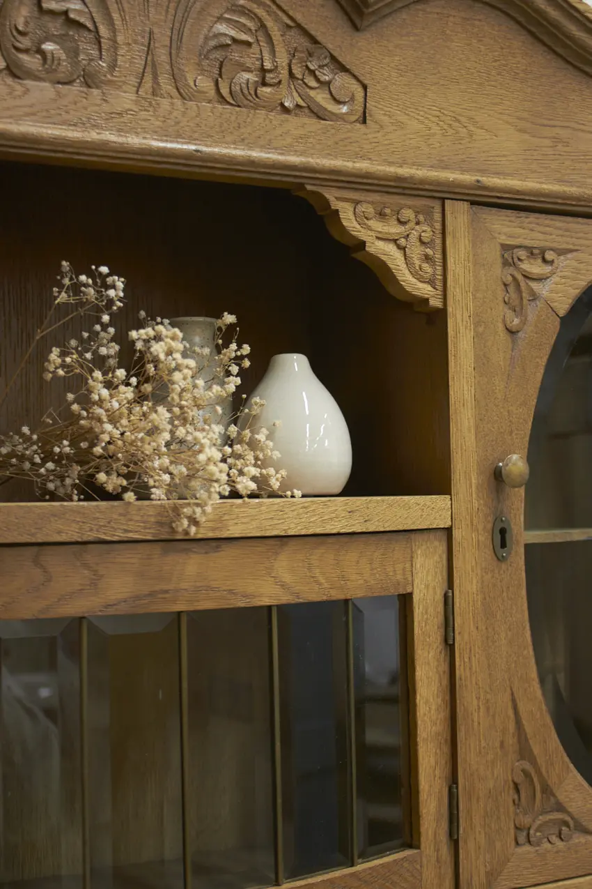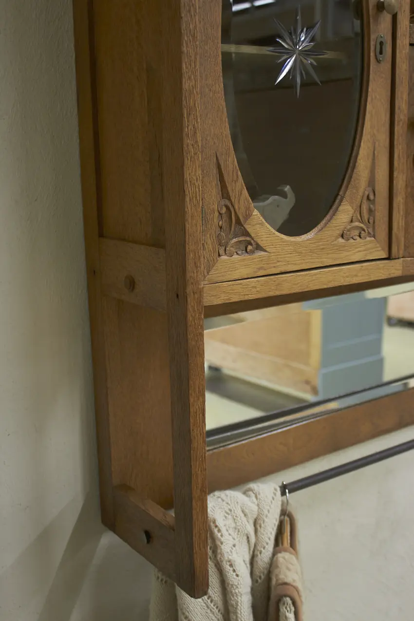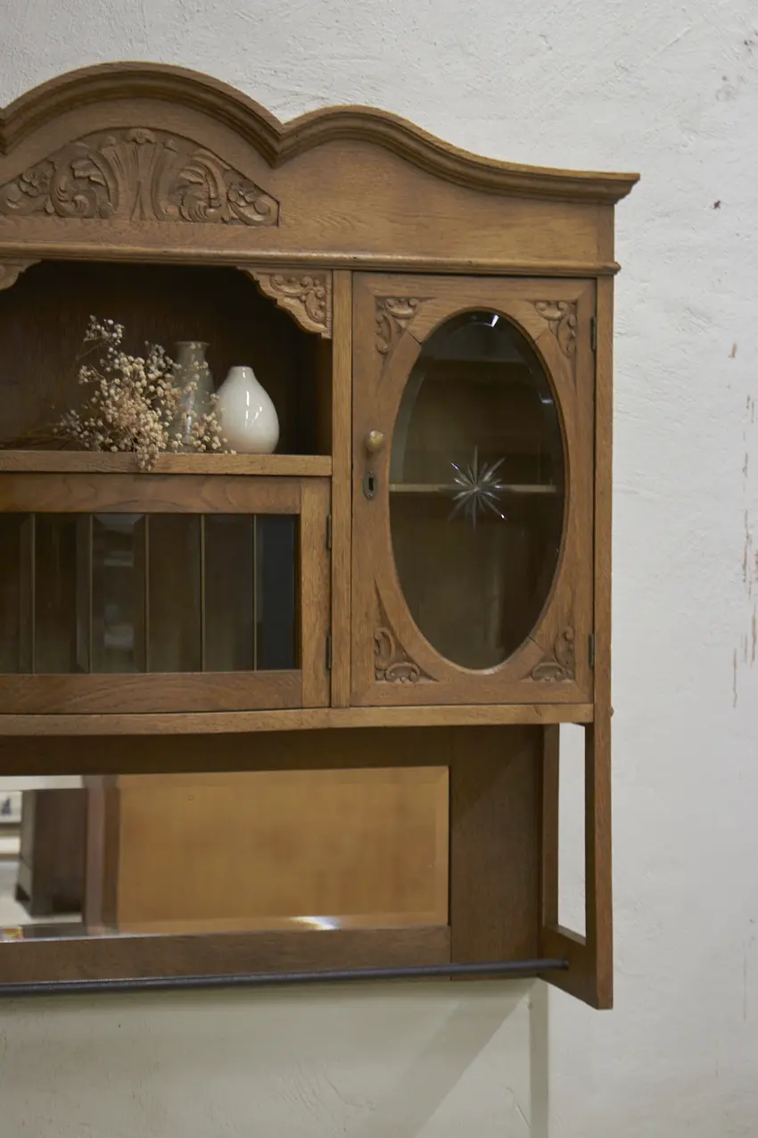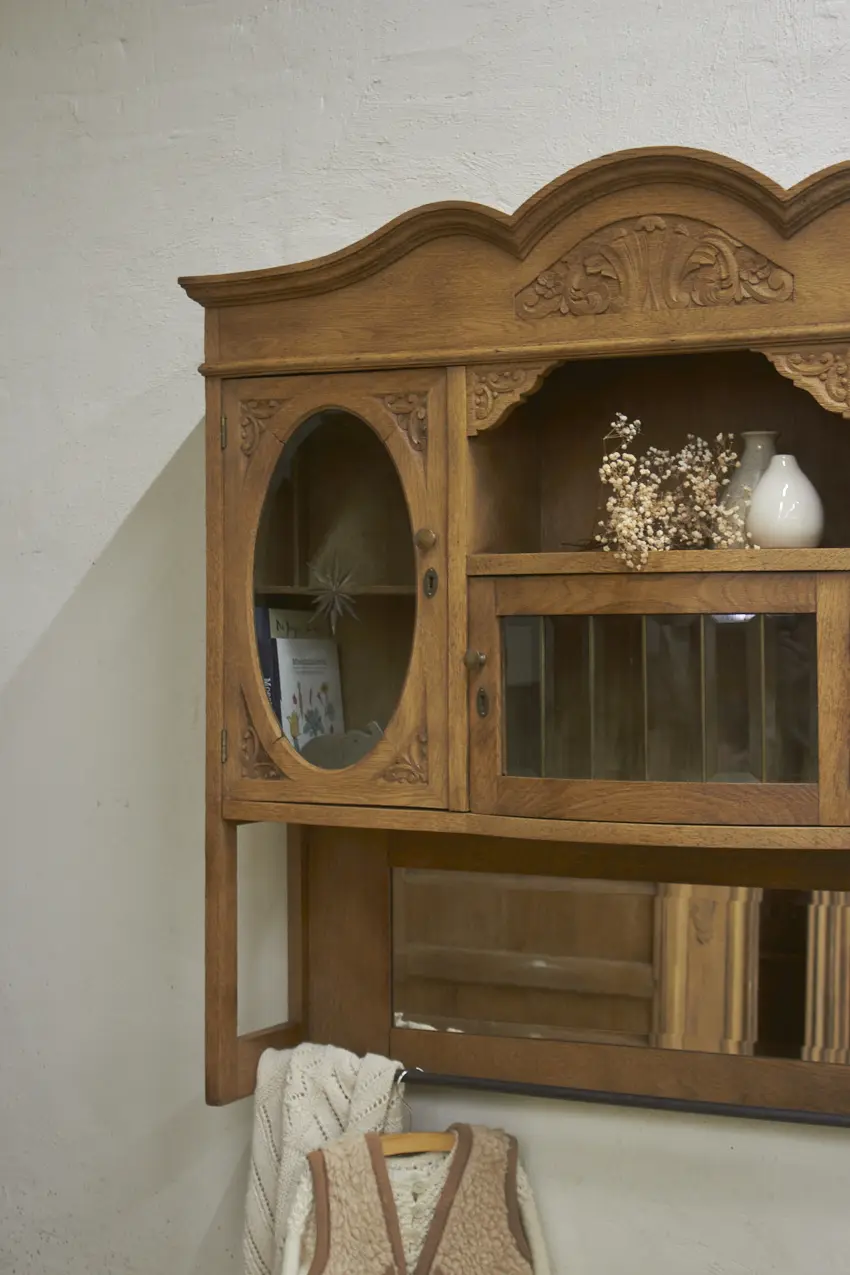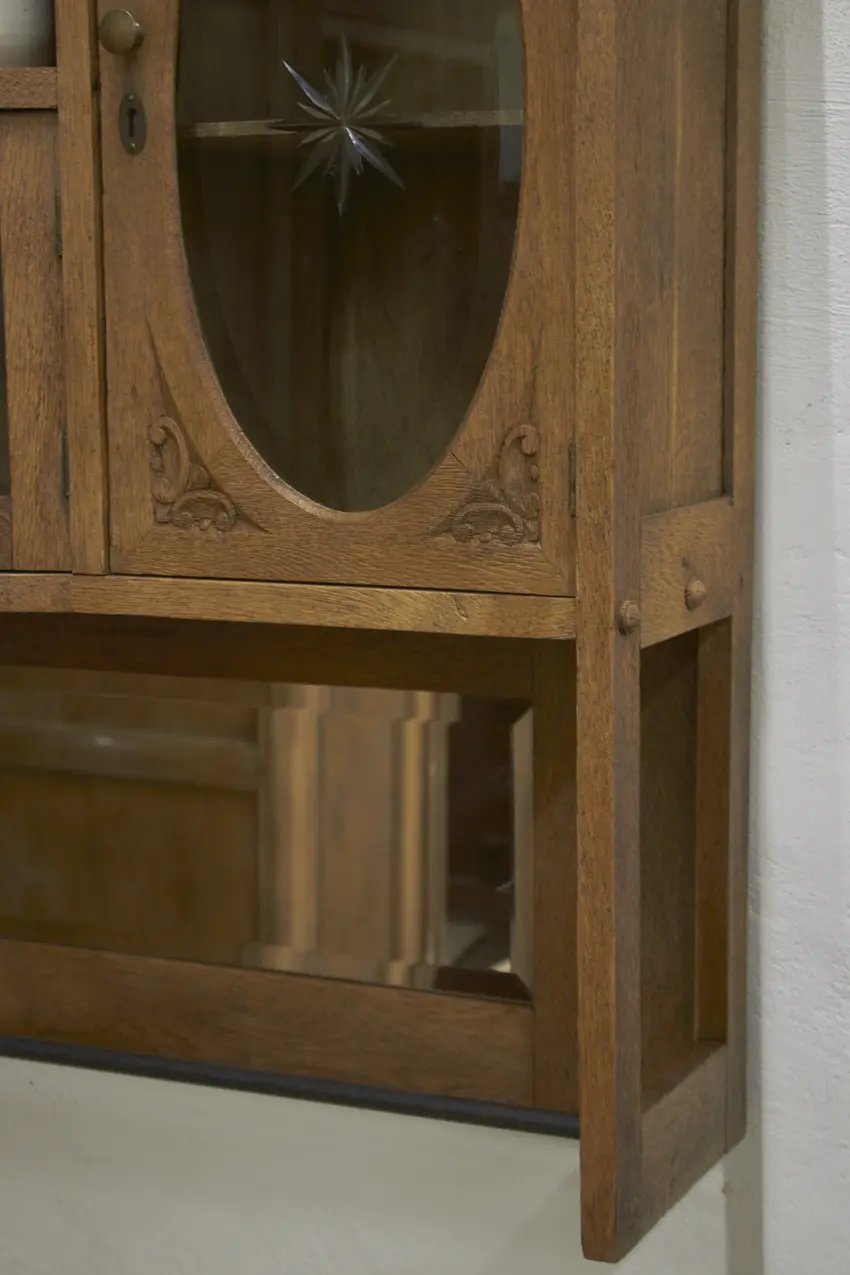 De prachtig geslepen, originele spiegel, en glas hebben we vóór het stralen zorgvuldig verwijderd. Daarna is de kast professioneel gestraald, grondig gereinigd en behandeld tegen houtworm. Alles is nagekeken en de deurtjes openen en sluiten weer soepel. Het resultaat? Een karaktervolle, unieke hangkast met een verhaal, helemaal klaar voor gebruik!
