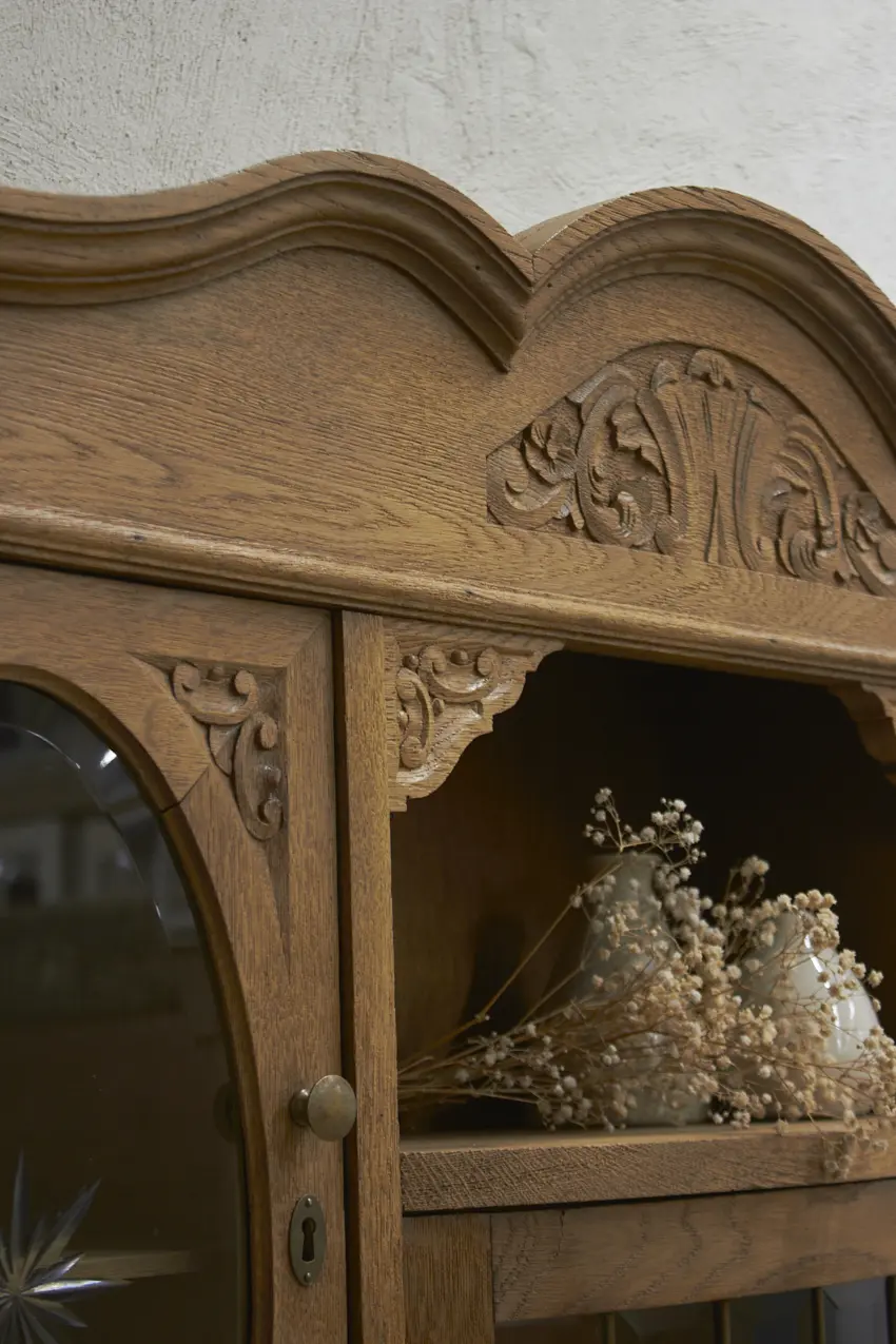 Wauw… wat een prachtige vintage hangkast! Deze unieke kast was ooit de bovenkant van een buffetkast en is door ons omgetoverd tot een stijlvolle hangkast. Uitgevoerd in haar originele houtkleur en volledig klaar voor een nieuw thuis.