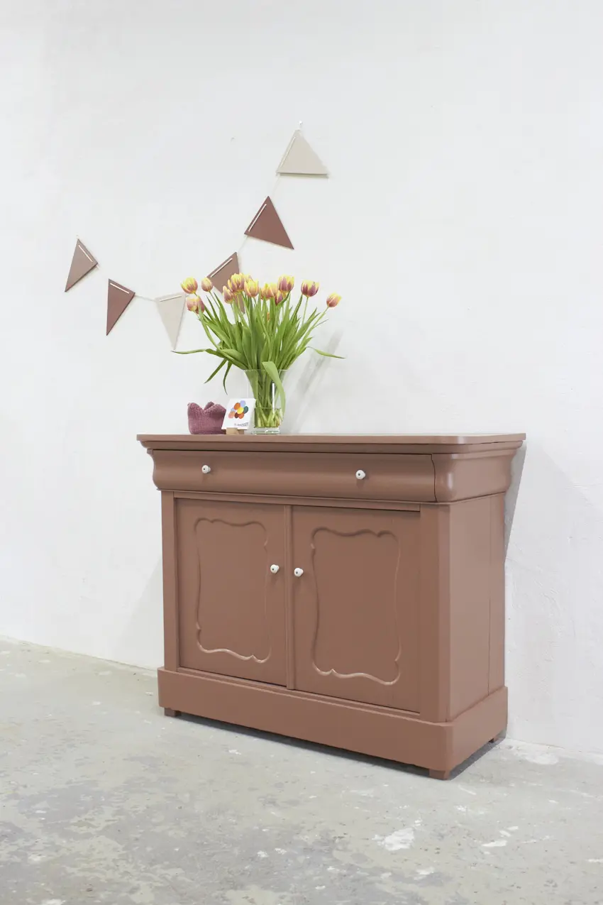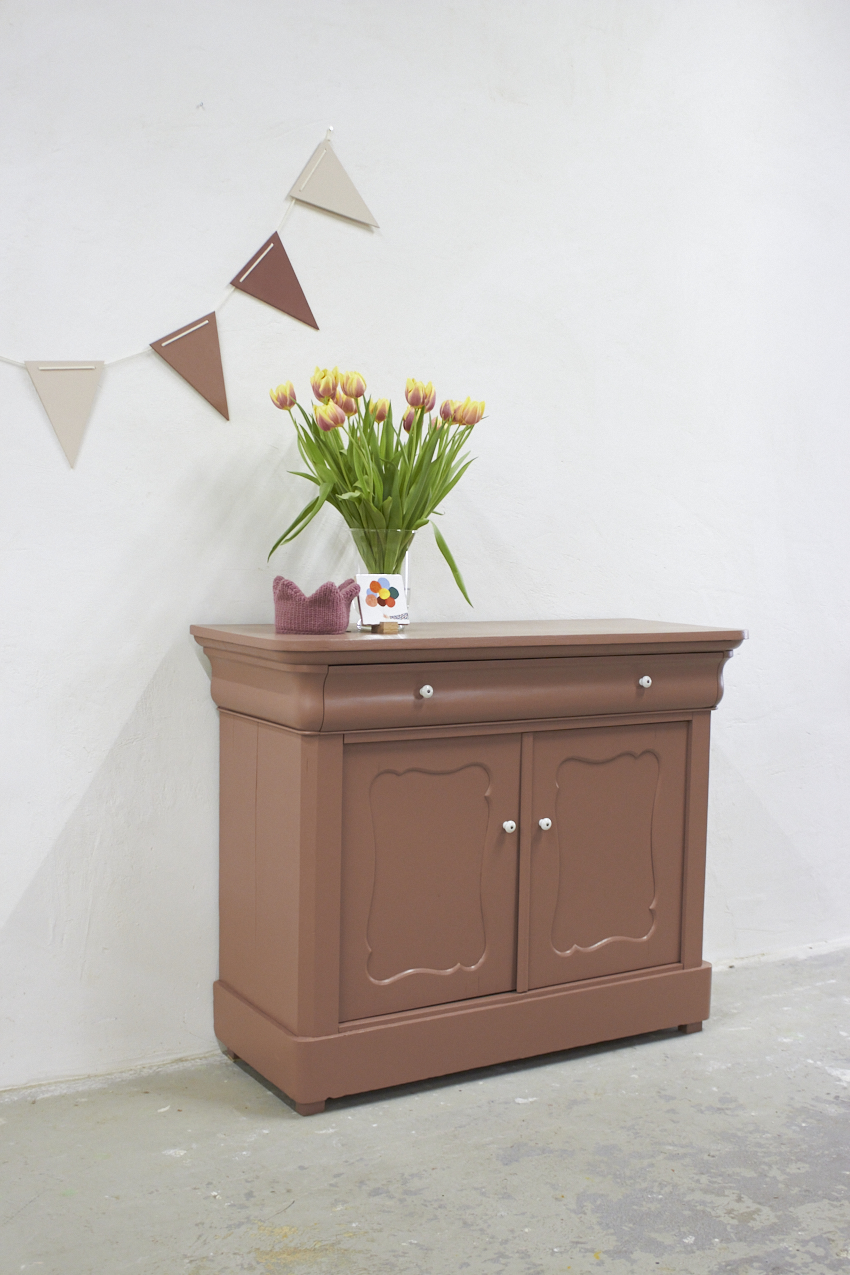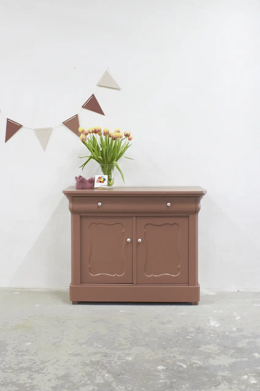 Dit meubel hebben we gevonden in België en is daarna naar de meubelstraler gegaan, waar alle oude laklagen volledig zijn verwijderd. Vervolgens hebben we de kast grondig schoongemaakt en behandeld met een anti-houtwormspray. Zo weten we zeker dat eventueel aanwezige houtworm geen kans meer heeft, wel zo’n fijn idee. De deurtjes sluiten perfect dankzij een magneetsluiting en de porseleinen knopjes maken het geheel helemaal af. De kast is nu helemaal klaar voor een nieuwe plek en een nieuw verhaal.