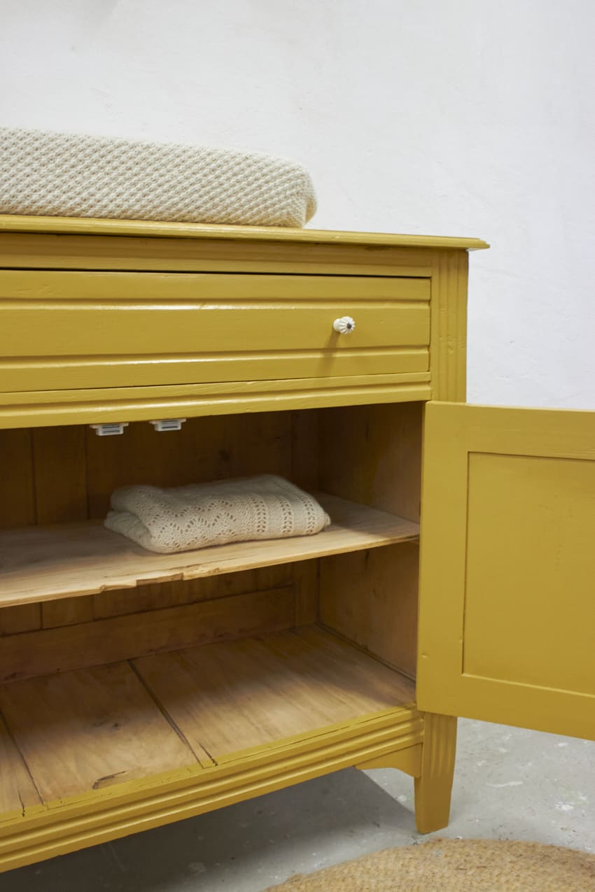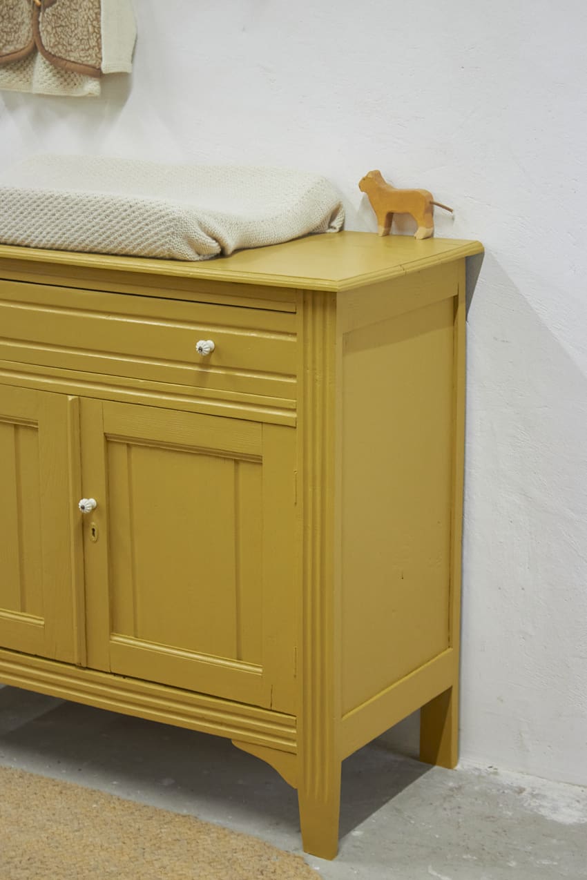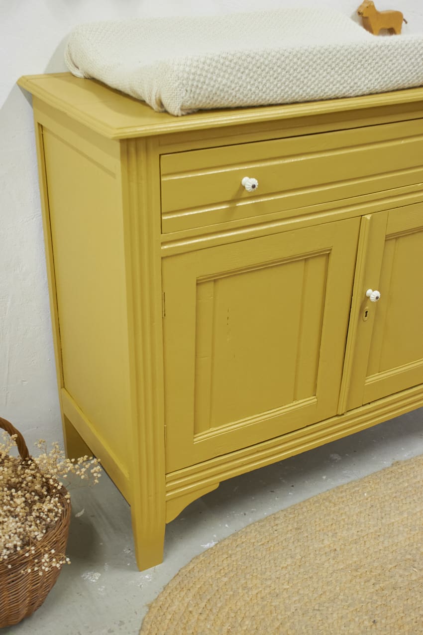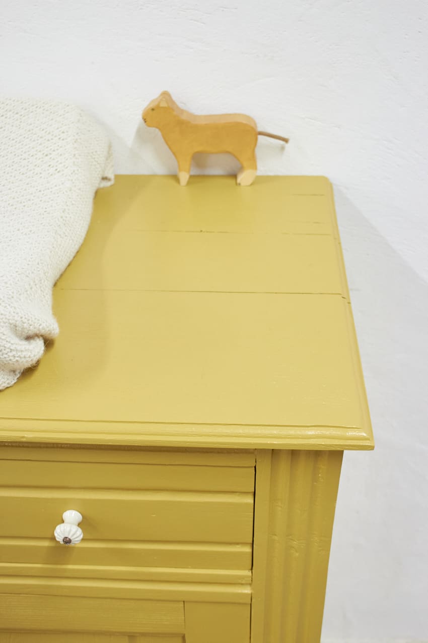 Een vintage commode in onze kleur Saffraan. Ze is zó mooi geworden en heeft nu de perfecte hoogte en diepte om eerst als commode te gebruiken. Wanneer de commode deze functie niet meer heeft, kan ze eenvoudig ergens anders in huis een mooie plek krijgen. Deze kast zou bijvoorbeeld ook fantastisch staan in de woonkamer als dressoir, of als speelgoedkastje in de kinderkamer. Wij zijn er ontzettend blij mee.