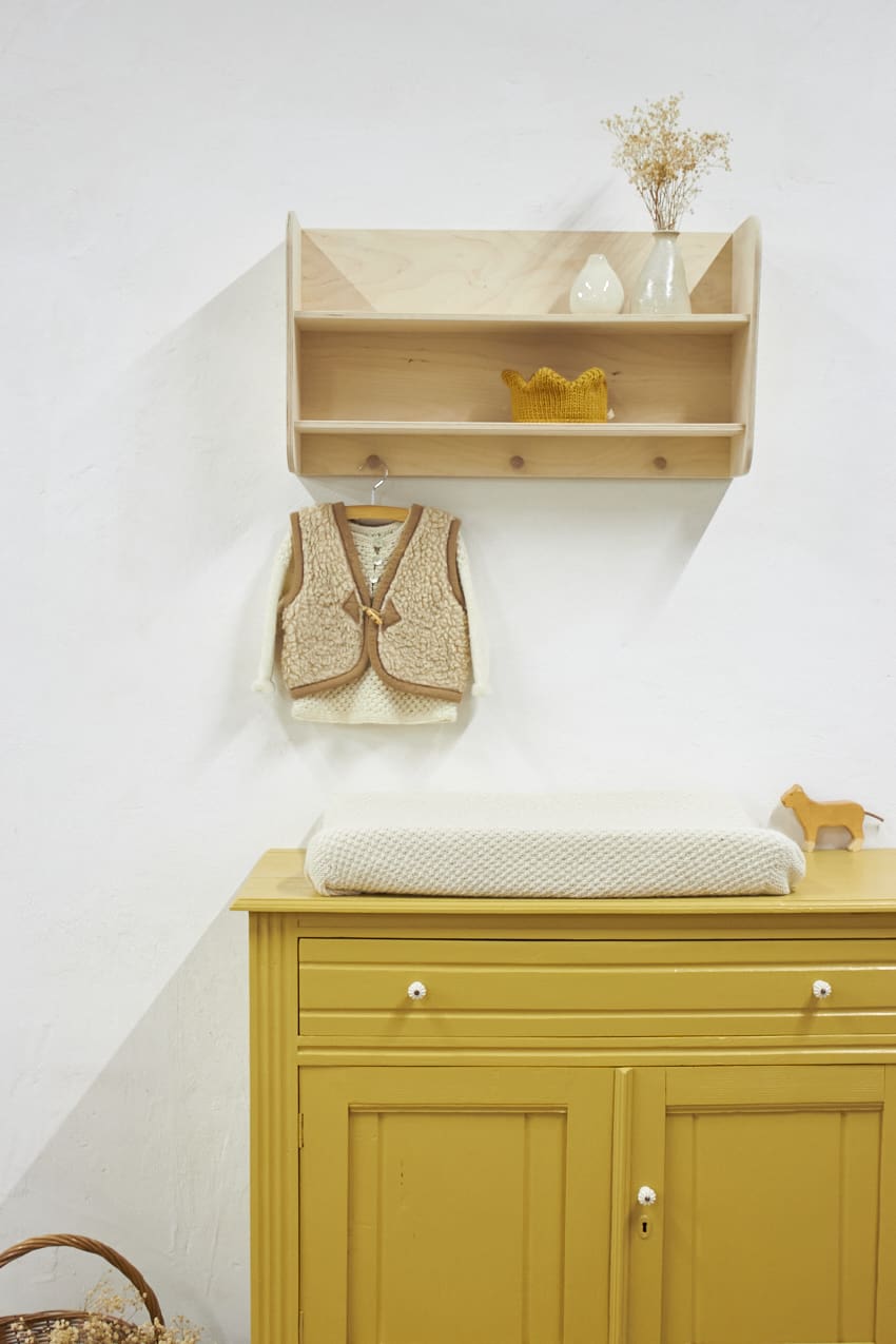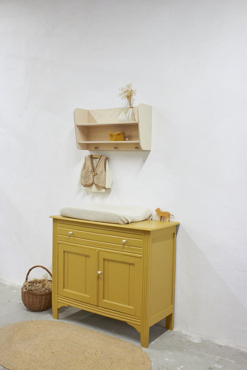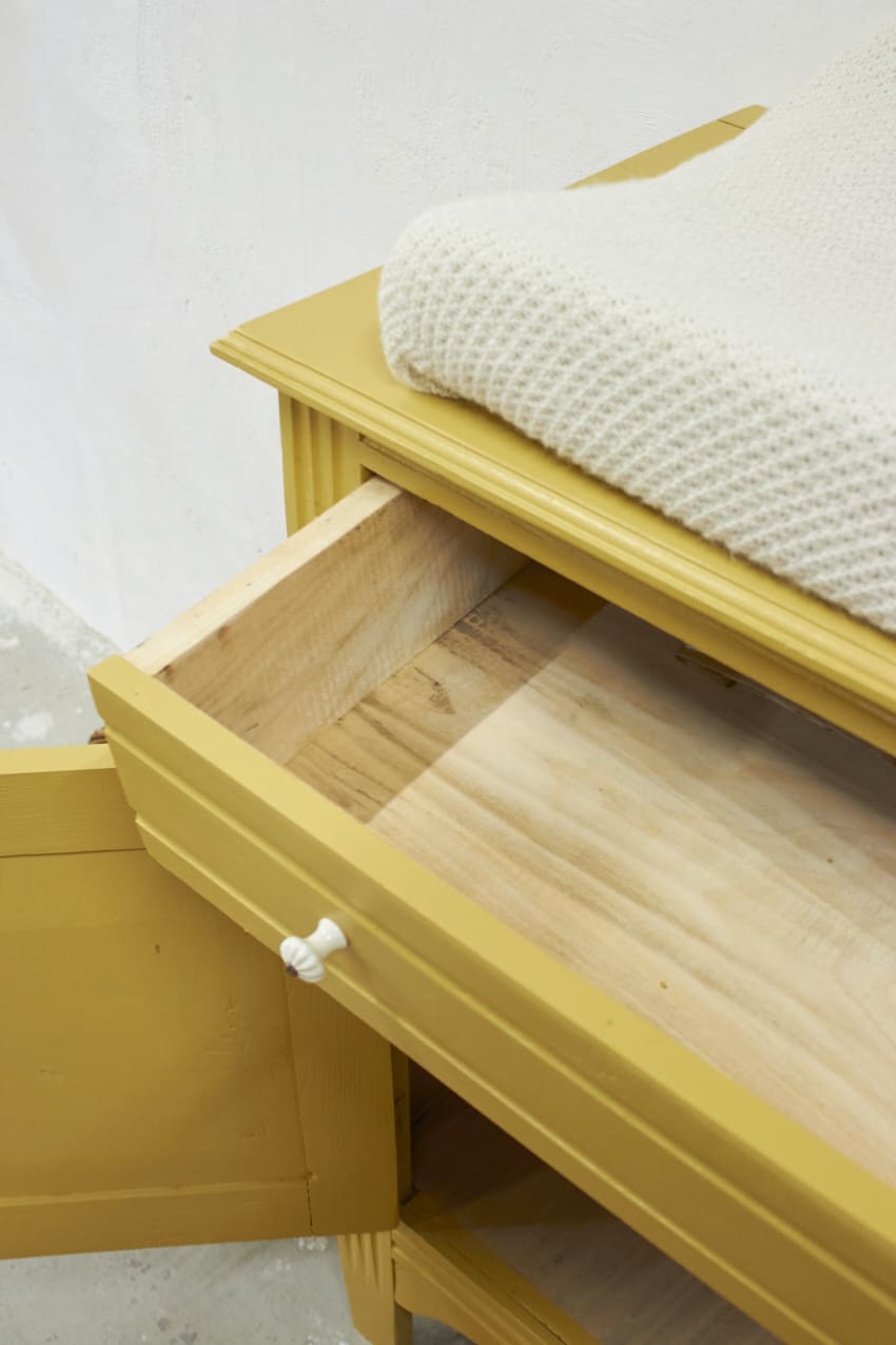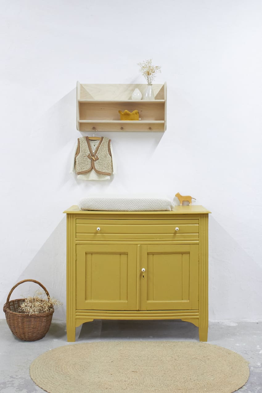 Een vintage commode in onze kleur Saffraan. Ze is zó mooi geworden en heeft nu de perfecte hoogte en diepte om eerst als commode te gebruiken. Wanneer de commode deze functie niet meer heeft, kan ze eenvoudig ergens anders in huis een mooie plek krijgen. Deze kast zou bijvoorbeeld ook fantastisch staan in de woonkamer als dressoir, of als speelgoedkastje in de kinderkamer. Wij zijn er ontzettend blij mee.