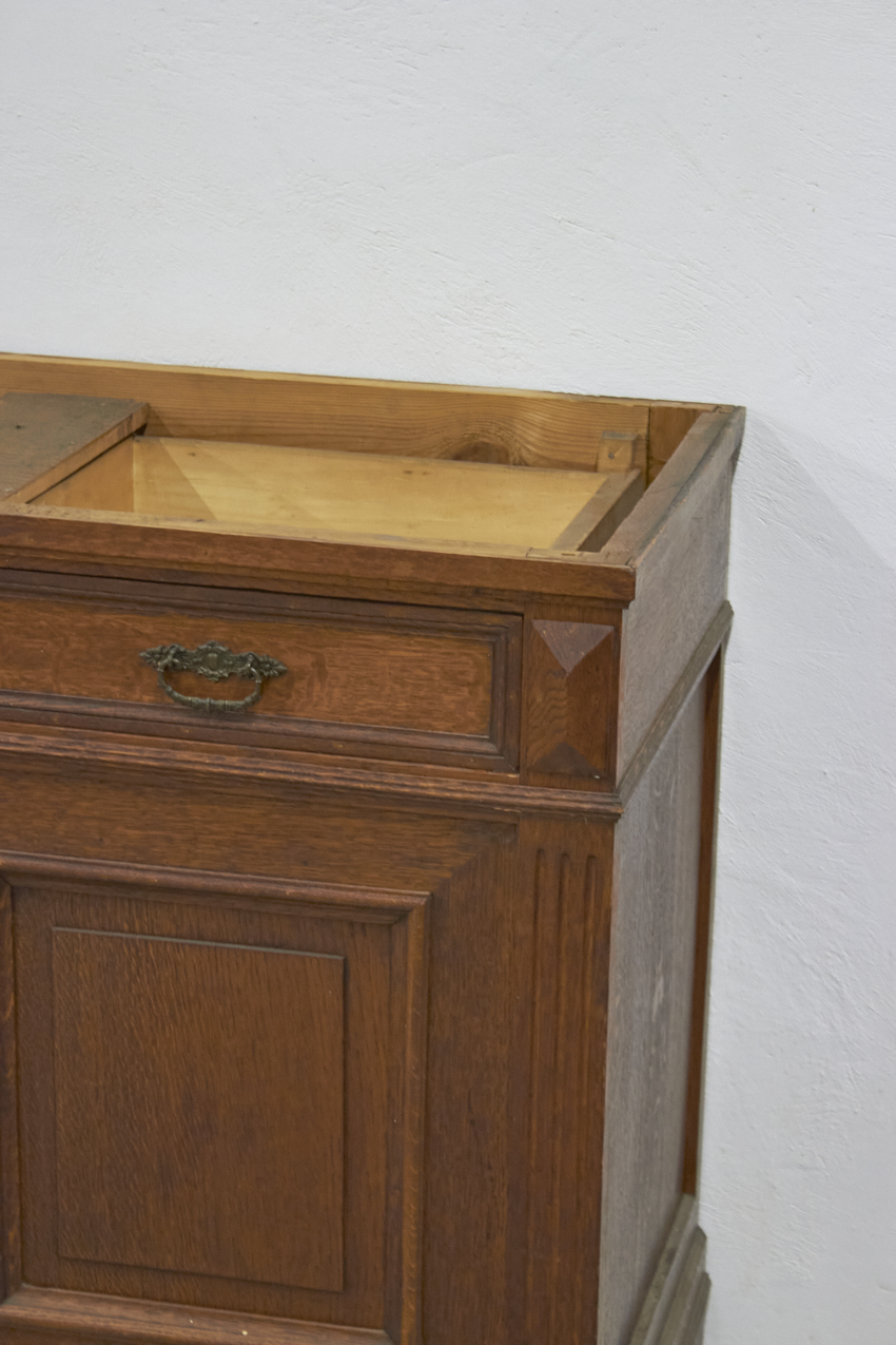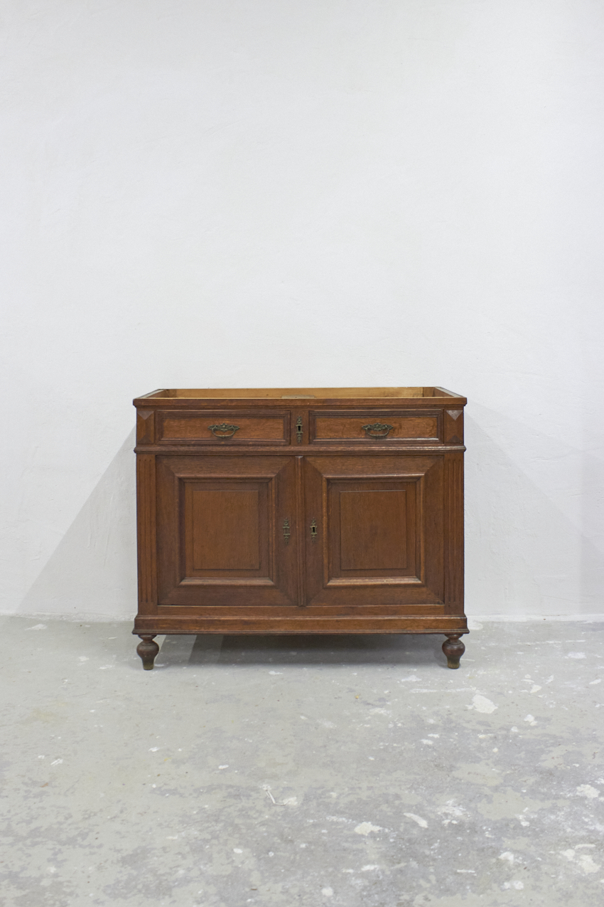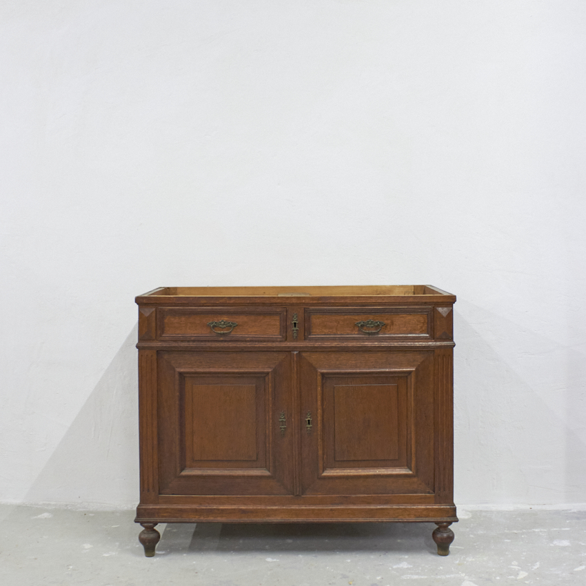Dit vintage meubel (nu nog zonder blad) is met zijn paneeldeuren een ideale commode. Een perfect meubel voor op de kinderkamer of als blikvanger in de woonkamer. Deze maat kan natuurlijk ook goed als fijne opbergkast in de hal, bijkeuken of op kantoor. De kast heeft twee kleine lades en achter de deurtjes is voldoende opbergruimte.