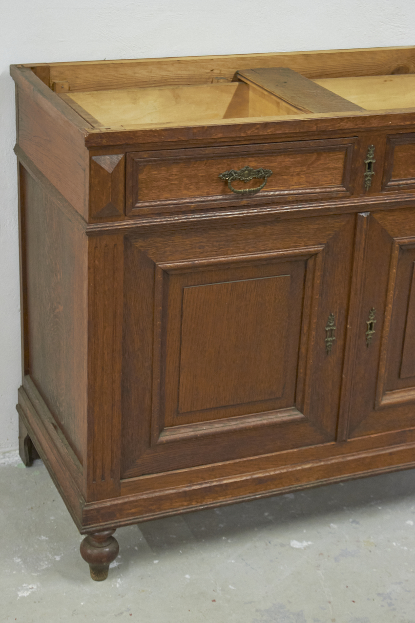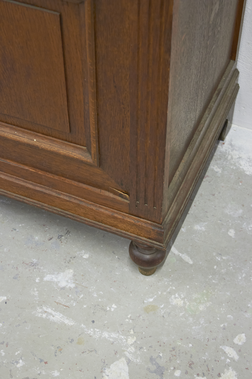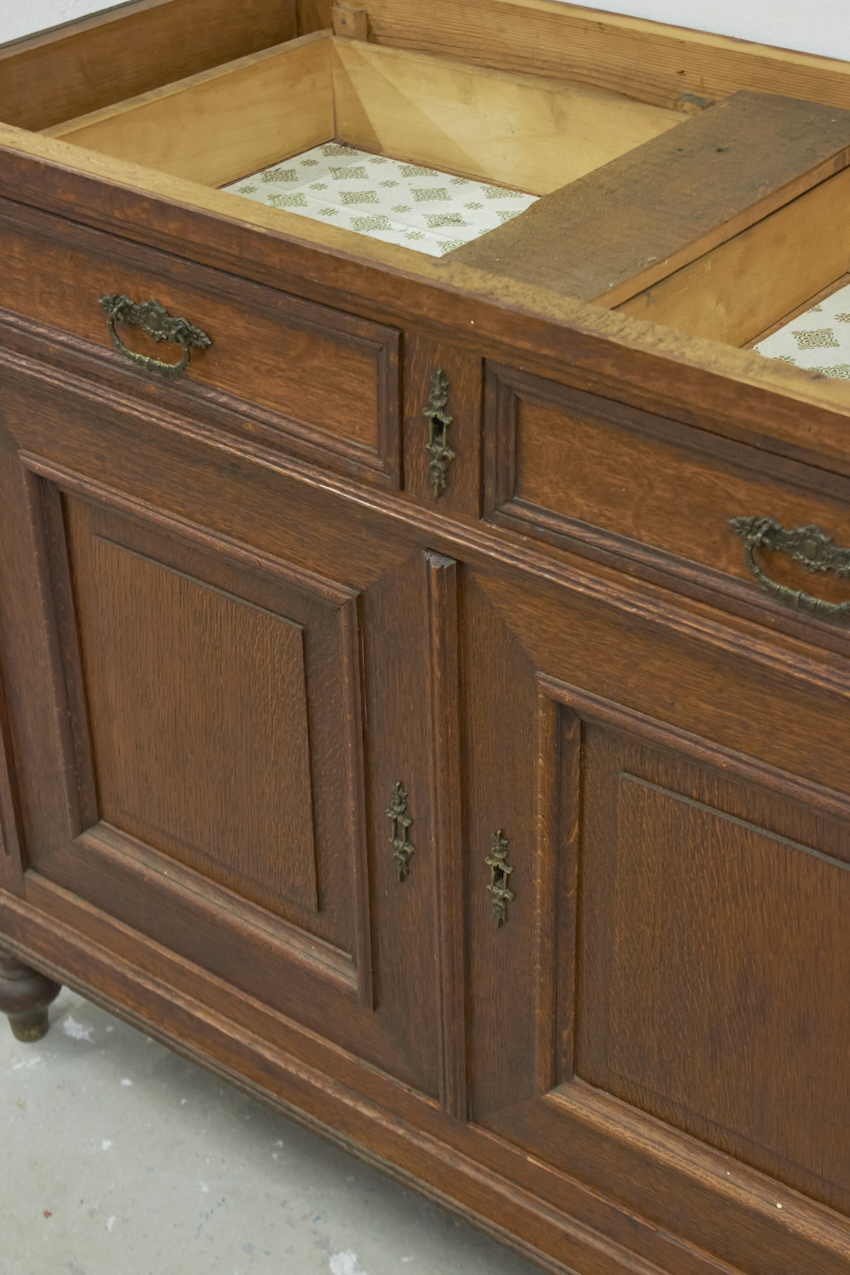 In de huidige staat is dit kastje een kleine commode. We kunnen de commode hoger maken door een open vak er op te plaatsen of juist de pootjes op te hogen. Deze knappe kast mist nu nog een bovenblad, deze kunnen we dus ook naar wens maken.