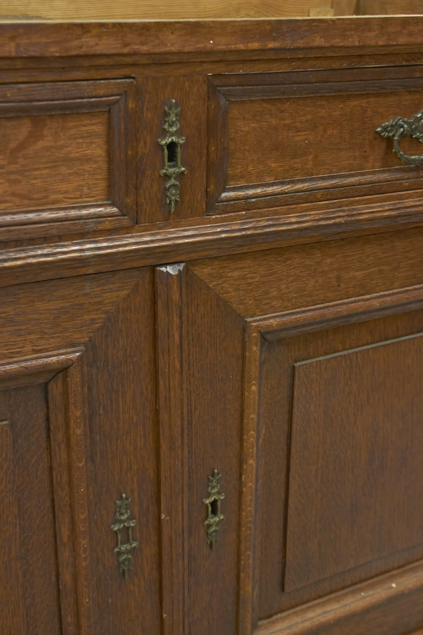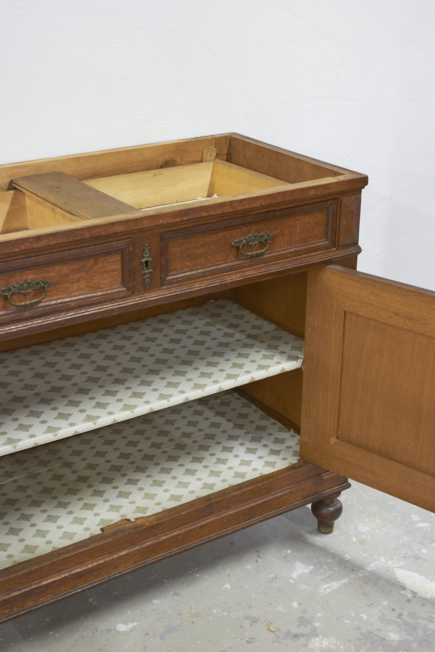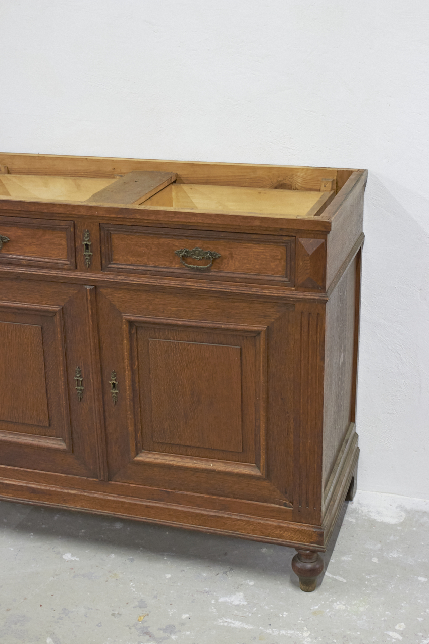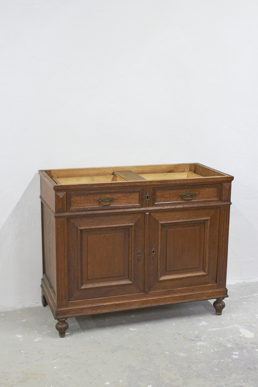 In de huidige staat is dit kastje een kleine commode. We kunnen de commode hoger maken door een open vak er op te plaatsen of juist de pootjes op te hogen. Deze knappe kast mist nu nog een bovenblad, deze kunnen we dus ook naar wens maken.