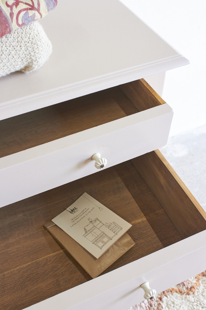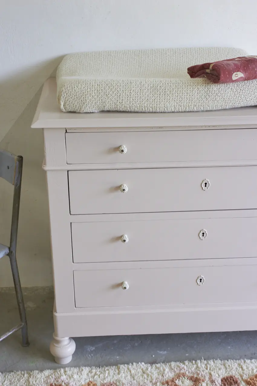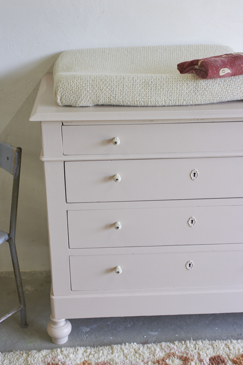 Wauw! Wat een plaatje, deze prachtige commode met in de kleur Bloesem. Ze is zo mooi geworden en lekker breed echt perfect om eerst als commode te gebruiken. Je hebt genoeg ruimte in de laatjes. Als de commode niet meer in functie is kan hij vervolgens ergens anders in huis een plekje krijgen, want deze kast zou natuurlijk ook fantastisch staan in de woonkamer als dressoir of als kledingkast in de kinderkamer. Kortom, je kan er alle kanten mee op! Wij zijn er heel blij mee.