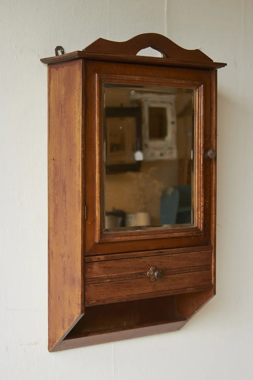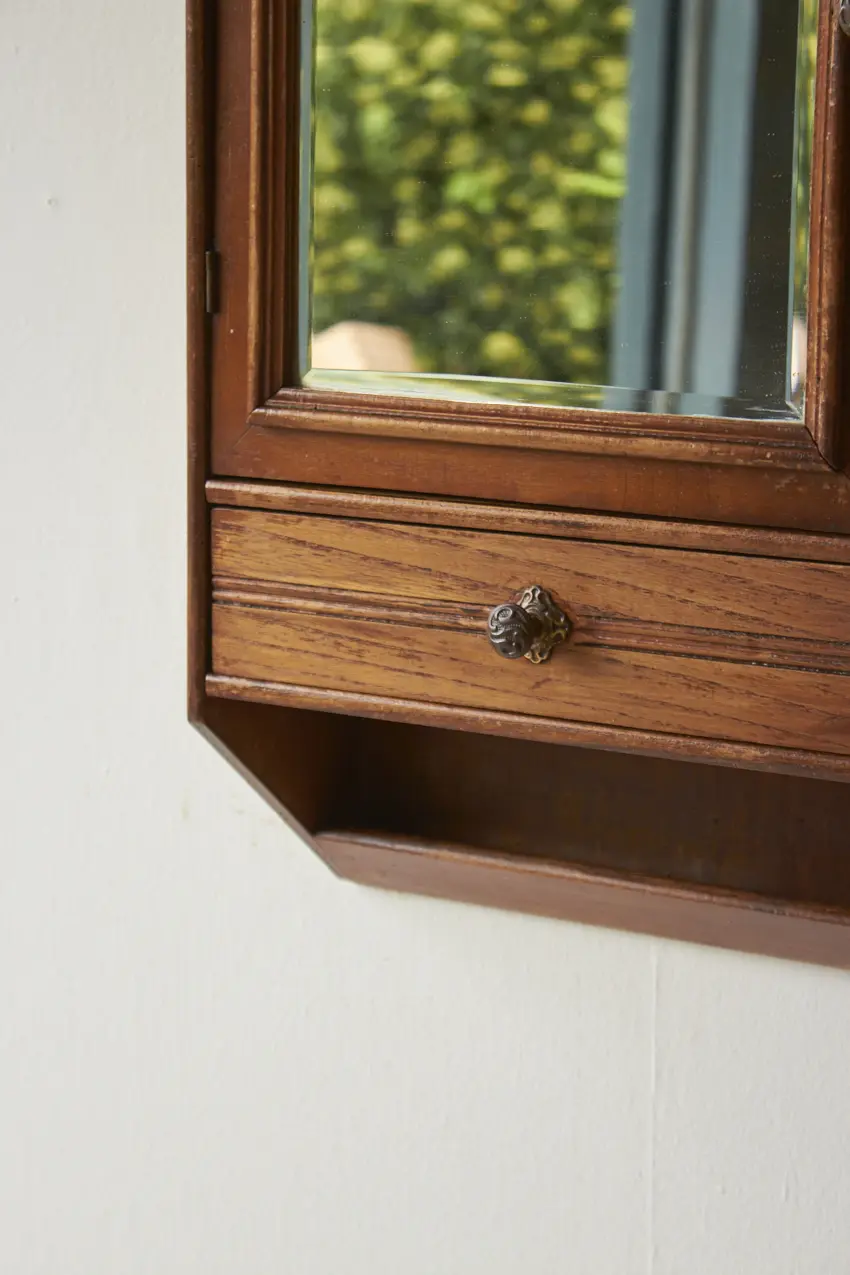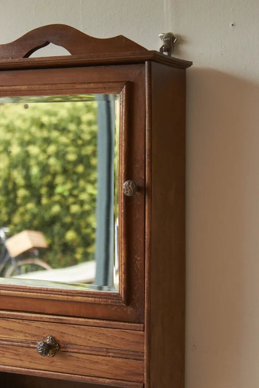 Dit specifieke hangkastje heeft prachtig houtsnijwerk en een vintage geslepen spiegel, met van die fijne vlekjes erop.