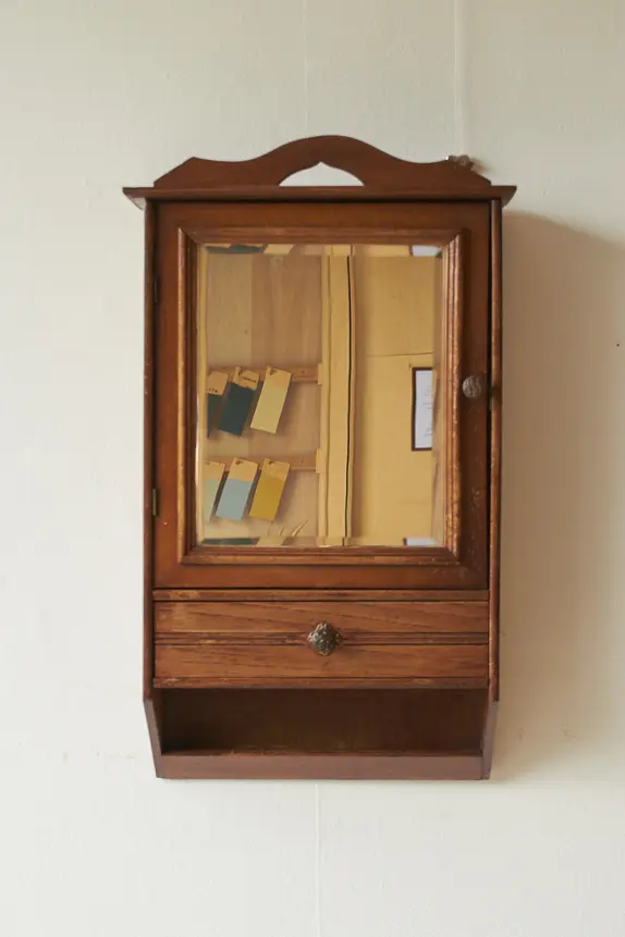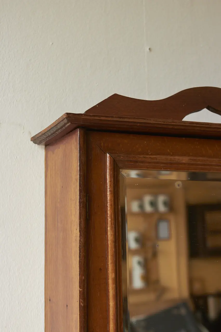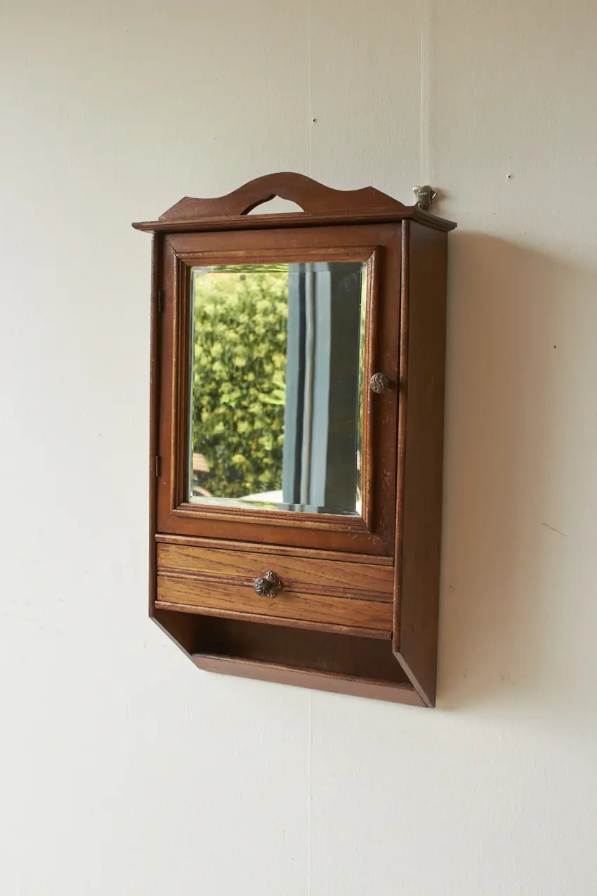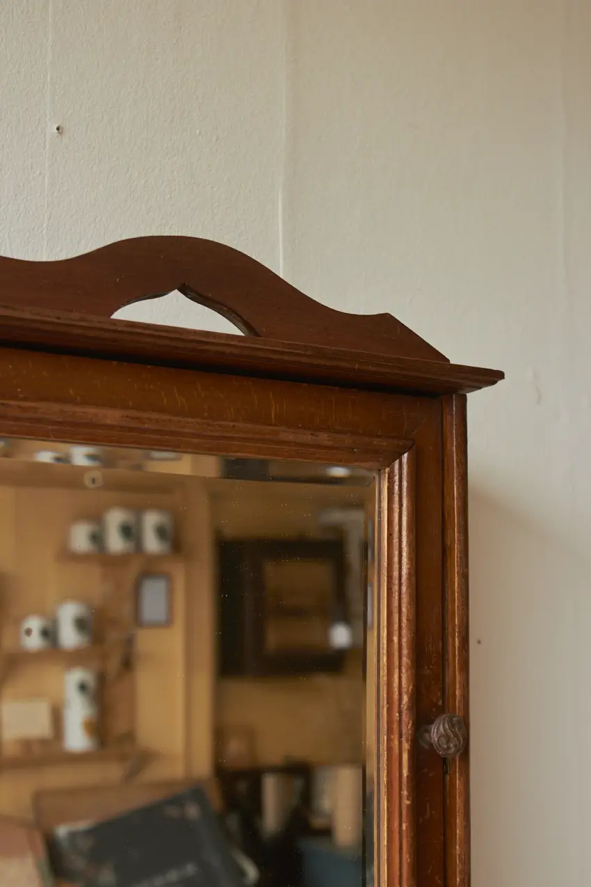 Dit specifieke hangkastje heeft prachtig houtsnijwerk en een vintage geslepen spiegel, met van die fijne vlekjes erop.