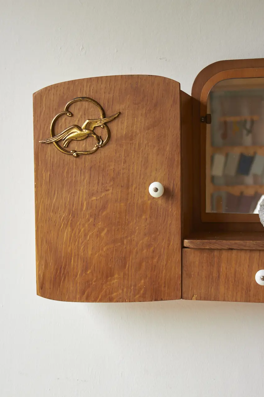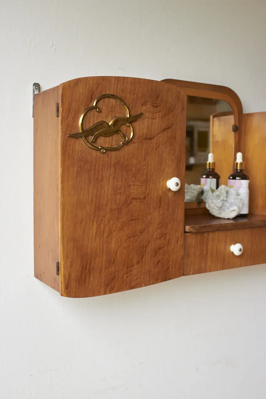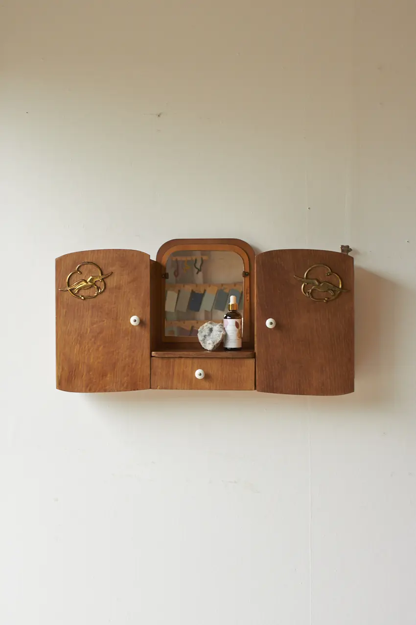 Dit specifieke hangkastje heeft een prachtig vintage spiegeltje, met van die fijne vlekjes erop. En messing vogels op de deurtjes. En tussen in zit nog een handig laatje voor al je kleine schatten. Elk hangkastje is goed schoongemaakt, behandeld tegen houtworm en gerepareerd waar nodig. En nu is hij weer helemaal klaar voor een nieuwe plek! Elk stuk is uniek, met een eigen karakter en een flinke dosis gezelligheid.