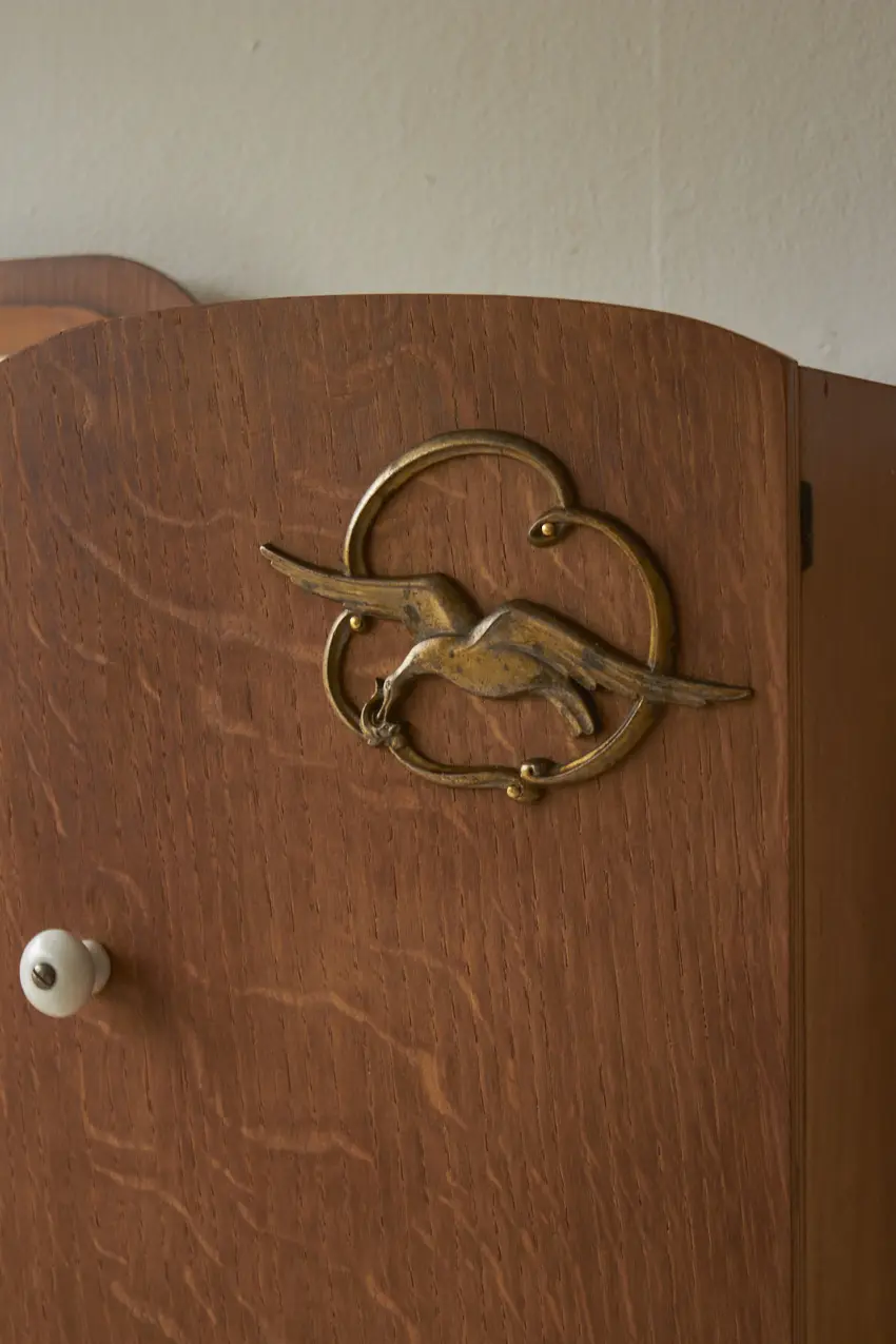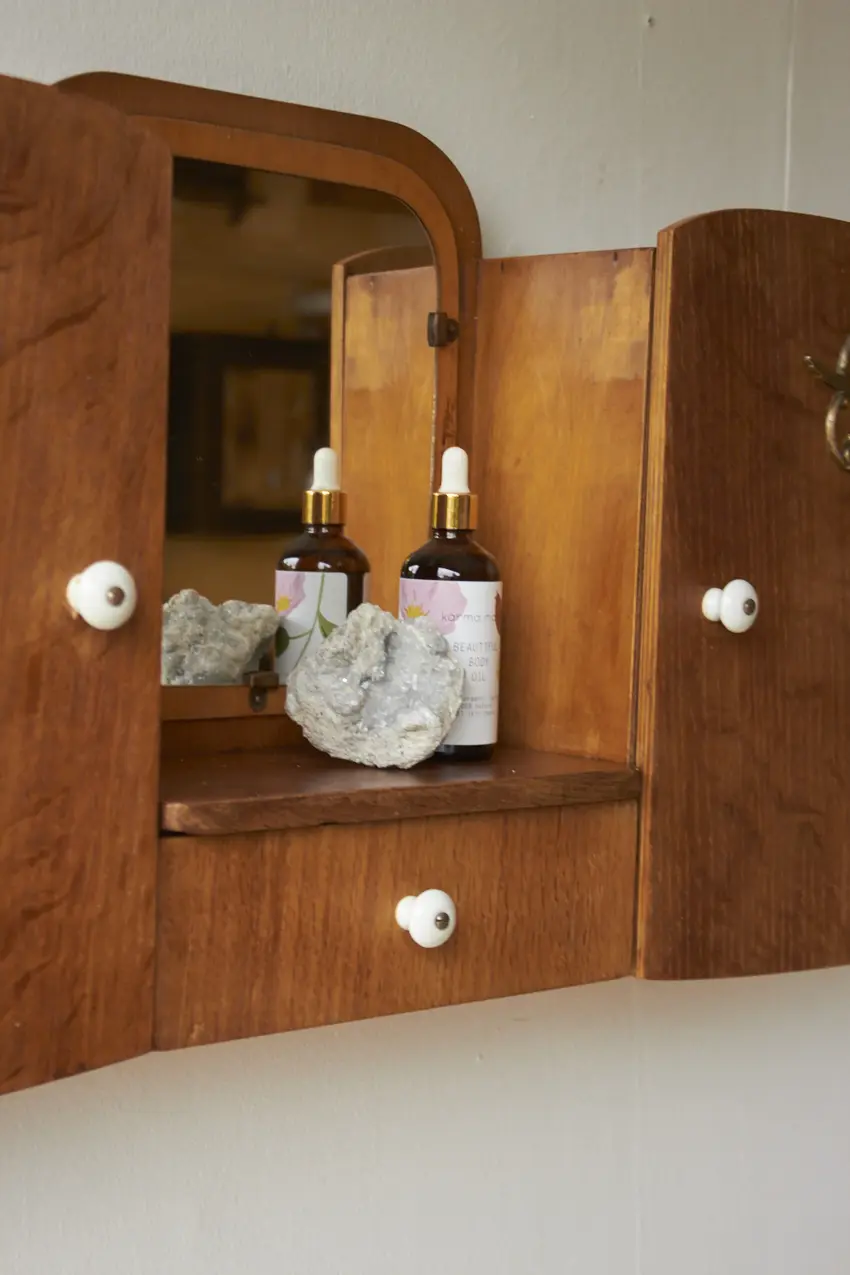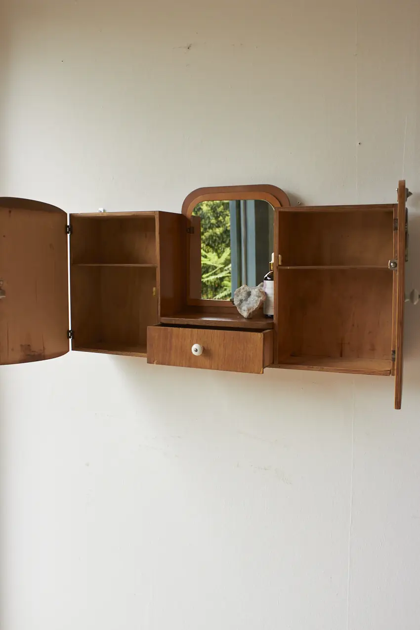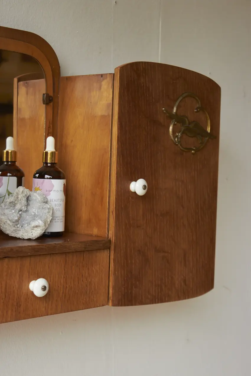 Dit specifieke hangkastje heeft een prachtig vintage spiegeltje, met van die fijne vlekjes erop. En messing vogels op de deurtjes. En tussen in zit nog een handig laatje voor al je kleine schatten. Elk hangkastje is goed schoongemaakt, behandeld tegen houtworm en gerepareerd waar nodig. En nu is hij weer helemaal klaar voor een nieuwe plek! Elk stuk is uniek, met een eigen karakter en een flinke dosis gezelligheid.