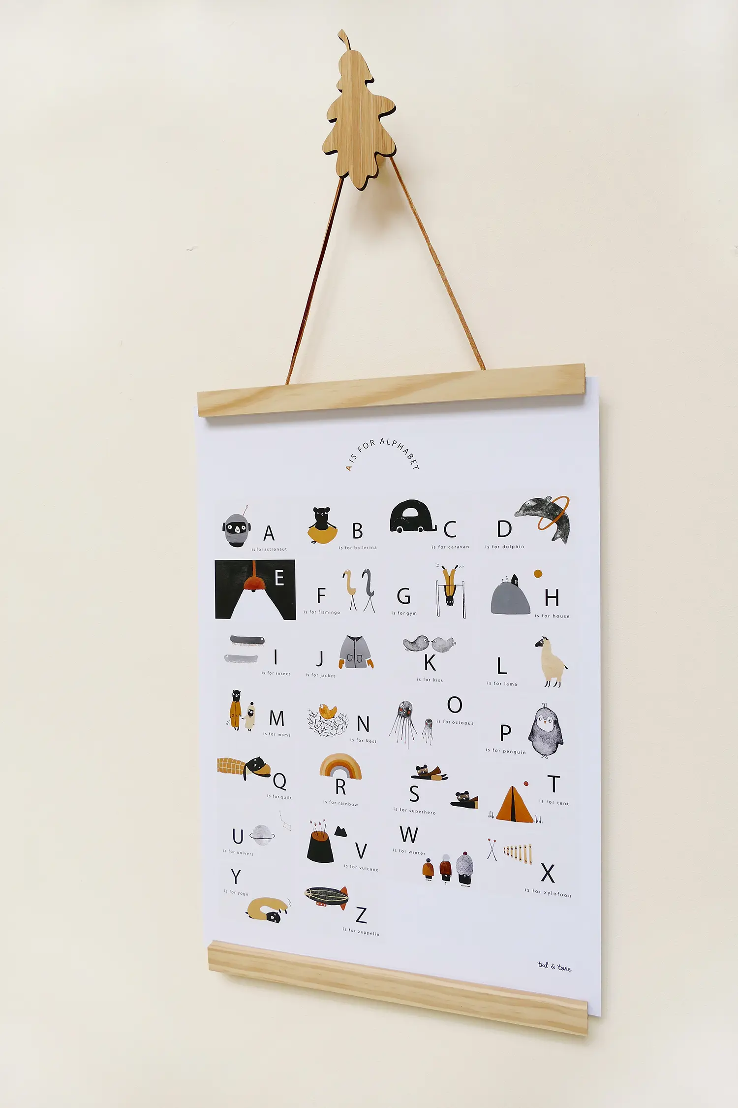 De A is van astronaut, de B is van ballerina, de C is van caravan… Hoe leuk is het om met dit poster het alfabet te leren! De poster is in Nederland geprint op mooi dik papier en wordt geleverd met een houten frame.