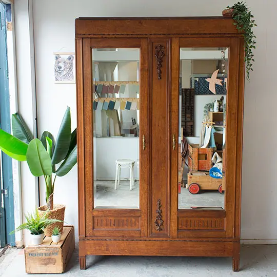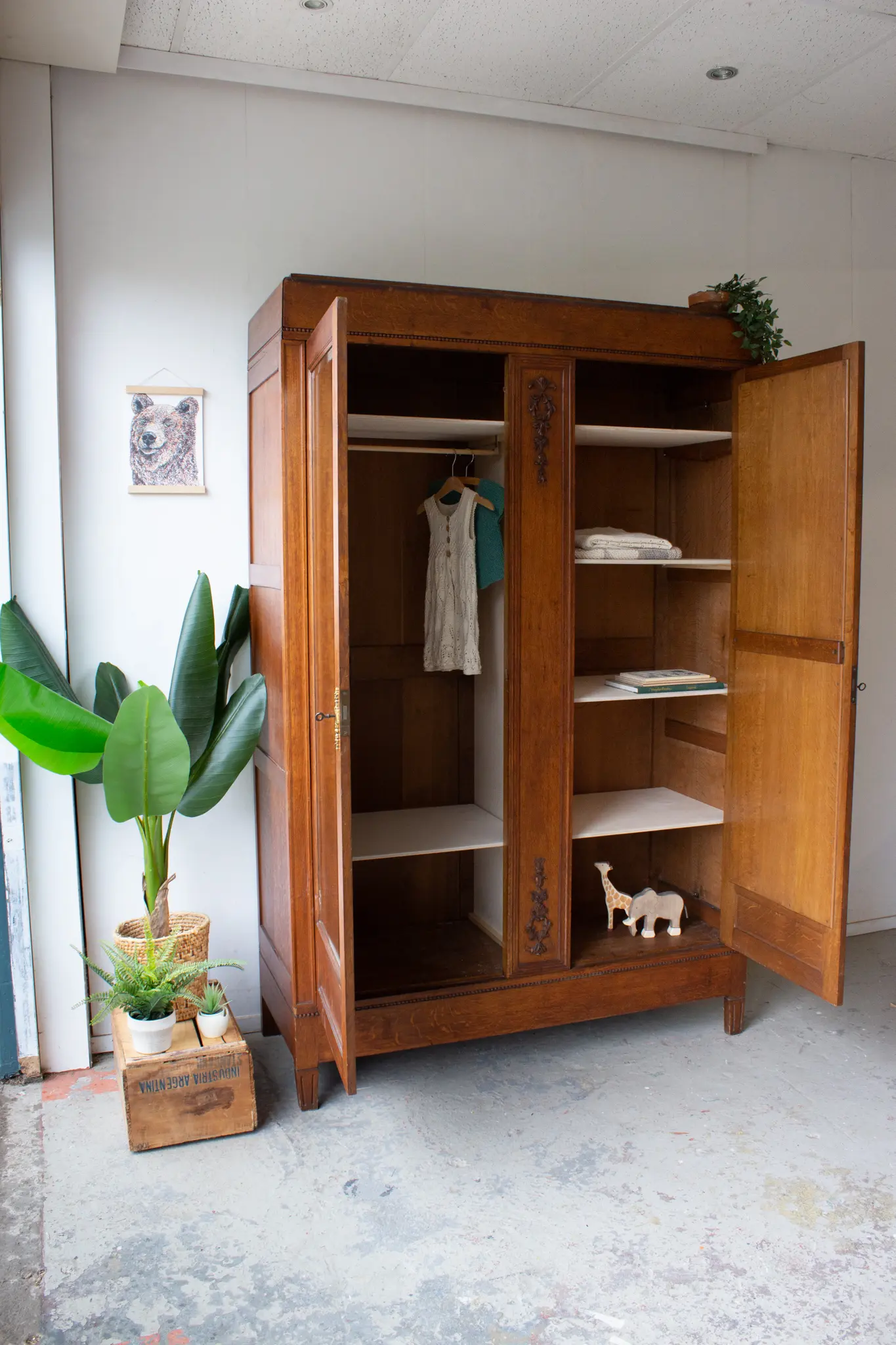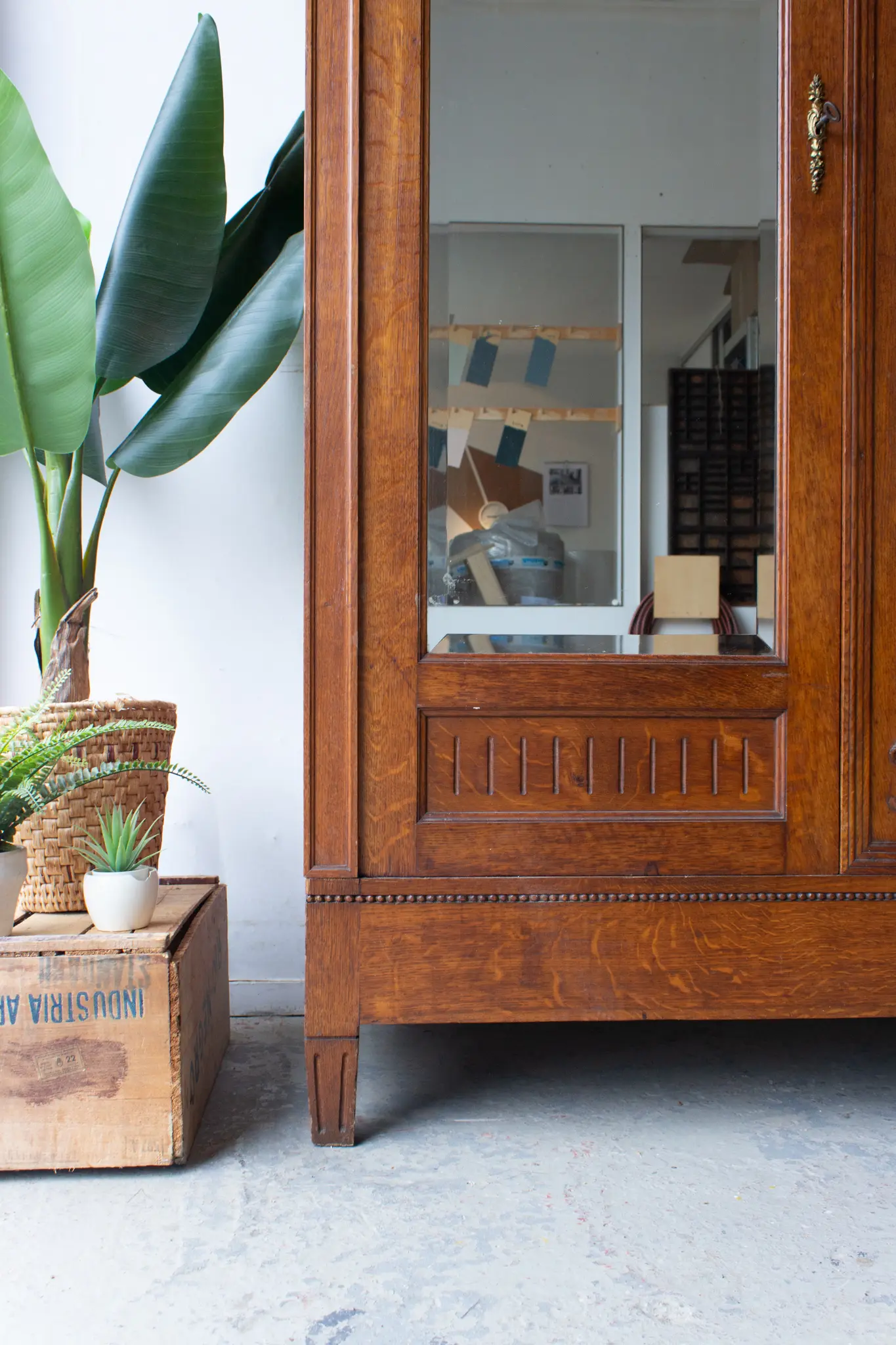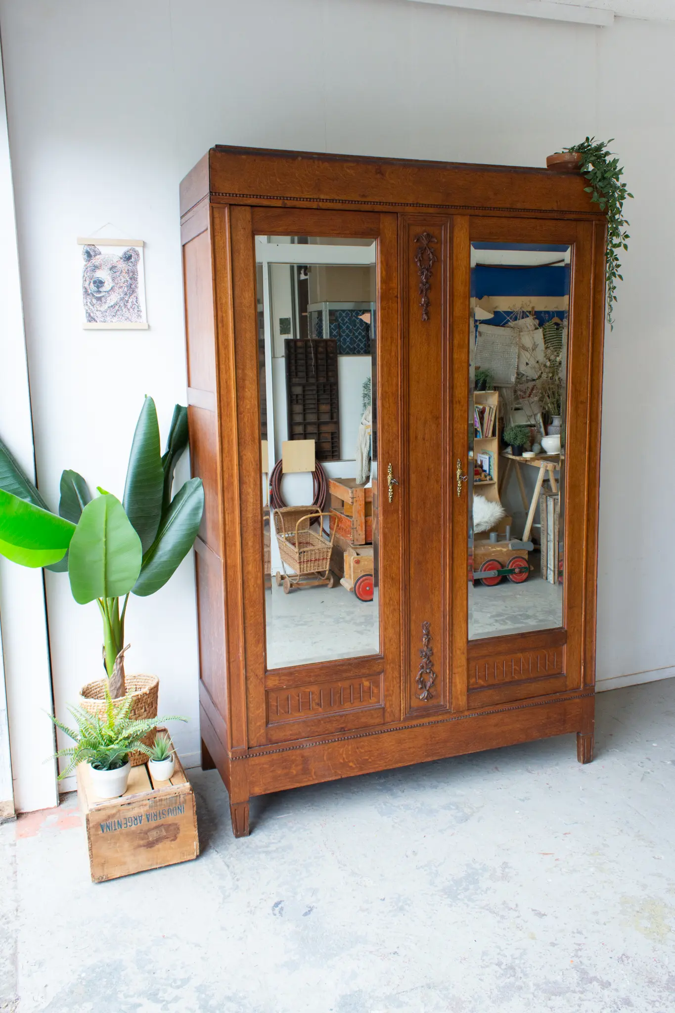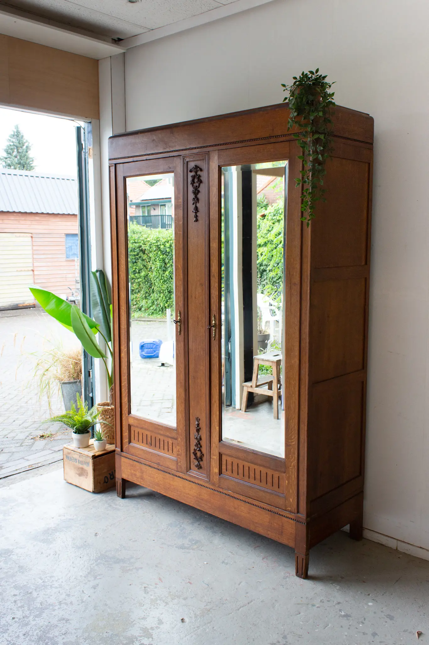 Wat een prachtige authentieke spiegelkast is dit! Gemaakt van stevig eikenhout. We besloten hem zo te laten, hij is zo mooi en nog in goede staat. Wat een knapperd. Na een grondige schoonmaakbeurt hebben we hem behandeld tegen houtworm. Vervolgens hebben we hem in elkaar gezet en hem een nieuwe indeling gegeven. Nu is er ruimte voor zowel hang als leg kleding. Hij is volledig nagelopen en de nodige reparaties hebben we gedaan. Het houtsnijwerk in het midden onder mist een klein stukje, gelukkig valt dit bijna niet op! De kast is behandeld met een voedende olie en zo kan hij weer jaren mee!