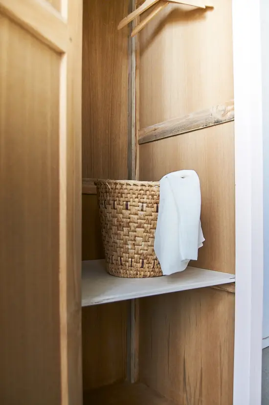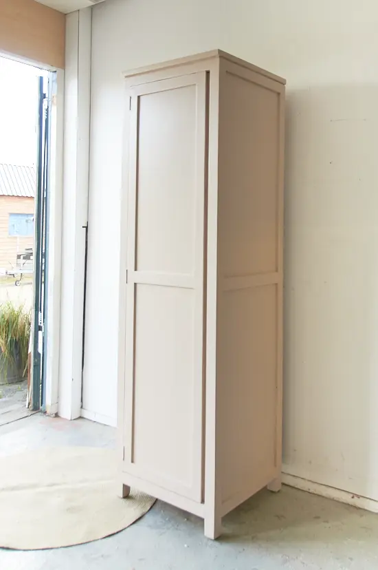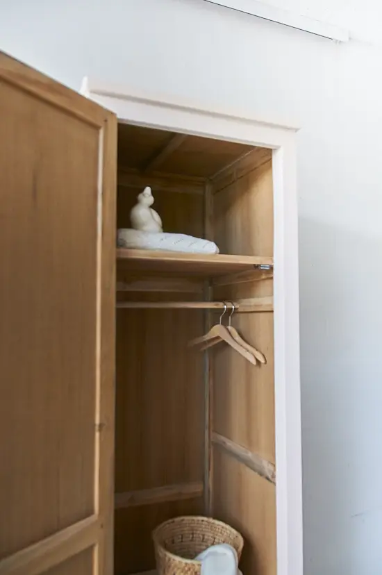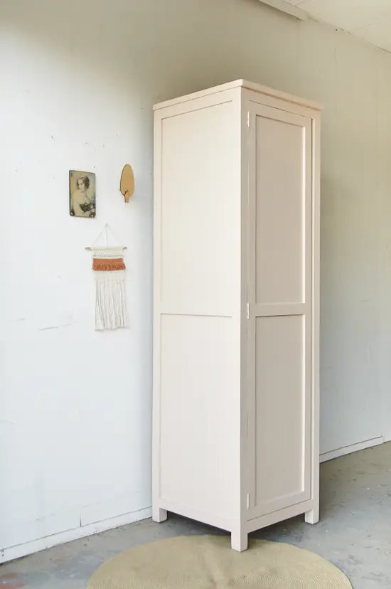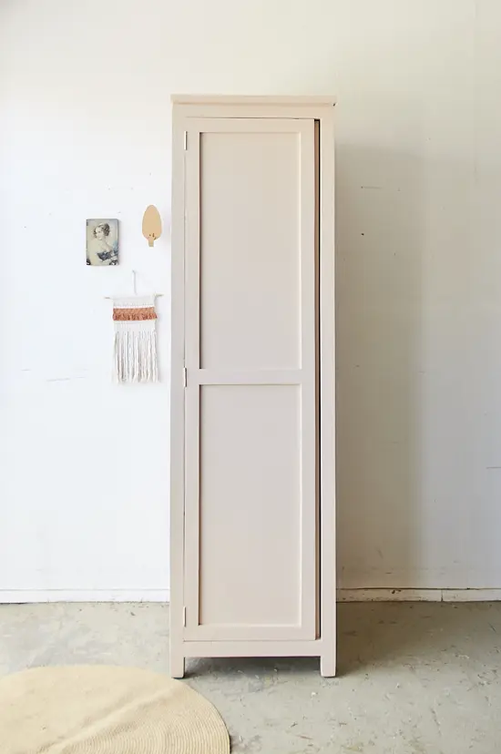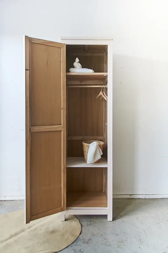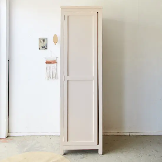 Een 1 deurs kledingkast in de kleur bloesem. Leuk voor op een kinderkamer. Na een grondige schoonmaakbeurt hebben wij hem behandeld met anti houtworm middel. De binnenkant ziet er zo mooi uit. Wij hebben nog 1 plank beneden toegevoegd. Nu is daar ruimte voor bijvoorbeeld een bak met speelgoed. De deur sluit door middel van een magneetje. Helemaal klaar voor gebruik.