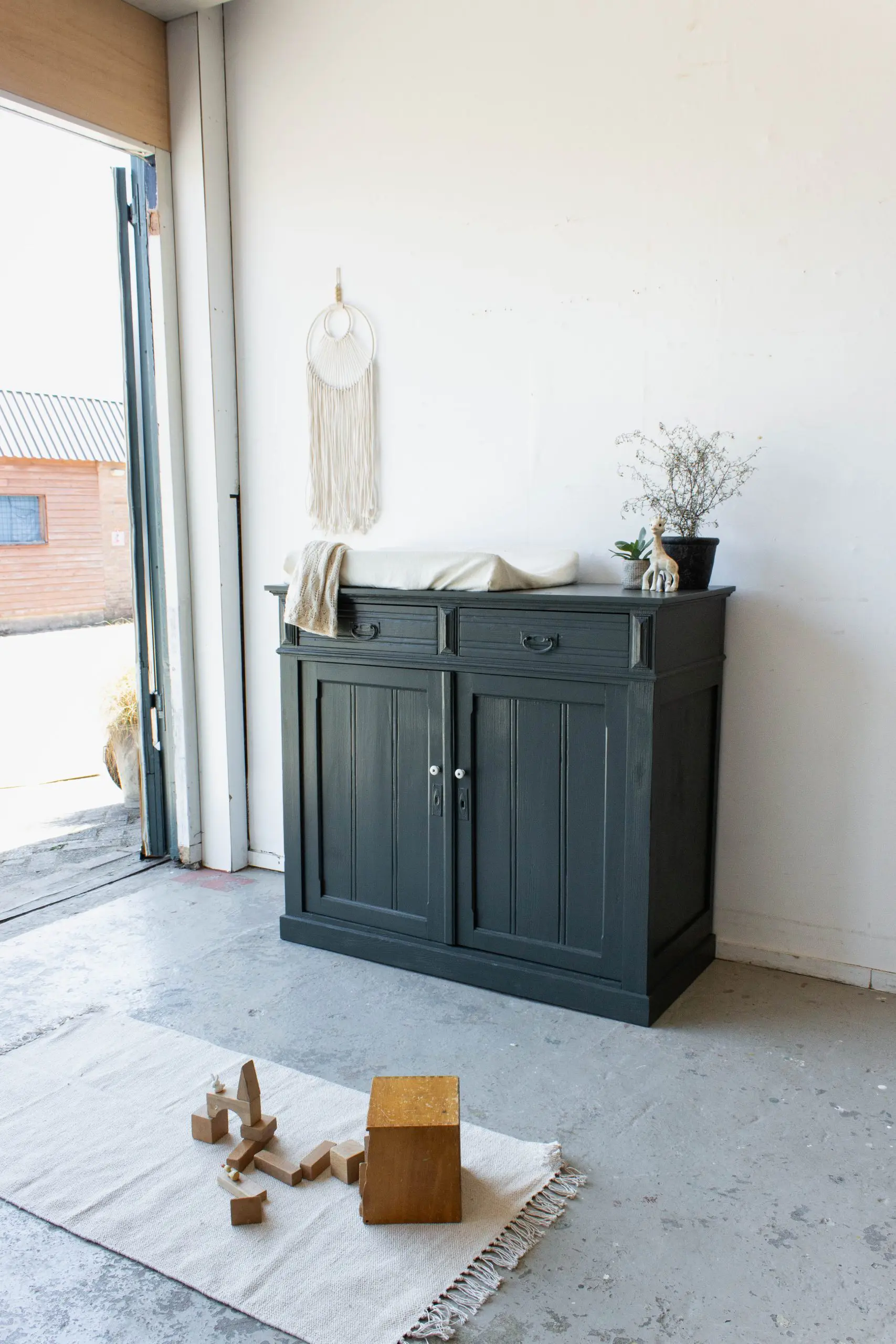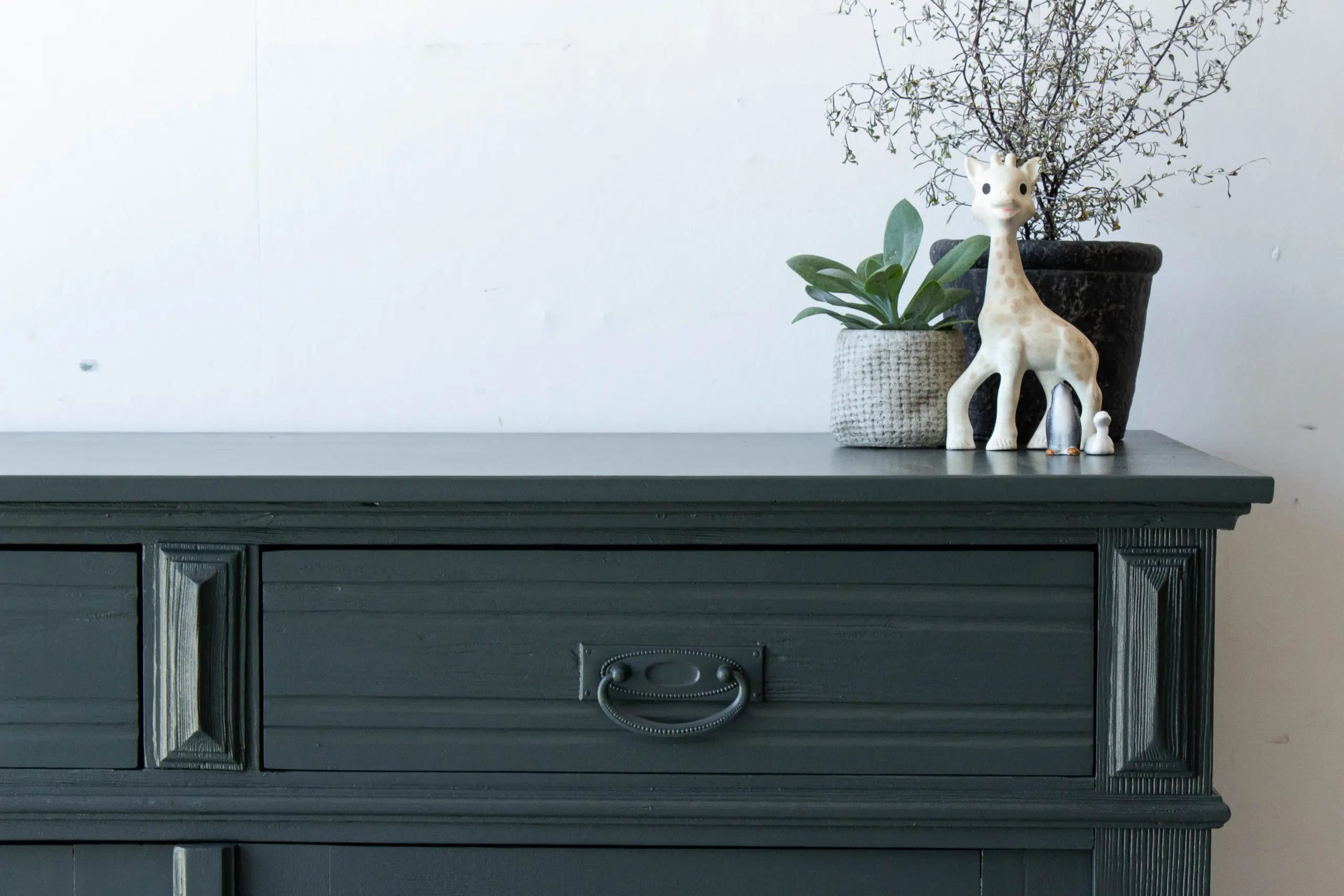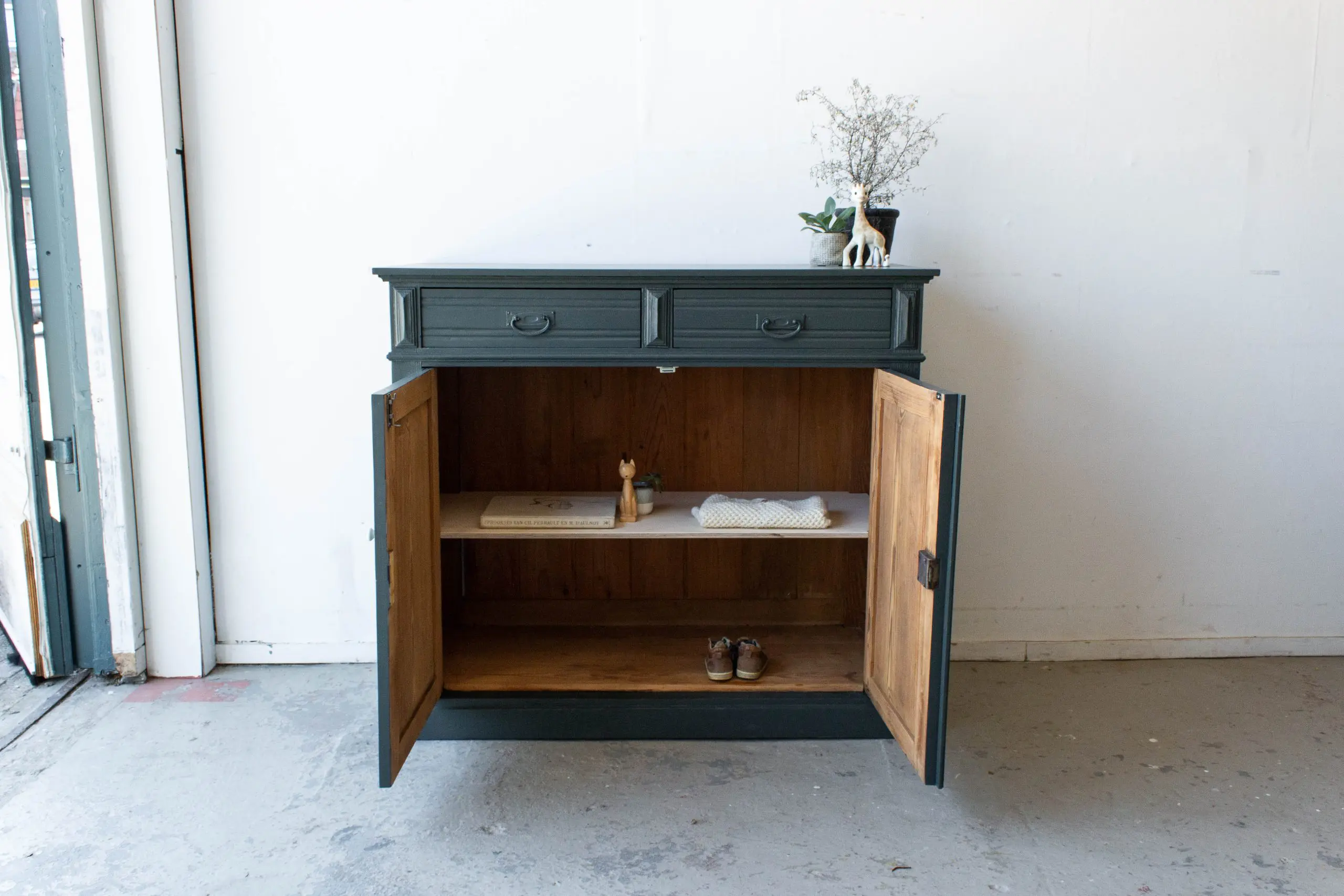 Een prachtige, ruime commode uit Frankrijk. De commode was oorspronkelijk erg hoog, te hoog om als commode te kunnen gebruiken. In onze werkplaats hebben we de pootjes eraf gehaald en nu heeft hij een mooie hoogte om een kindje aan te verschonen. Na de grote schoonmaak, heeft het kastje ook een nieuw bovenblad gekregen, want het ouden blad was niet goed meer. En daarna is hij in deze geweldige woudgroene kleur geschilderd. Wat staat het hem goed! De deurtjes sluiten door middel van een schuifje en een magneetje. En zo is deze vintage commode weer helemaal klaar voor gebruik