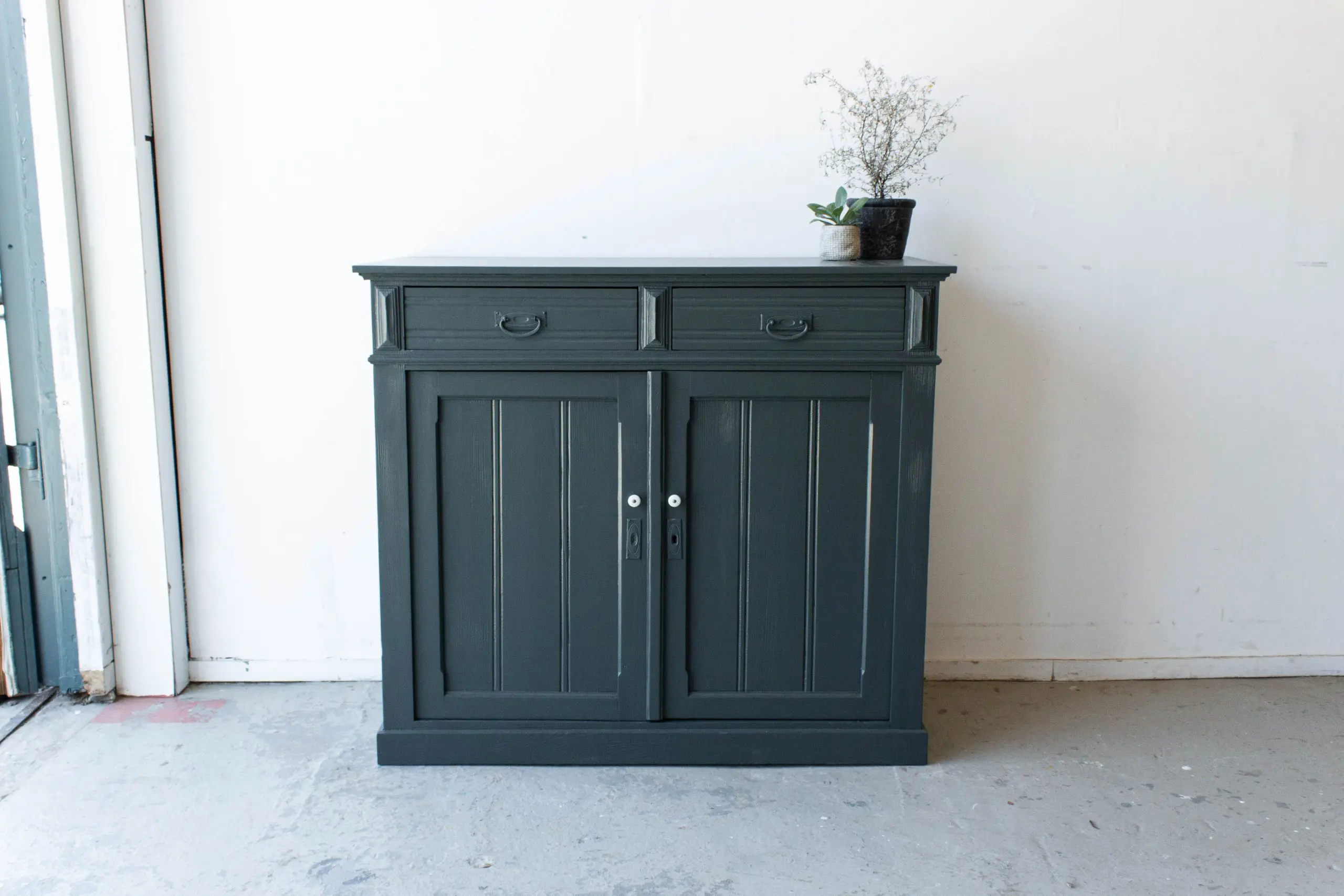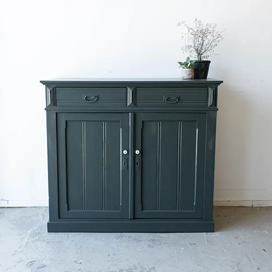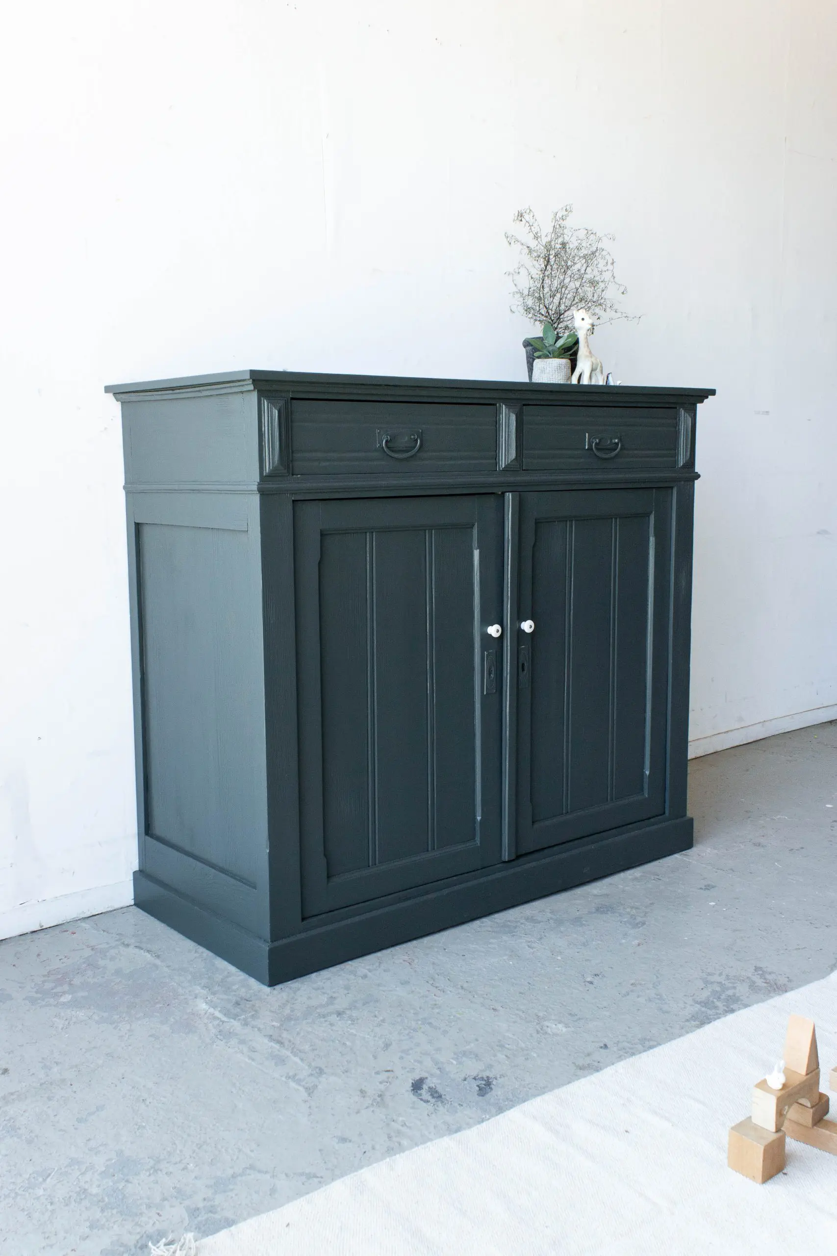 Een prachtige, ruime commode uit Frankrijk. De commode was oorspronkelijk erg hoog, te hoog om als commode te kunnen gebruiken. In onze werkplaats hebben we de pootjes eraf gehaald en nu heeft hij een mooie hoogte om een kindje aan te verschonen. Na de grote schoonmaak, heeft het kastje ook een nieuw bovenblad gekregen, want het ouden blad was niet goed meer. En daarna is hij in deze geweldige woudgroene kleur geschilderd. Wat staat het hem goed! De deurtjes sluiten door middel van een schuifje en een magneetje. En zo is deze vintage commode weer helemaal klaar voor gebruik