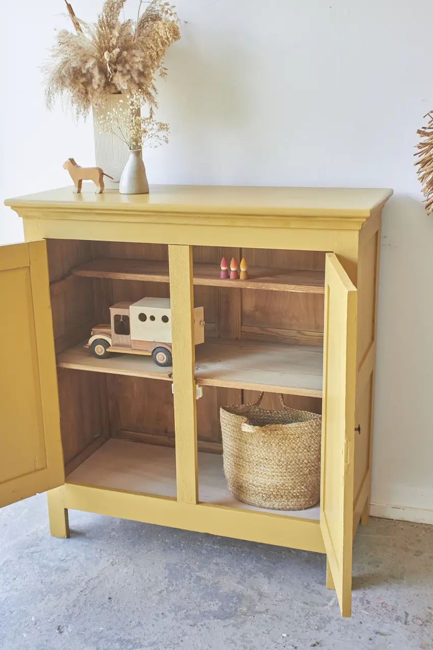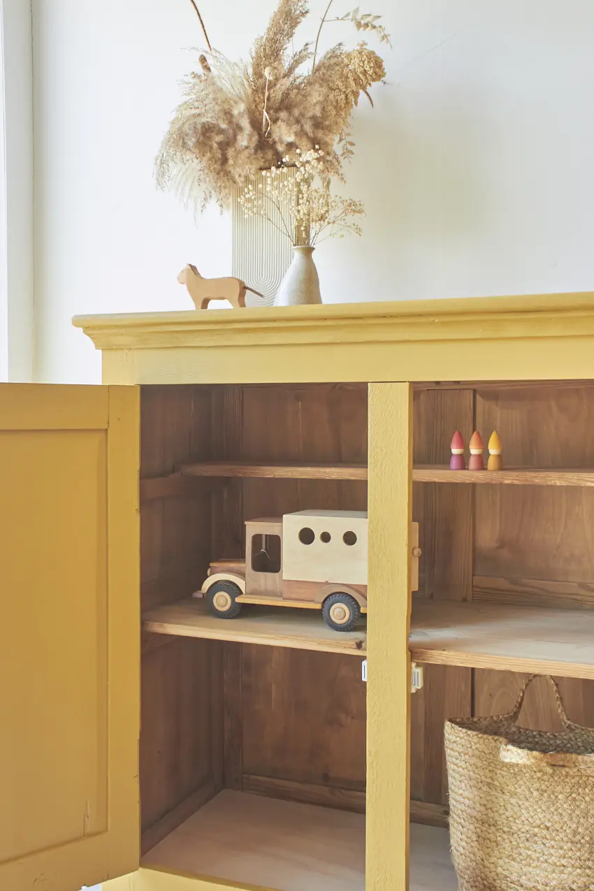 charmante halfhoge speelgoedkast in okergeel – perfect voor kinderkamers