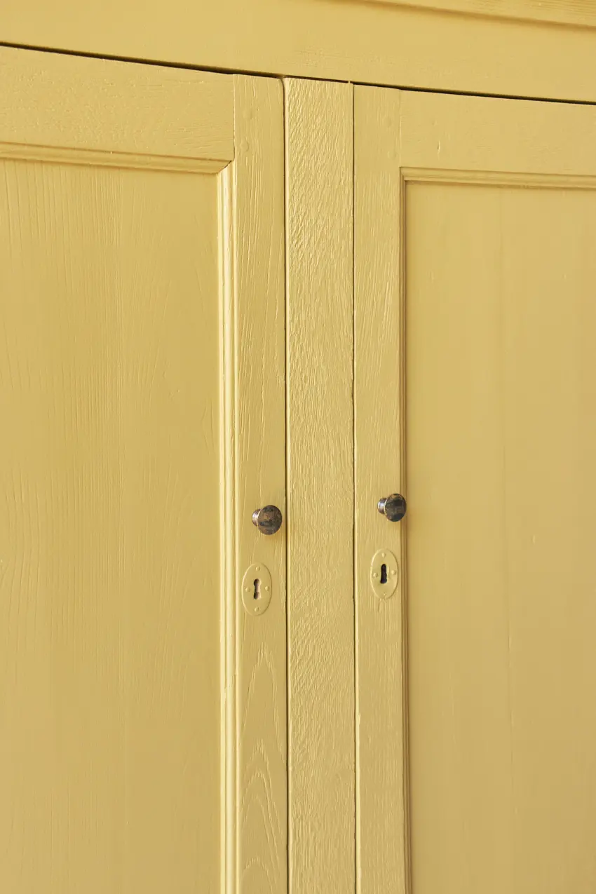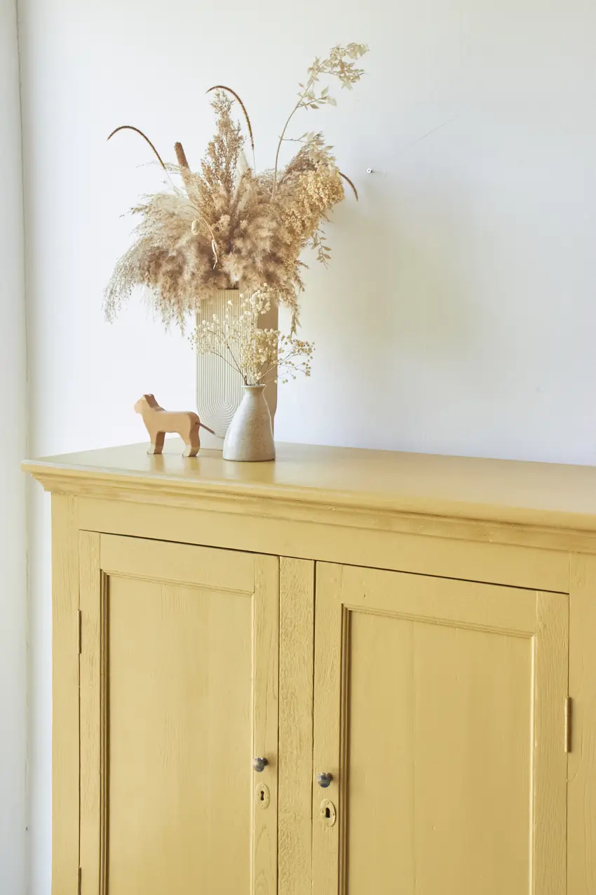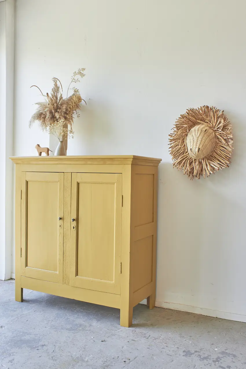 Daarna is de kast in de grondverf gegaan. Na het grondverven liepen we de hele kast nog na met plamuur, geen gaatje of deukje dat niet bij het hout hoort bleef onbehandeld. De grove vezel weer gladschuren, twee lagen van onze mooie lak Saffraan en toen was het tijd om de knoppen te kiezen. Is deze kast niet fantastisch geworden?
