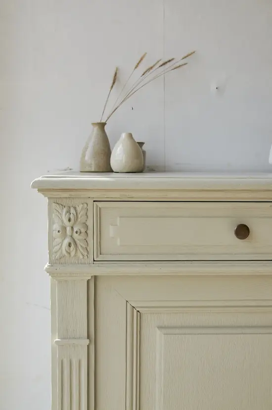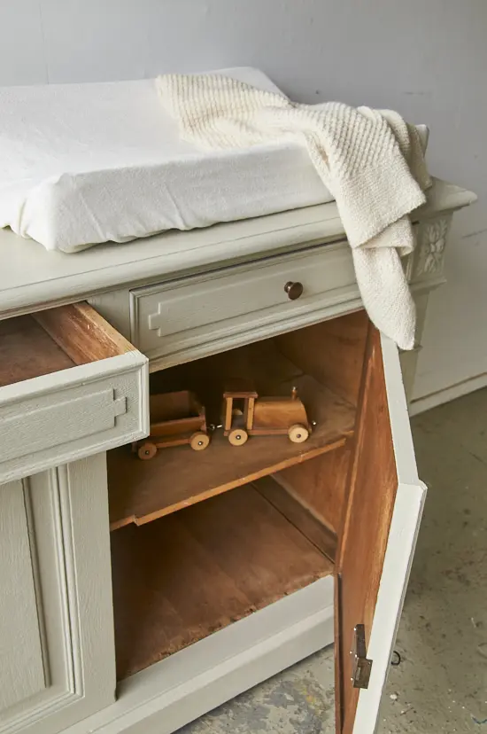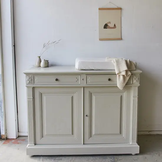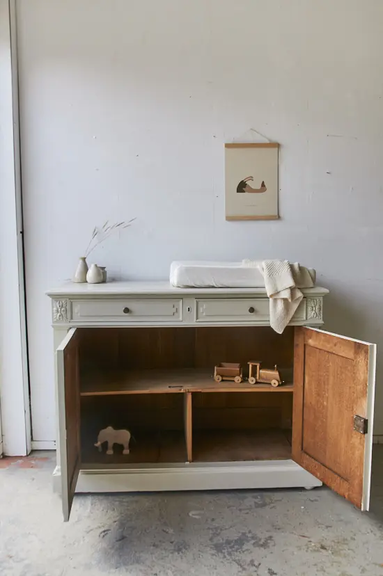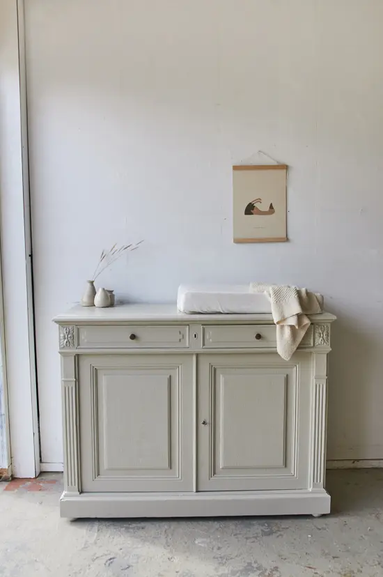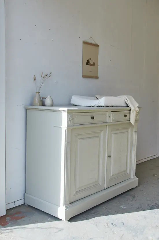 Yes een nieuwe commode in de kleur linnen. We hebben de commode grondig schoongemaakt en behandeld tegen houtworm. We zaagden een aantal centimeters van de poten af, zodat hij nu de perfecte hoogte heeft om als commode te dienen. De deurtjes hingen we weer goed terug en we zorgden dat de laatjes niet meer klemden. Na de laag grondverf, besloten we hem in de kleur linnen te schilderen en wat staat het hem mooi! Zo sierlijk in combinatie met het houtsnijwerk. Het linker deurtje sluit met een haakje aan de binnenkant en het rechter deurtje sluit door middel van de sleutel.