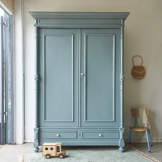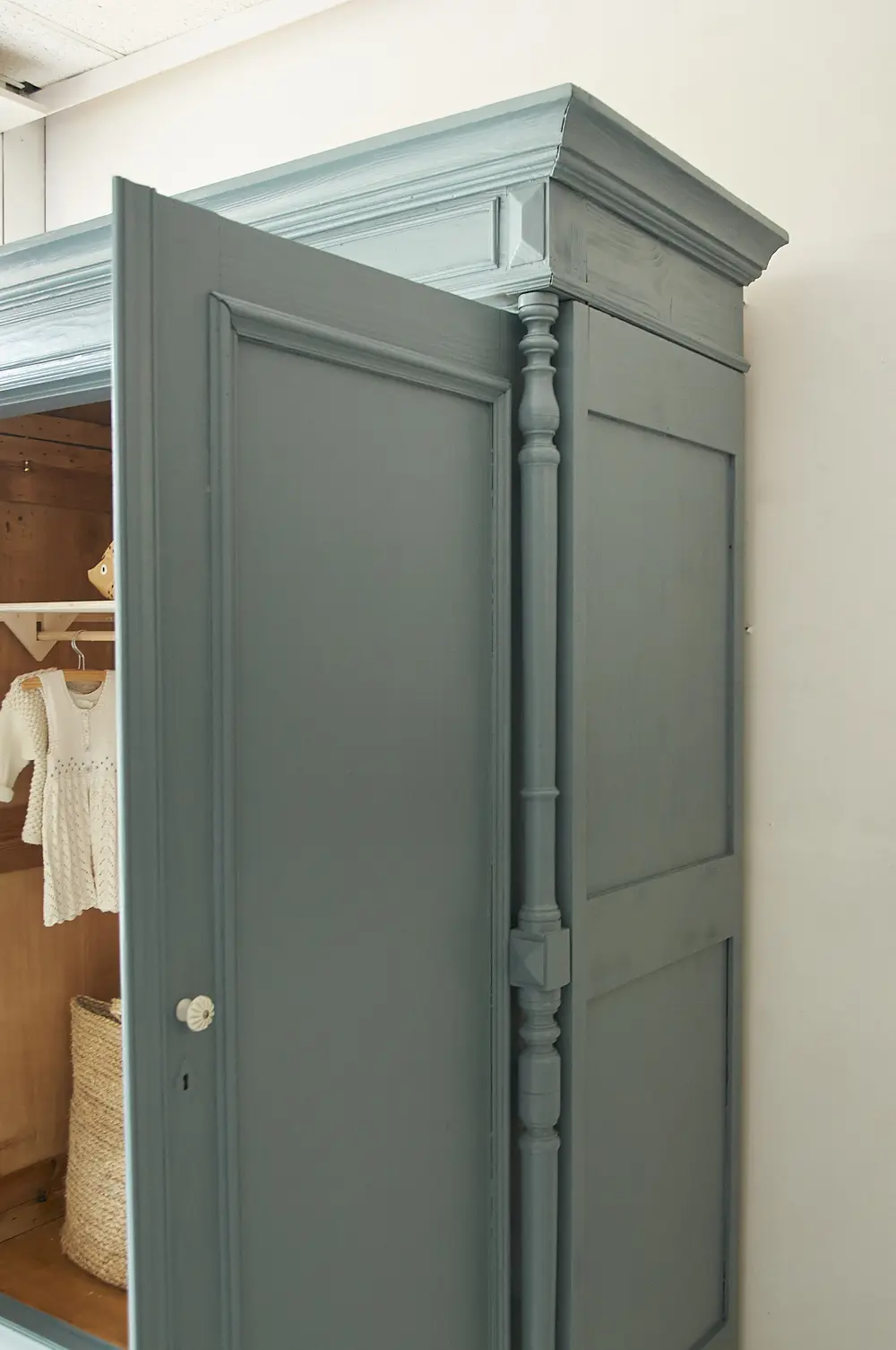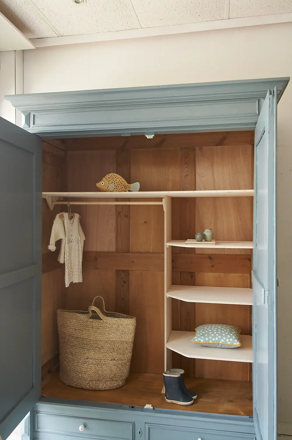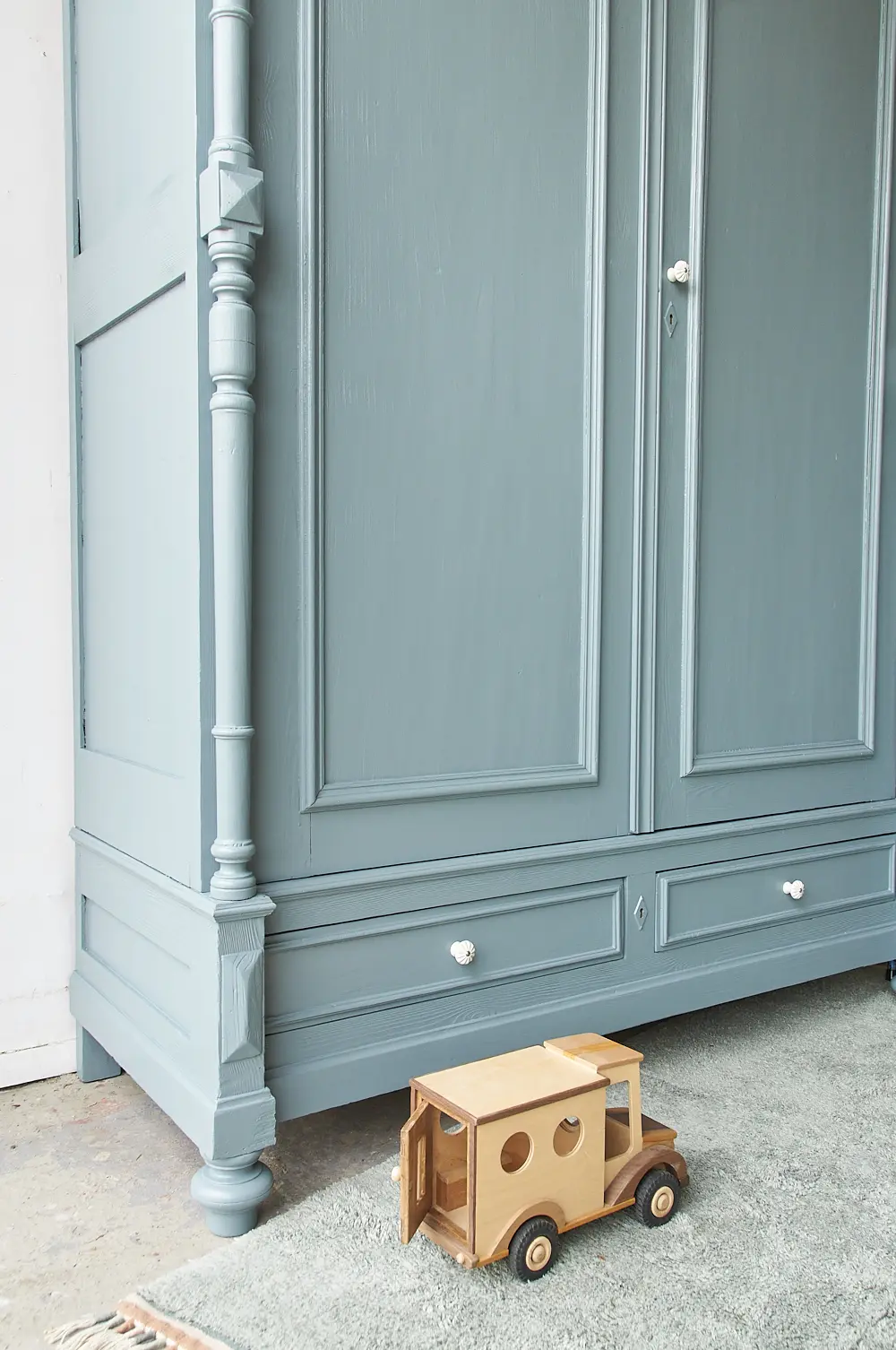 Wat een plaatje. Toen we deze kast binnen kregen waren we meteen verliefd op de leuke pilaren aan beide zijkanten, zo’n leuk detail! De kast had na het stralen veel liefde nodig en dat hebben we hem gegeven. We hebben twee panelen aan de achterkant vervangen, de kroon is weer vastgezet, de bodem is aangepast, de lades zijn gerepareerd, de deuren zijn er goed ingehangen en zo voorts! Toch is het altijd leuk dit soort projecten, want het resultaat mag er wezen, al zeggen we het zelf. We hebben de kast een nieuwe indeling gegeven waar zowel hang als leg kleding in past. Ideaal! We kozen ervoor deze kast in onze mooie kleur Bron te schilderen, een zachte en warme grijzige blauw. We hebben hem afgewerkt met onze witte porseleinen knoppen. De linker deur sluit met een schuifje en de rechter deur met een magneetje. En zo is deze kast weer helemaal klaar voor een nieuwe plek!Demontabel: ja