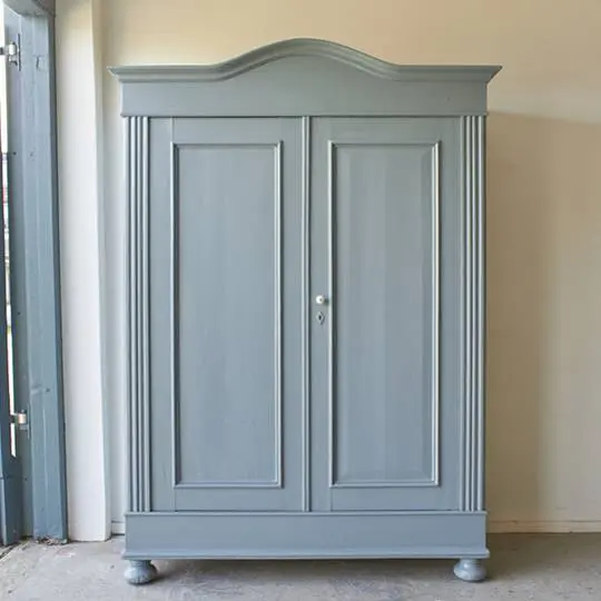 Een prachtige authentieke kast, hier worden wij blij van. Perfect voor op de kinderkamer, of in de woonkamer voor knutselspullen en spelletjes! Ze heeft er al een behoorlijk leven op zitten, de panelen hebben hier en daar een kiertje, wij vinden dat niet erg. Het geeft de kast een prachtig doorleeft uiterlijk. Wij hebben hem goed onder handen genomen. Hij werd kaal gespoten, grondig schoongemaakt en behandeld tegen houtworm. De verbindingen waren niet al te best meer, dus deze hebben we allemaal vervangen. Langzamerhand kwam de kast weer een beetje tot leven. We kozen ervoor deze kast in onze mooie kleur Bron te schilderen. Bron is een rustige, grijsblauwe kleur. Elk meubel krijgt een hele fijne zachte uitstraling zodra deze een likje Bron heeft gekregen. Zelfs grote en hoge kasten worden door Bron minder log en zwaar in de ruimte. Bron combineert goed met een druk behang, maar komt ook perfect tot zijn recht in combinatie met een lichte muur. Een hele fijn rustige blauwtint! Het staat heel goed! We hebben de kast afgewerkt met onze leuke porseleinen knop, de linker deurt sluit met een schuifje en de rechter deur met een magneetje. En nu is deze leukerd weer helemaal klaar voor een nieuwe plek!