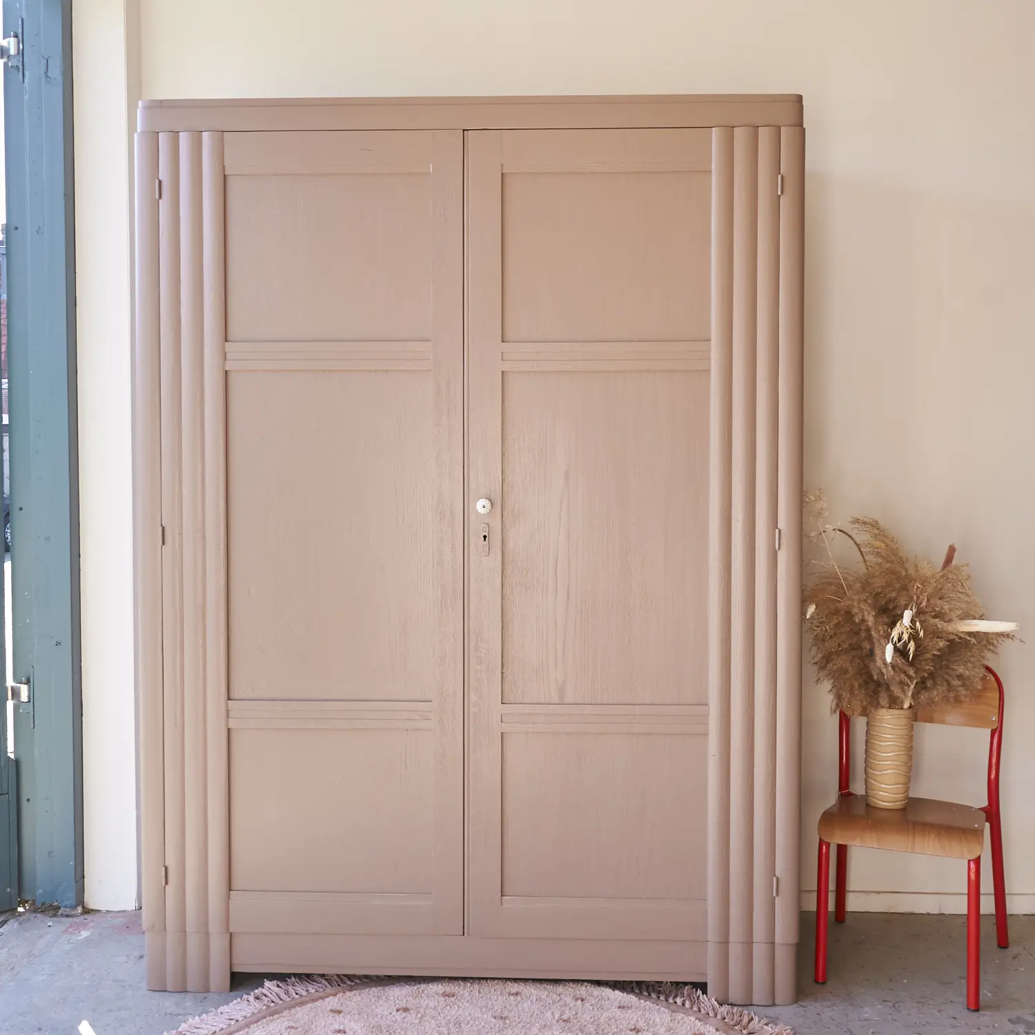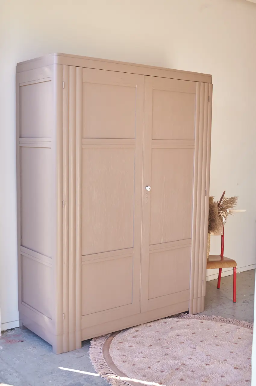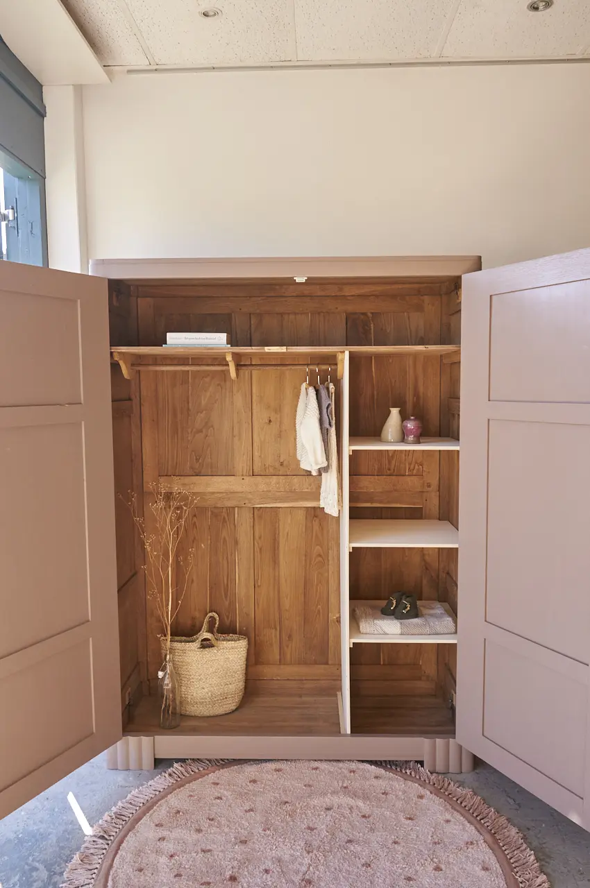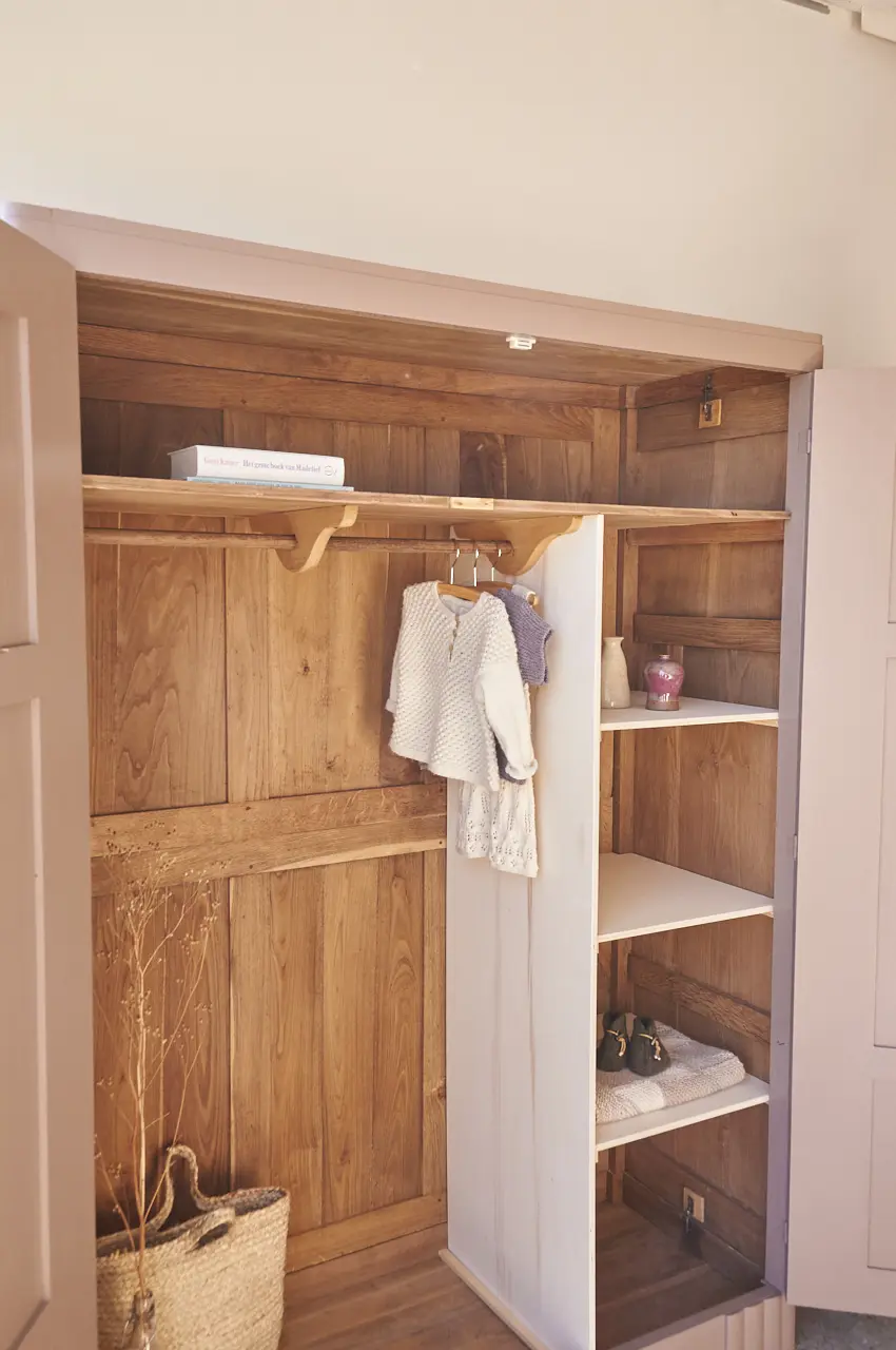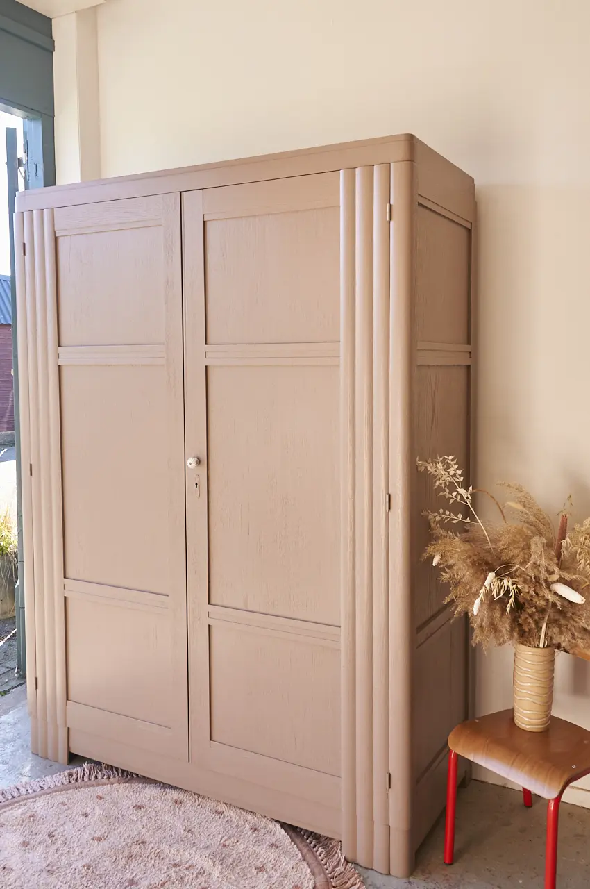 Wat een plaatje. Een mooie tweedeurs demontabele kast, met prachtige lijnen! De rechte hoeken in combinatie met de halfronde details, zo mooi! Deze fijne combinatie hebben wij nog niet eerder gehad, wat ons betreft een unieke kast dus! We hebben deze kast grondig schoongemaakt en behandeld tegen houtworm. Het hout is van mooie kwaliteit. Bovenin de kast zit over de hele breedte de originele plank en daaronder een roede. We hebben een nieuw tussenschot geplaatst en planken toegevoegd. Zo is er plek om kleding op te hangen en het een en ander te stapelen. Genoeg ruimte! De kast hebben we in onze mooie kleur Hazel geschilderd, een zachte, rustige kleur. We hebben hem afgewerkt met bronzen knoppen en nu is deze kast weer helemaal klaar voor een nieuwe plek. De rechterdeur sluit met een magneetje.