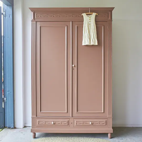Uiteindelijke kozen we ervoor de kast in onze kleur ‘Vijg’ te schilderen. Een oud roze met een warme ondertoon. Vijg is een krachtige kleur, maar niet te schreeuwerig. Deze kleur geeft veel warmte aan een meubel. Een kleur die we al een tijdje in ons assortiment hebben en een die nog wel even zal bijlven! Wij zijn erg blij met deze kleur. Een prachtige combinatie met alle versieringen van de kast zelf. De linker deur sluit met een schuifje van binnen en de rechter deur met een magneetje. En nu is zij weer helemaal klaar voor een nieuwe plek!