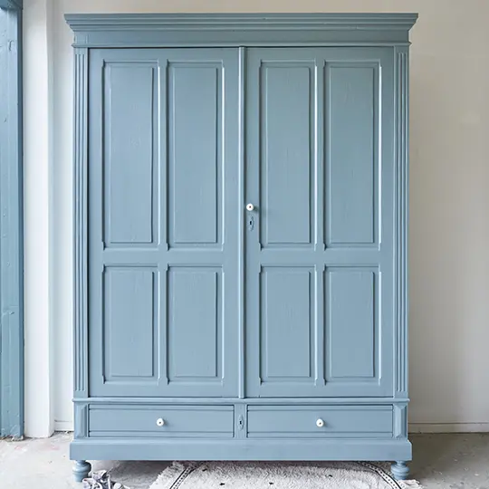 Wauw! Wat een prachtige kast is dit! Echt een plaatje weer. Deze demontabele grote kast hebben wij goed onder handen genomen. Natuurlijk is de kast kaal gemaakt, hebben we haar grondig schoongemaakt en is ze behandeld tegen houtworm. Vervolgens heeft deze kast de nodige reparaties gehad. De deuren klemde behoorlijk maar gelukkig sluiten de deuren nu weer helemaal goed! En de kast heeft een nieuwe kroon gekregen. Ze heeft er al een behoorlijk leven op zitten, wij vinden dat niet erg. Het geeft de kast een prachtig uiterlijk. Wij hebben een nieuwe indeling gemaakt, fijn een roede en breede planken. Heel praktisch vinden wij, genoeg hang- en legruimte nu! Uiteindelijke kozen we ervoor de kast in onze kleur ‘Bron’ te schilderen. Bron is een rustige, grijsblauwe kleur. Elk meubel krijgt een hele fijne zachte uitstraling zodra deze een likje Bron heeft gekregen. Zelfs grote en hoge kasten worden door Bron minder log en zwaar in de ruimte. Bron combineert goed met een druk behang, maar komt ook perfect tot zijn recht in combinatie met een lichte muur. Een hele fijn rustige blauwtint! De linker deur sluit met een schuifje van binnen en de rechter deur met een magneetje. De lades gaan soepel open en dicht. En nu is zij weer helemaal klaar voor een nieuwe plek! Klik HIER voor het fijne stippenkleed.