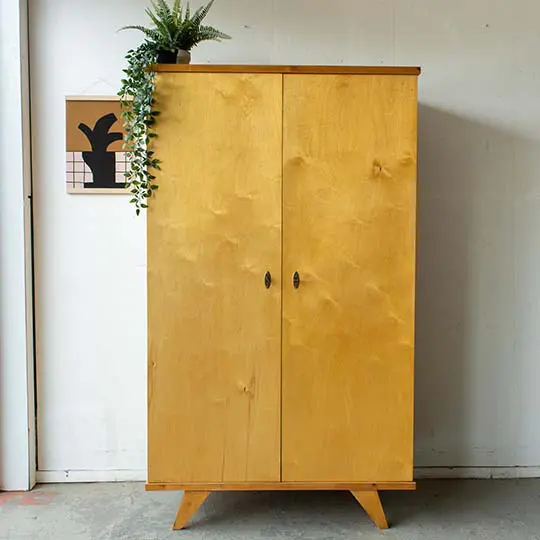 Een prachtige vintage kledingkast in retrostijl. We vonden hem zó mooi, dat we hem hebben gelaten zoals hij was. We hebben hem natuurlijk wel helemaal nagelopen en gerepareerd waar nodig. Daarna is hij grondig schoongemaakt en is het hout behandeld met een voedende olie. Daarna hebben we hem nieuwe plankjes houten plankjes gegeven. Een geweldige kast met voldoende ruimte voor hang- en legkleding. De twee deuren zijn te openen en sluiten door middel van de originele sleutels. Op de linker deur zit onderaan een kleine beschadiging. Wij vonden dit niet storend en hebben het daarom zo gelaten. En zo is deze geweldige kast weer helemaal klaar voor gebruik! De kast is demontabel, dus hij kan ook op een bovenverdieping geplaatst worden!