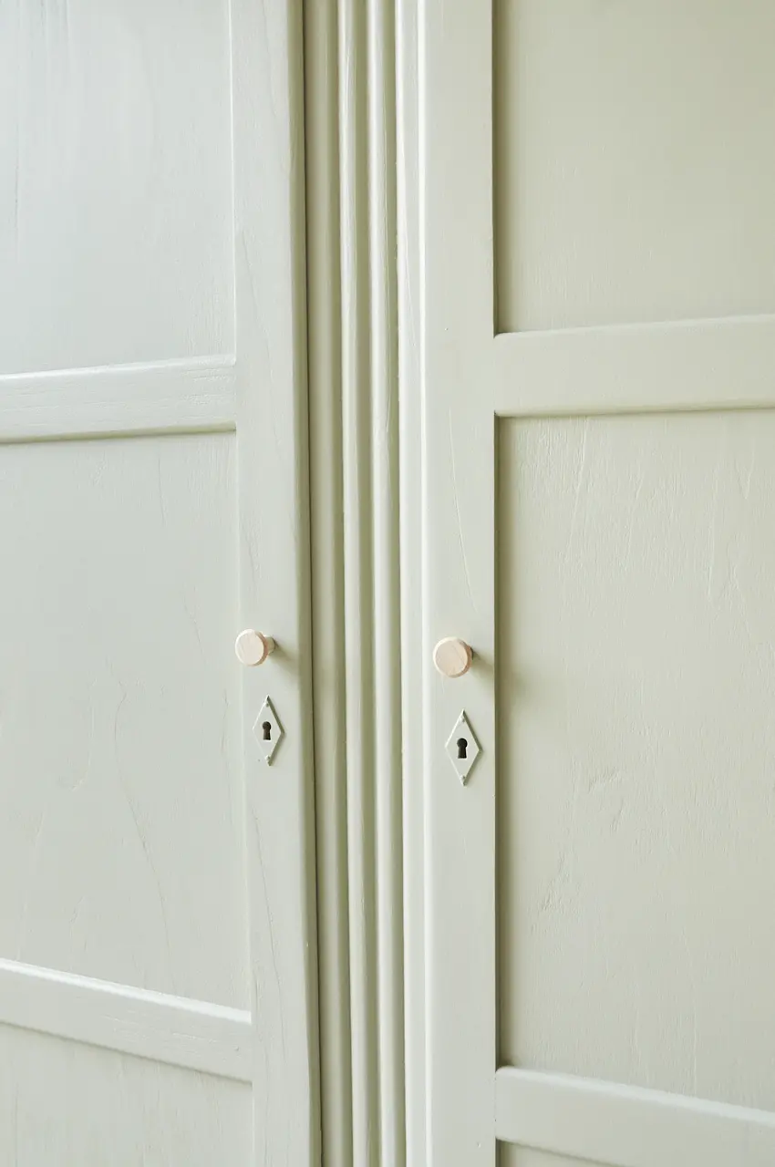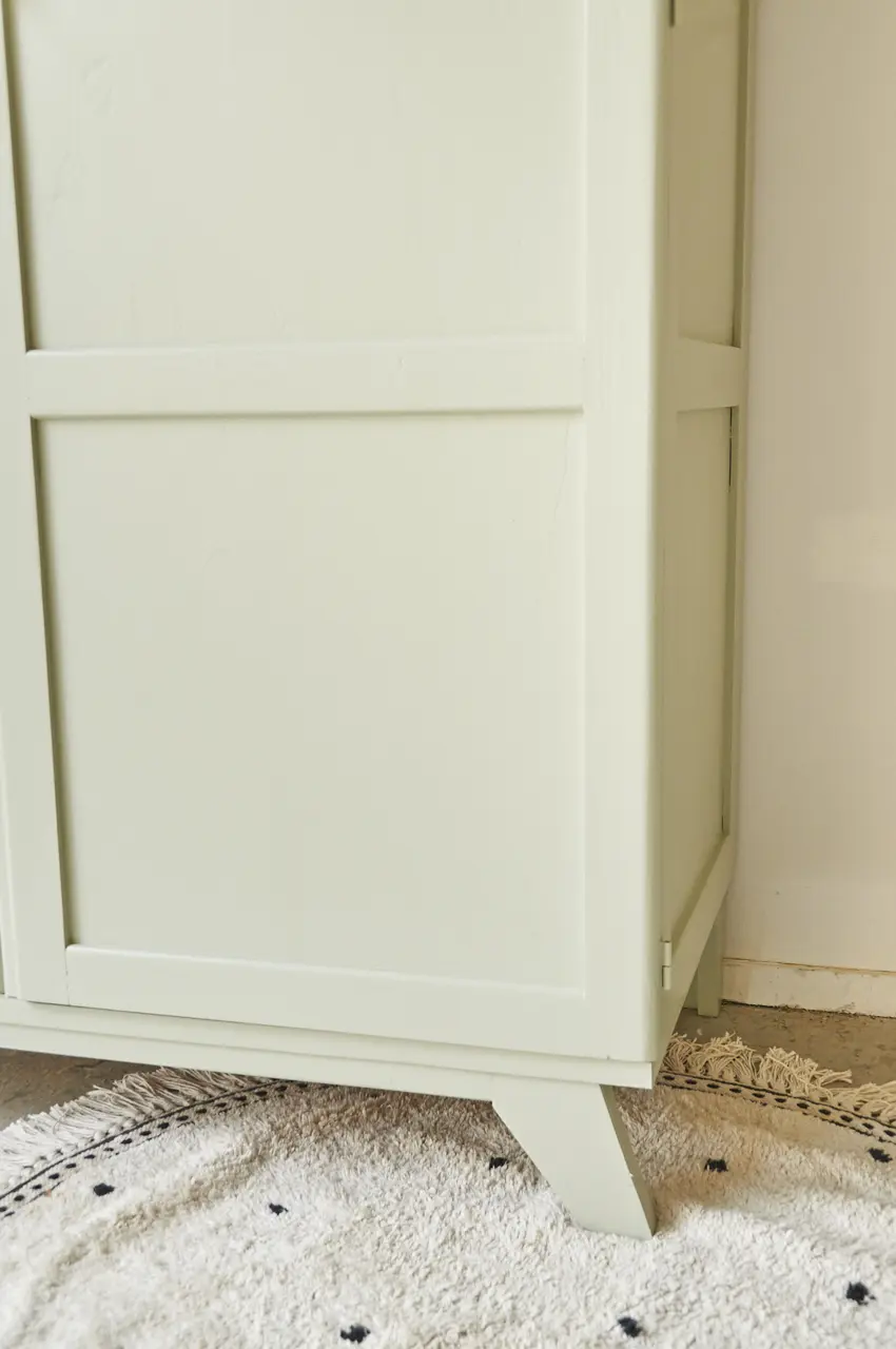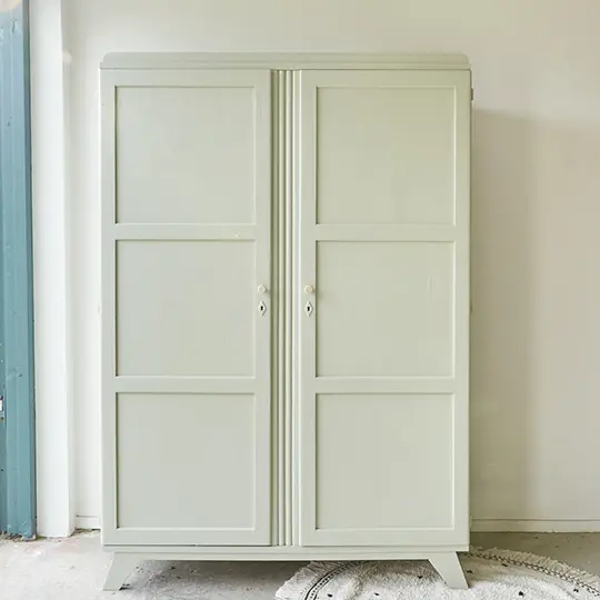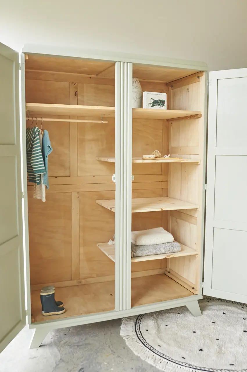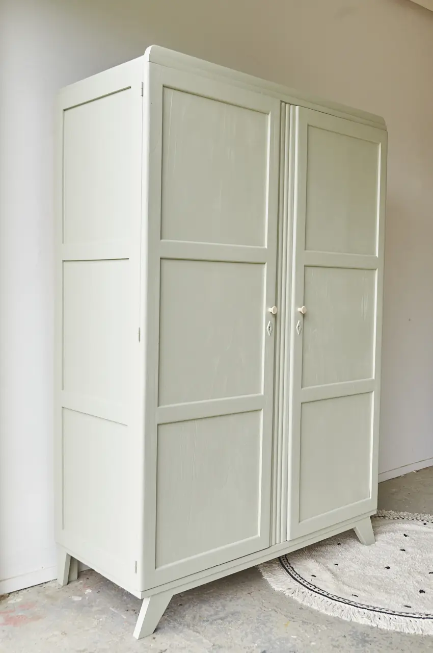 Een leuke retro kledingkast uit Belgie. Wij worden zelf altijd heel blij van schuine pootjes. Het maakt de kast meteen heel speels, in combinatie met de strakke paneel deuren echt een plaatje! We hebben de kast grondig schoongemaakt, behandeld tegen houtworm en helemaal nagelopen. De indeling is nieuw. Nu een geweldige kast met voldoende ruimte voor hang- en legkleding. Wij kozen ervoor hem in deze prachtige kleur Voorjaar te schilderen. Voorjaar is zo’n fijne, frisse en zachte groene kleur! Hij heeft niet voor niets deze naam gekregen, elk meubel en elke kamer fleurt helemaal op door deze lichtgroene kleur. Ben je op zoek naar een iets donkerdere groentint? Kijk dan eens naar onze kleur Artisjok, waarschijnlijk is deze dan perfect voor jou! Beide deuren sluiten door middel van een magneetje. En zo is deze leuke kast weer helemaal klaar voor een nieuwe plek.