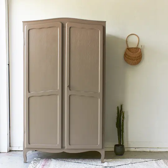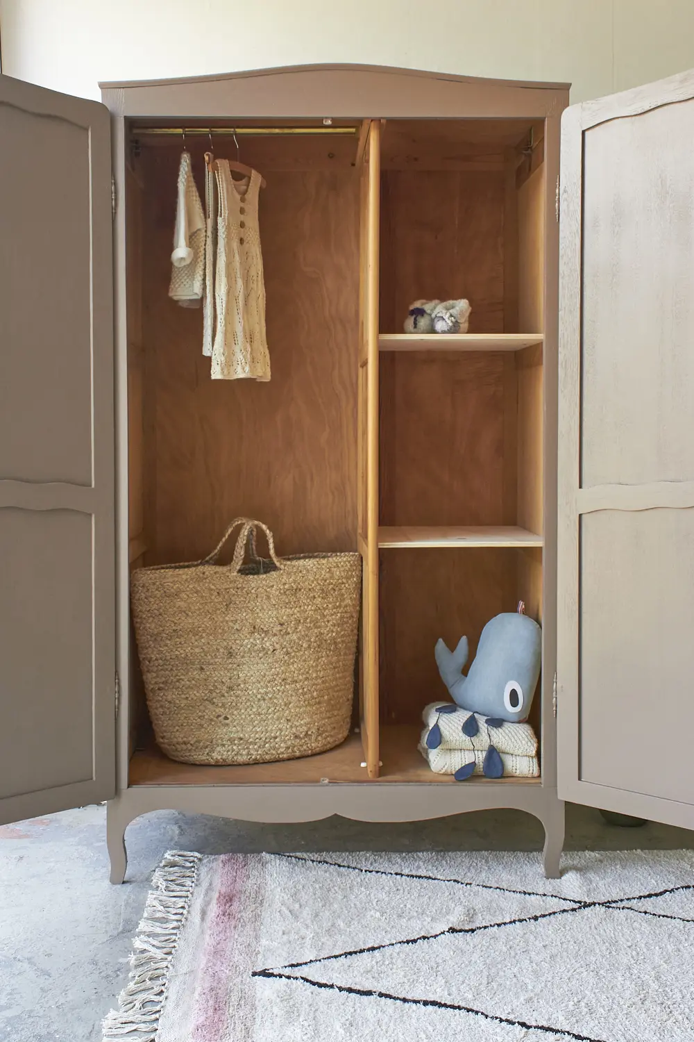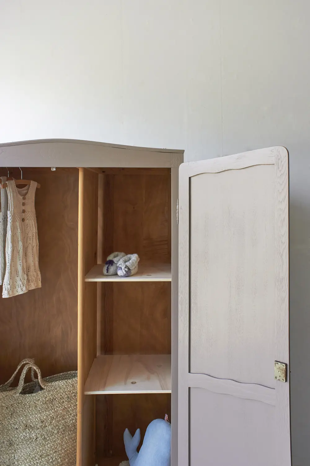 Wat zijn ze toch altijd fijn, deze kasten. Allemaal net een beetje anders. Niet te groot, maar wel groot genoeg voor alle kinderkleding en ook nog eens demontabel! Deze kast til je daardoor gemakkelijk naar boven. Nadat hij terugkwam van de zandstralers hebben we hem grondig schoongemaakt en behandeld tegen houtworm. De indeling hebben we gedeeltelijk vervangen en hij heeft nu een fijne roede en 2 legplanken. Voor een kleine meerprijs kunnen we een extra plank plaatsen. De deuren sluiten met de originele sleutel en 2 schuifjes. We hebben hem uiteindelijk onze kleur hazel gegeven, een mooie mix van roze en beige. Een hele fijne zachte kleur, goed te combineren, niet te zoet en ook zeker niet te saai. En nu is deze kast helemaal klaar voor een nieuwe plek!