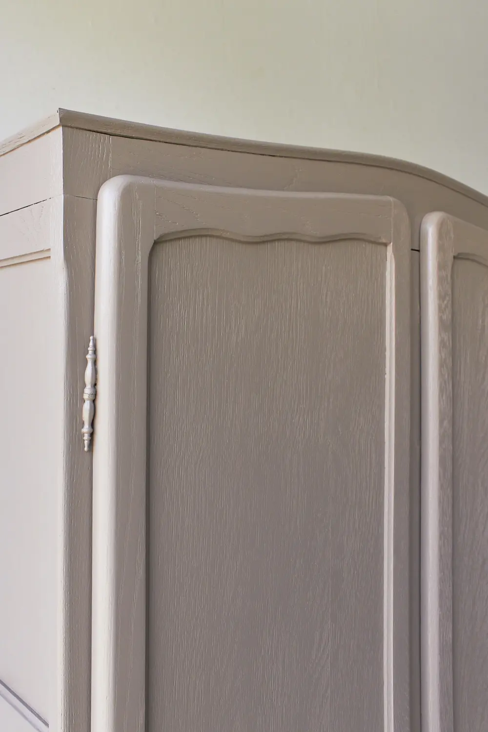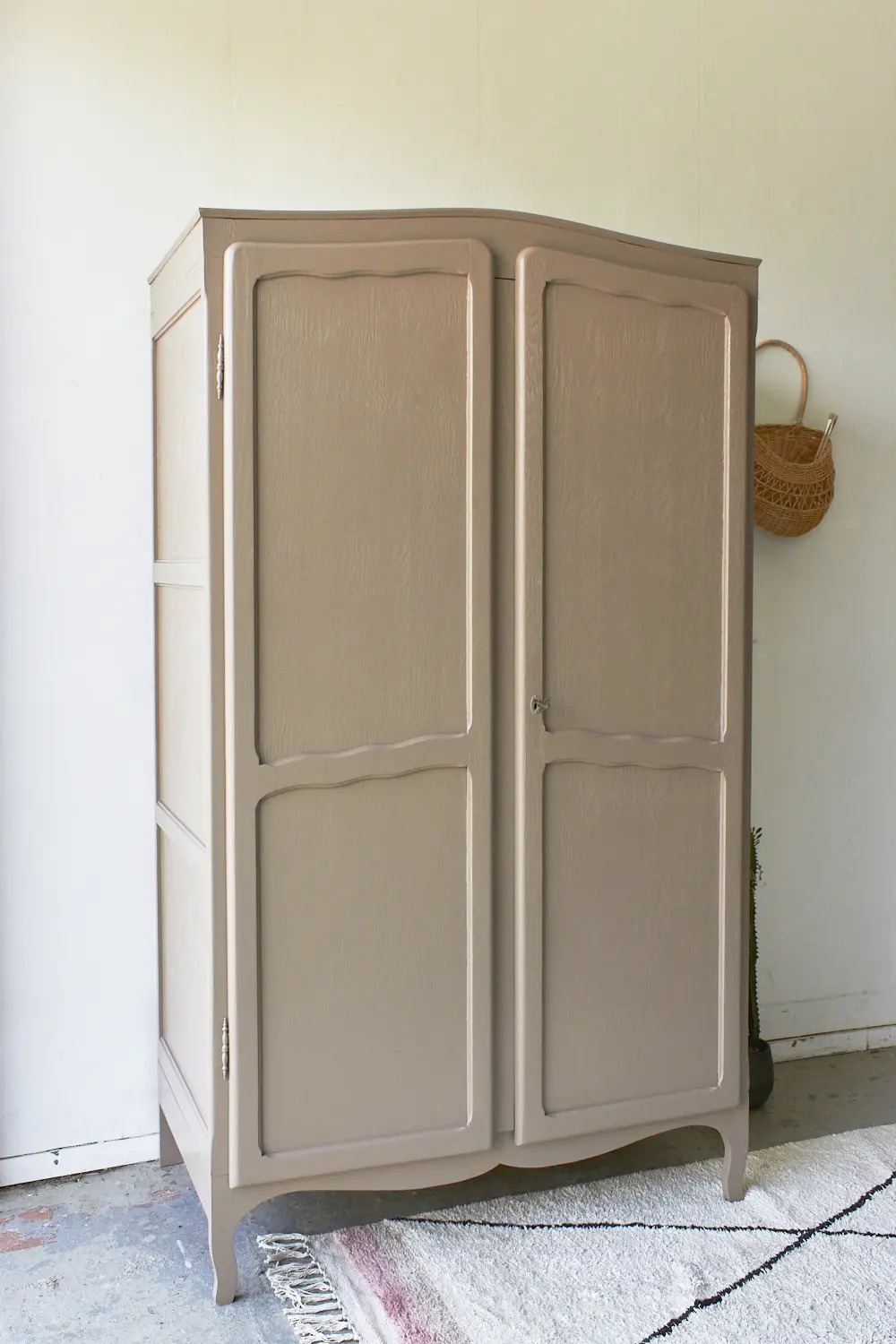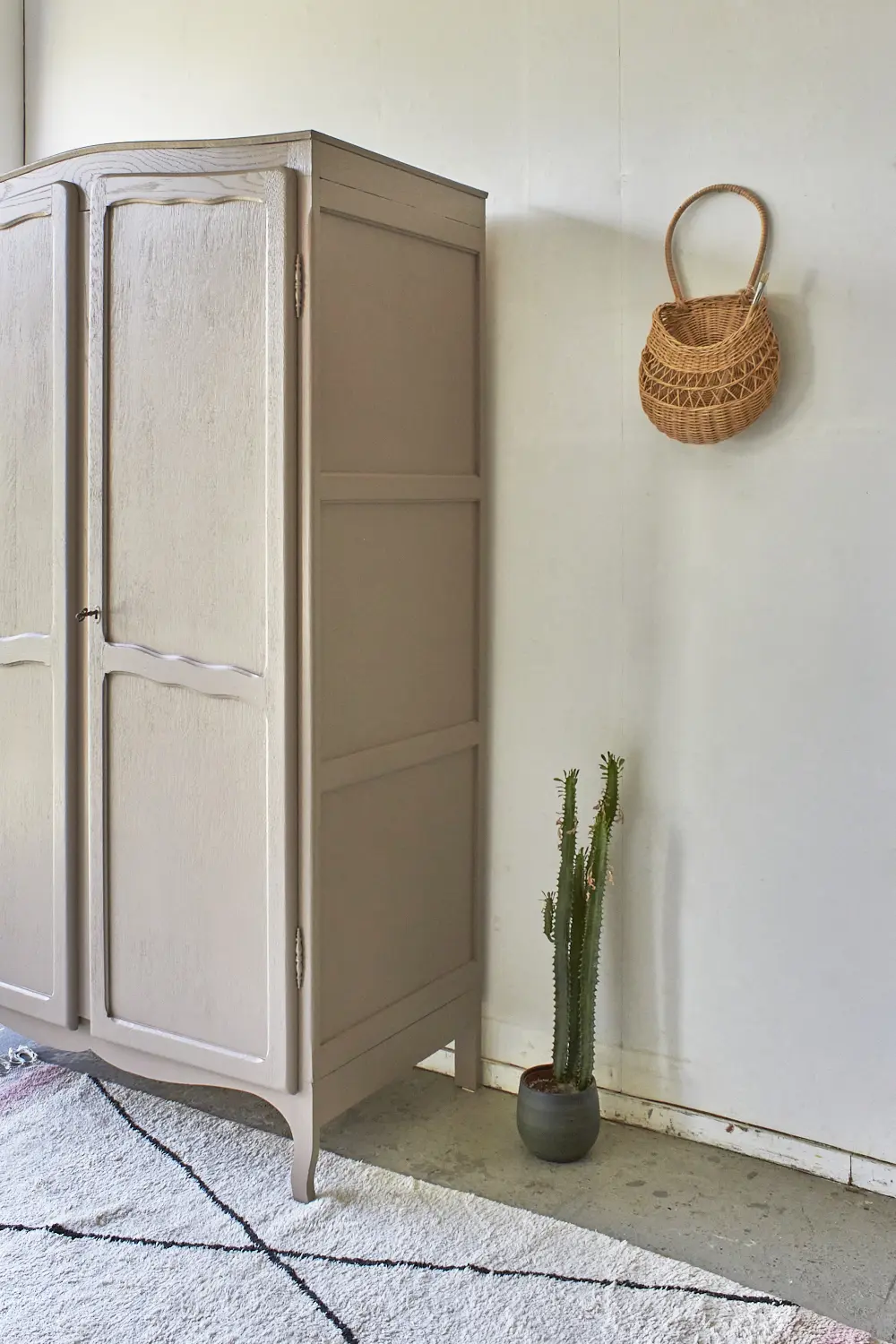 Wat zijn ze toch altijd fijn, deze kasten. Allemaal net een beetje anders. Niet te groot, maar wel groot genoeg voor alle kinderkleding en ook nog eens demontabel! Deze kast til je daardoor gemakkelijk naar boven. Nadat hij terugkwam van de zandstralers hebben we hem grondig schoongemaakt en behandeld tegen houtworm. De indeling hebben we gedeeltelijk vervangen en hij heeft nu een fijne roede en 2 legplanken. Voor een kleine meerprijs kunnen we een extra plank plaatsen. De deuren sluiten met de originele sleutel en 2 schuifjes. We hebben hem uiteindelijk onze kleur hazel gegeven, een mooie mix van roze en beige. Een hele fijne zachte kleur, goed te combineren, niet te zoet en ook zeker niet te saai. En nu is deze kast helemaal klaar voor een nieuwe plek!