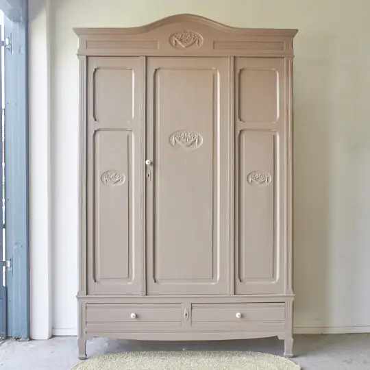 Onze kleur Hazel is een mooie keuze voor deze kast. Het houtsnijwerk komt nog beter tot zijn recht in deze zachte mix van roze en beige. Wat een mooi resultaat!