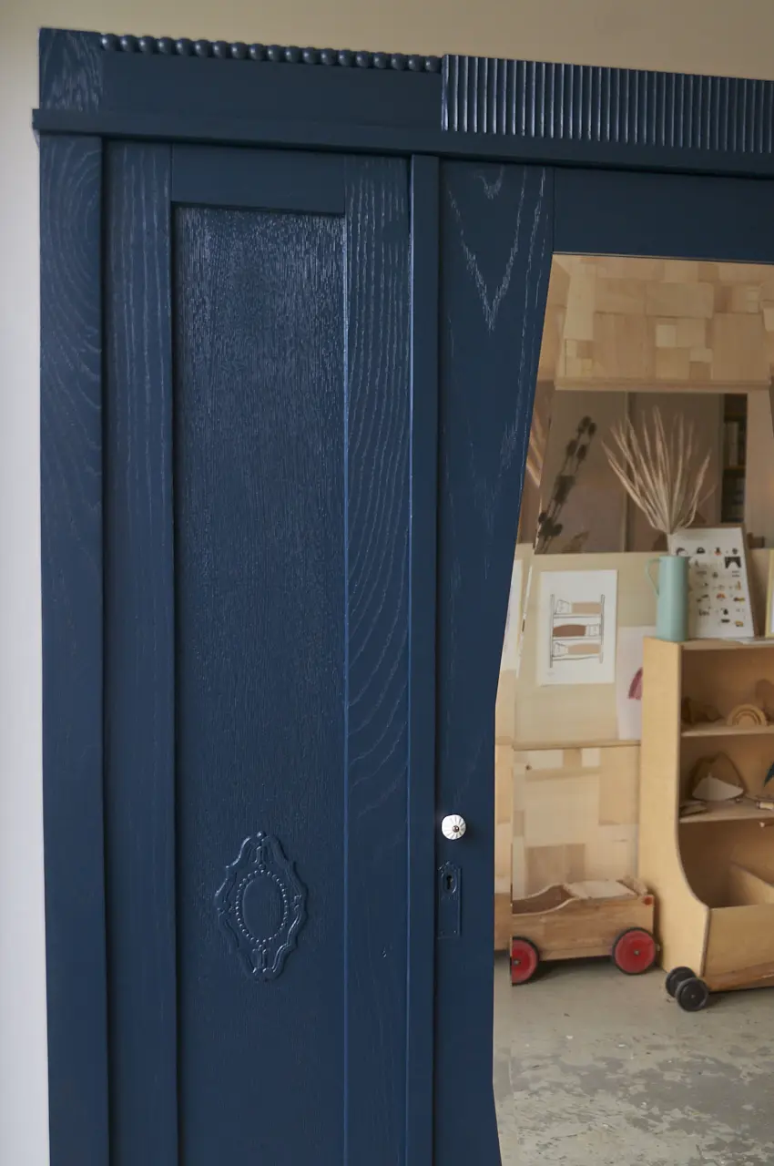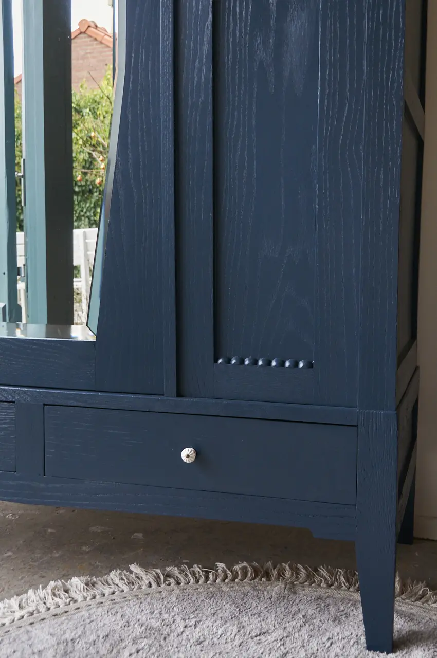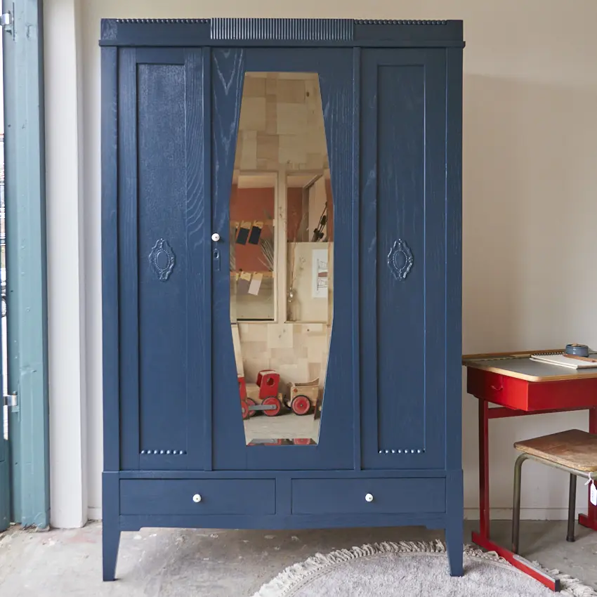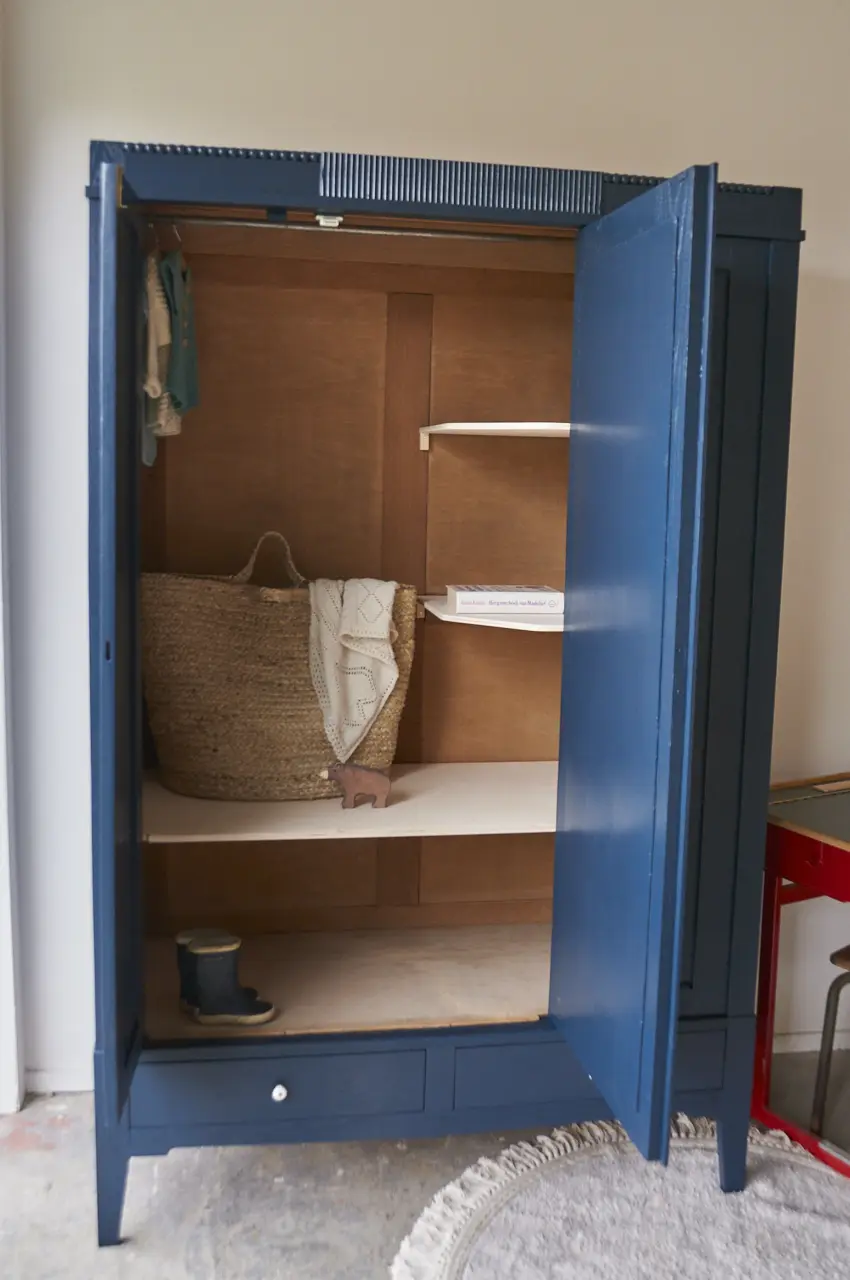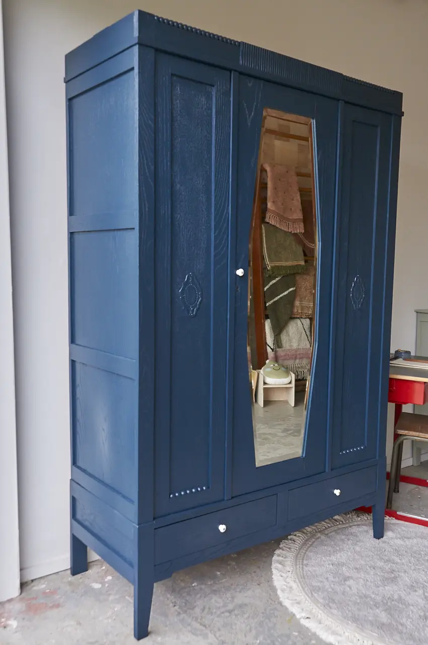 Wat een prachtige kast. Zo mooi, het houtsnijwerk. In onze kleur Nacht. Nacht is een hele warme, diepe, donkerblauwe kleur. Heel stijlvol en stoer! Deze kleur geeft heel veel sfeer en warmte en is mooi te combineren met bijvoorbeeld Bron of onze zachte, lichte kleur Maan. Een meubel in de kleur Nacht geeft soms bijna een koninklijk sfeertje, heel tof! Vind je Nacht toch net niet donker genoeg, dan is Kraai (onze net-niet zwart) waarschijnlijk jouw perfecte kleur. Wij hebben de kast natuurlijk grondig schoongemaakt en behandeld tegen houtworm. De indeling van de kast hebben we er zelf in gemaakt. De kast is volledig demontabel, dus zal makkelijk naar boven kunnen. We hebben er voor gezorgd dat de deuren niet meer klemmen en dat de lades soepel open en dicht gaan. Het linker deurtje sluit met een schuifje en de spiegeldeur met een magneetje. De rechter deur is geen deur maar een vast paneel. Na de laag grondverf besloten we de kast in onze kleur ‘Nacht’ te schilderen. De kast hebben we afgewerkt met witte porseleinen knopjes. En zo is deze kast weer helemaal klaargemaakt voor een nieuwe plek!