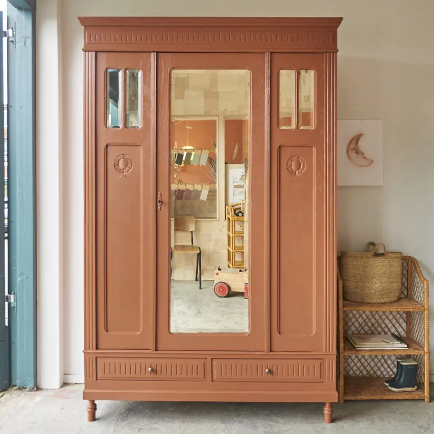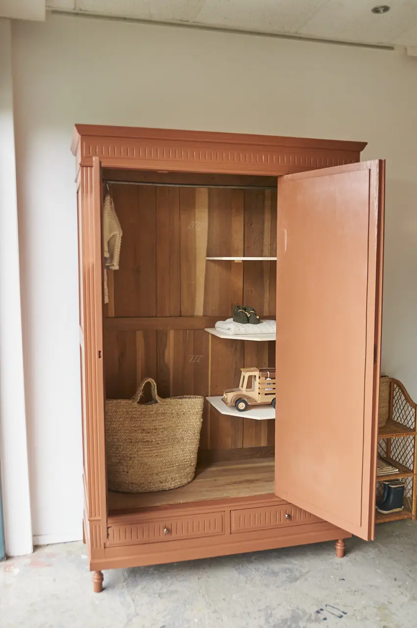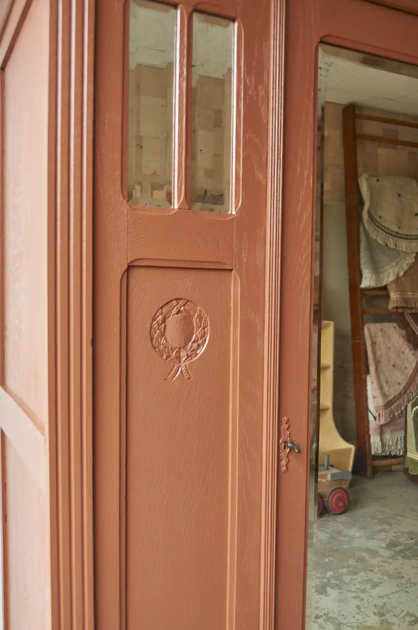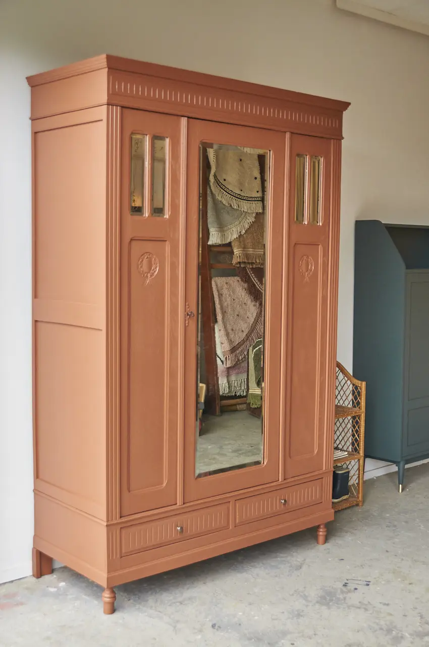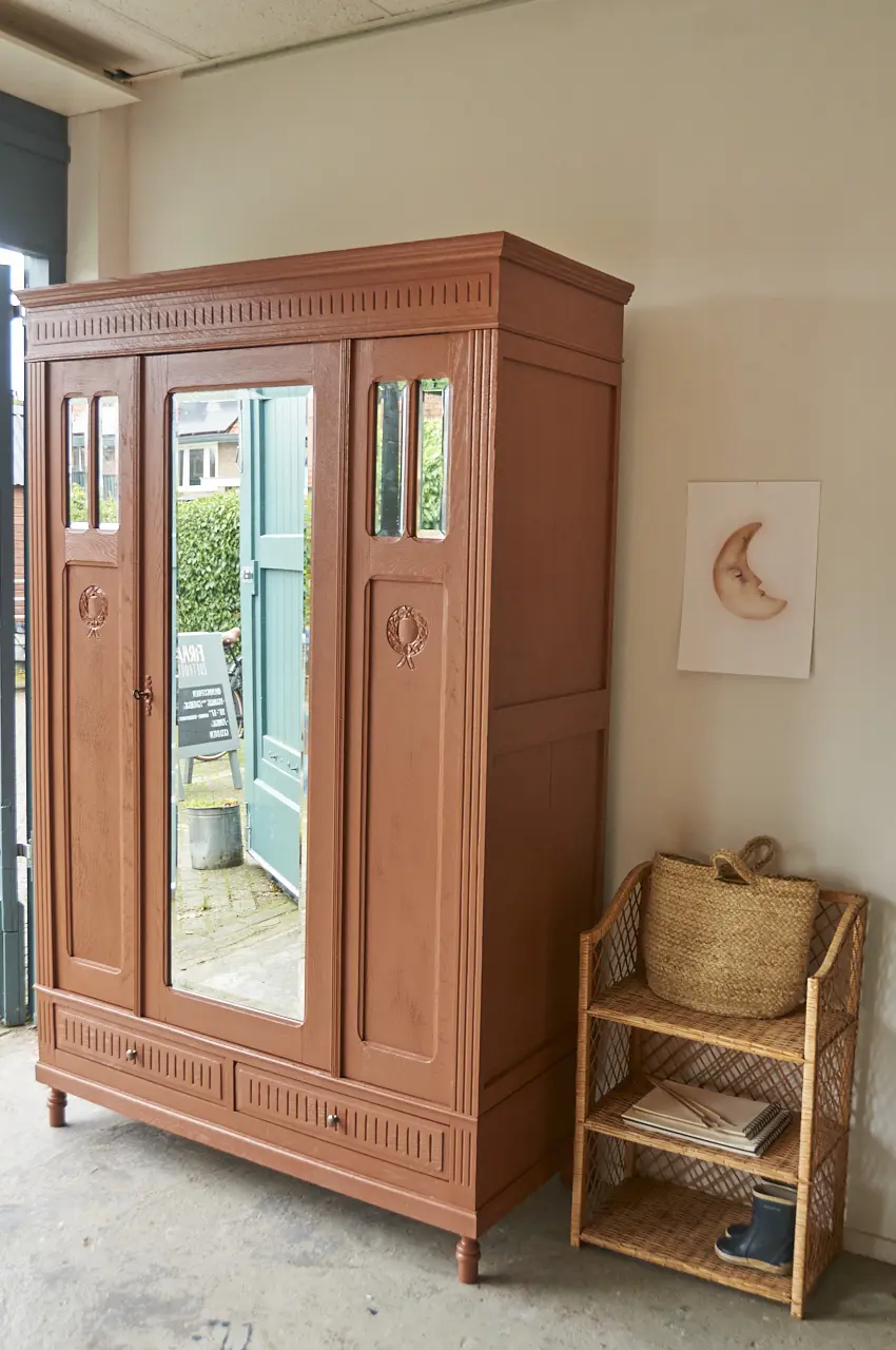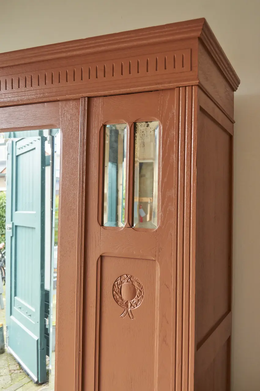 Wat een mooie, klassieke spiegelkast is dit. Zo mooi, al dat houtsnijwerk. We hebben hem grondig schoongemaakt en behandeld tegen houtworm. Toen we de kast in elkaar hadden gezet begonnen we aan de nodige reparaties. Beide deurtjes kunnen weer open en dicht zonder dat ze klemmen. Vervolgens gingen we verder met de indeling. De indeling is helemaal nieuw. Wij hebben gekozen voor onze kleur ‘Roest’. Na het schilderwerk hebben we de spiegel er terug in geplaatst en is de kast afgewerkt met bronzen knoppen. Het linker deurtje sluit met een schuifje en de spiegeldeur met een sleutel. De rechter paneel is een vast schot en kan niet open. Aan de rechter zijkant zit een scheur in een paneel, wij hebben dit zo gelaten. Dat maakt de kast ook vintage. De kast is klaar voor een nieuwe plek. De kast is volledig demontabel, dus zal makkelijk naar boven kunnen.