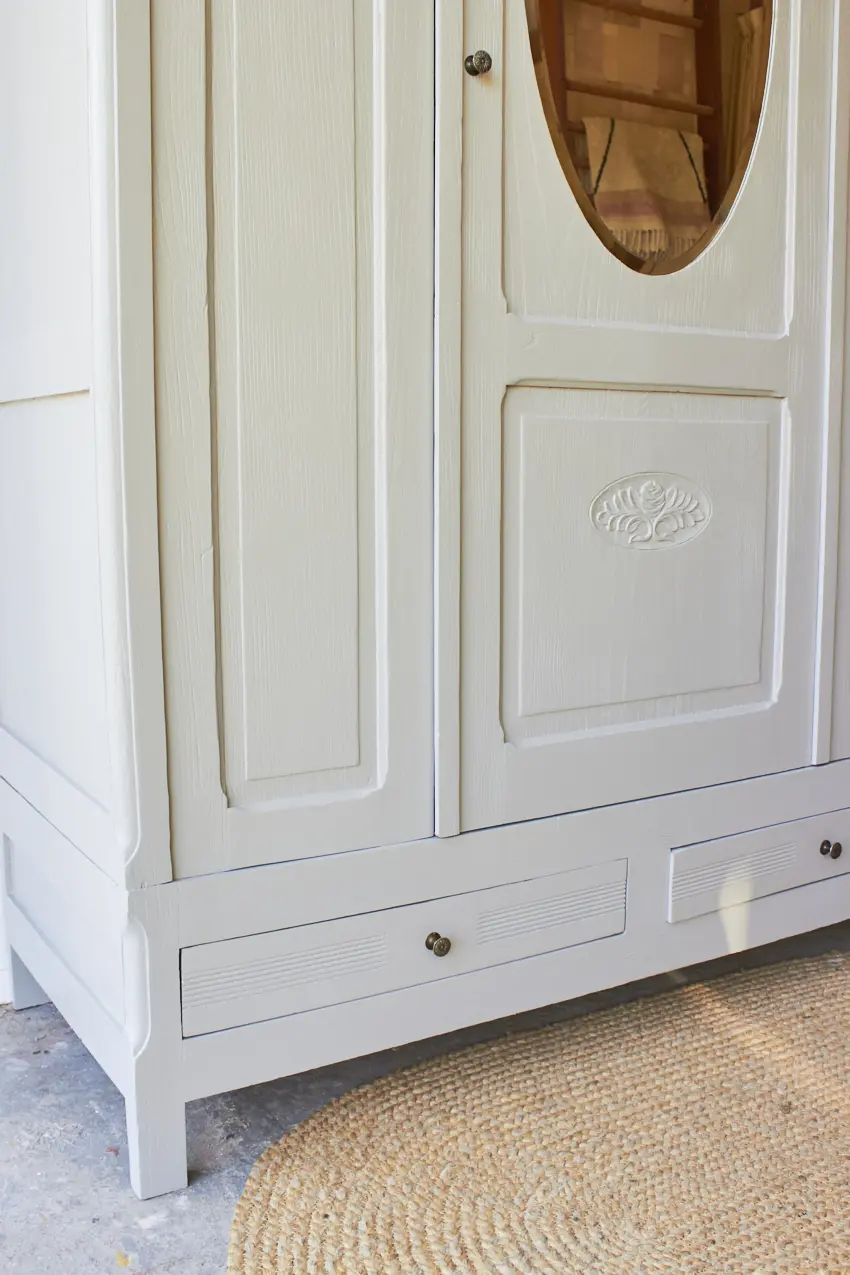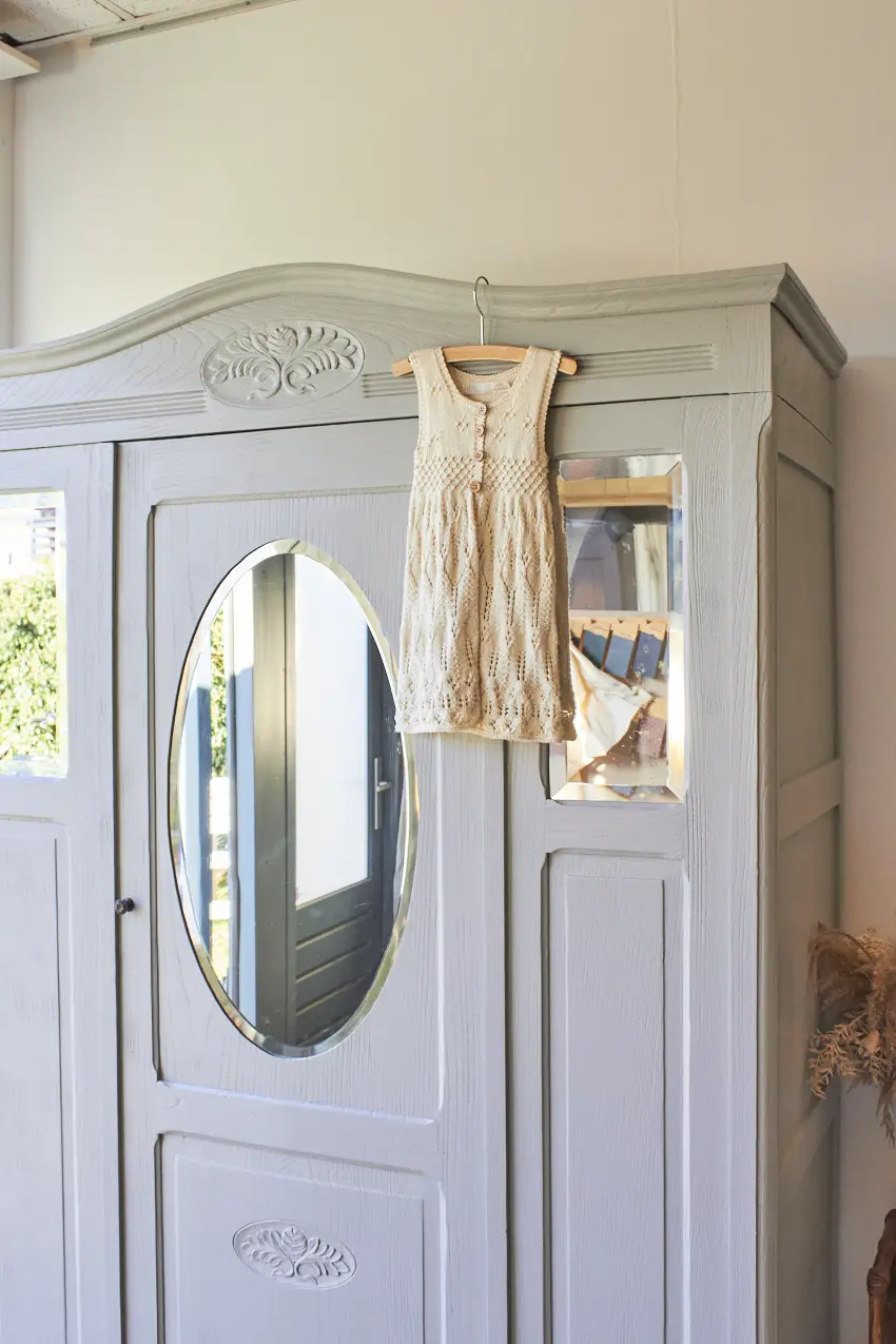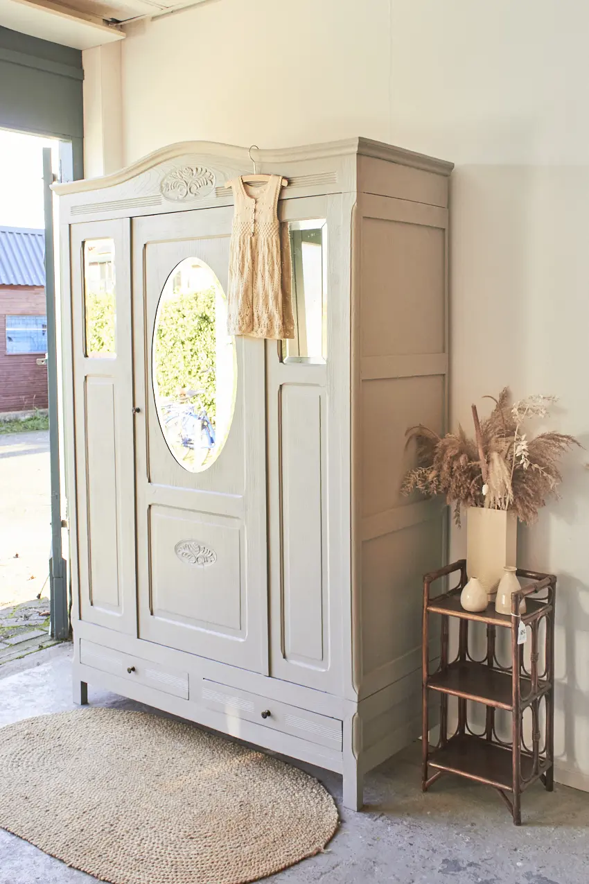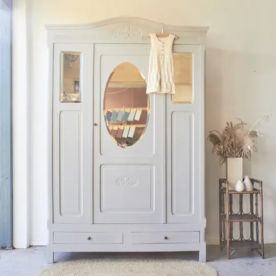 Wauw, een sierlijke spiegelkast in onze kleur Maan. Een hele fijne kast voor op de kinderkamer met veel mooie details. Zoals het houtsnijwerk en de geslepen vintage spiegels en de ovale spiegel in het midden. Het fijne aan deze kast is ook dat de kast helemaal demontabel is en dus gemakkelijk naar boven kan.