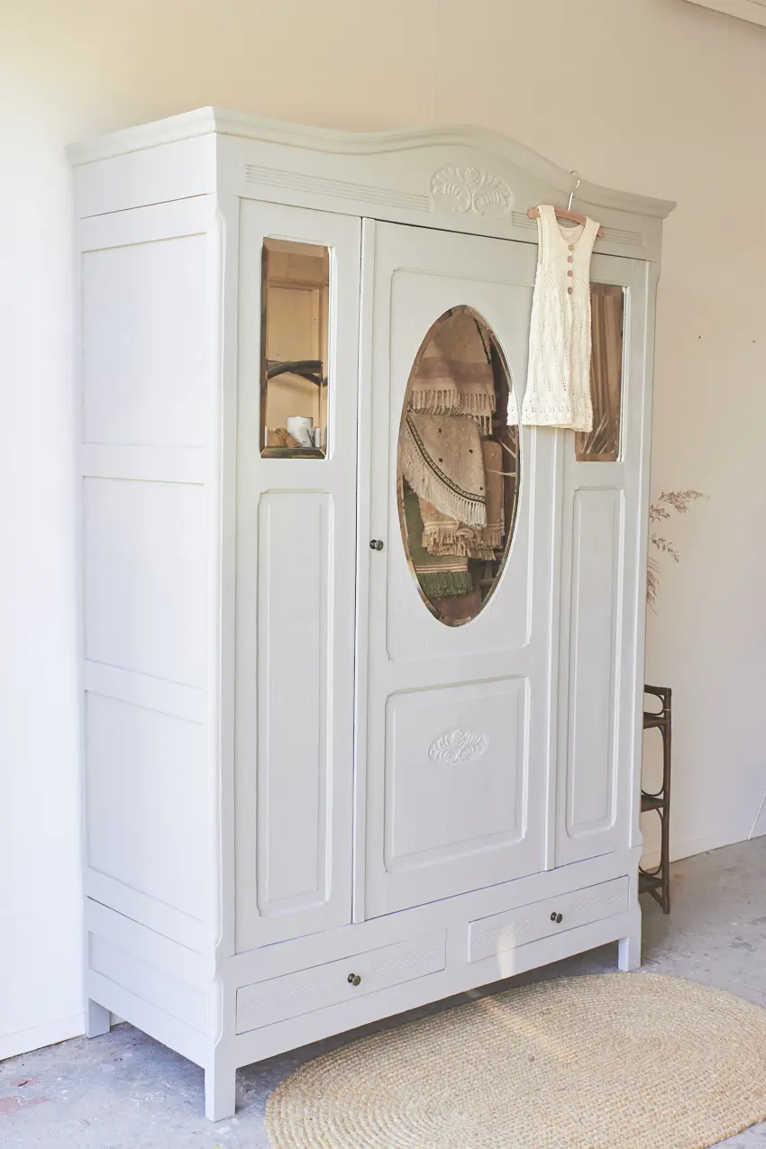 Deze kast heeft er al een lang leven opzitten. Er zitten wat mooie, karakteristieke vlekjes op de spiegels, wat hem dat mooie vintage uiterlijk geeft.