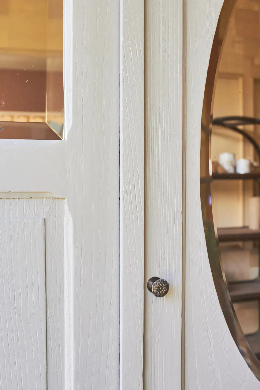 De indeling is nieuw en op maat gemaakt. Genoeg ruimte voor hang en leg. Het rechter en linker paneel zit vast. De spiegeldeur in het midden kan open en dicht. Via de spiegeldeur kun je gemakkelijk bij de ruimte achter de panelen. We hebben ervoor gekozen om hem in onze kleur Maan te schilderen en wat staat het hem goed! Een echte allemansvriend, onze kleur Maan. Maan is een heel lichtgrijze kleur, maar wel met een fijne warme ondertoon. En dat maakt hem heel speciaal. Een kleur die goed combineert met iedere andere kleur uit onze collectie. Ideaal!