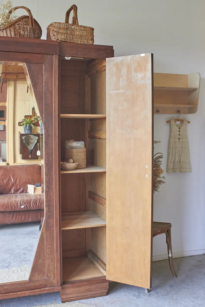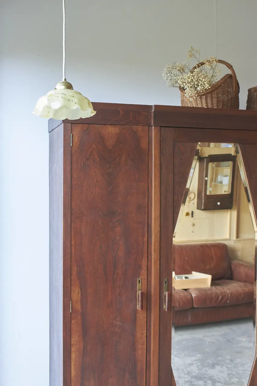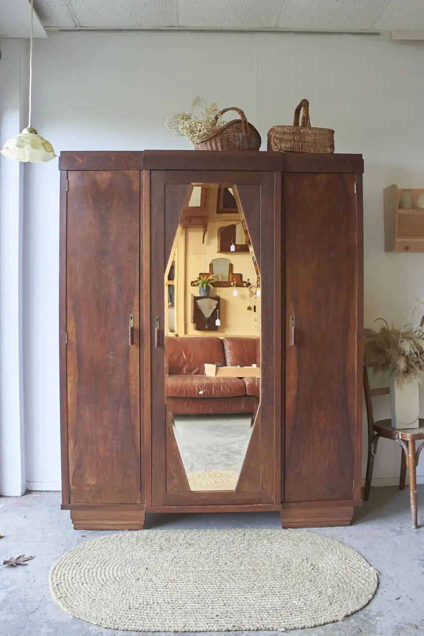 Wauw, wat een cadeau is deze prachtige demontabele spiegelkast! We hebben ze niet vaak, kasten die nog in zo’n mooie staat zijn dat we ze niet hoeven te schilderen. En dan is het ook nog zo’n mooi exemplaar met drie deuren en een geslepen spiegel, met van die oude vlekjes. De jaar kringen op de deuren zijn echt prachtig en zelfs alle handgreepjes zijn origineel. Wat een plaatje! Aan de rechterkant zie een een aantal krassen, wij vinden dit niet erg, het is tenslotte een hele oude kast.