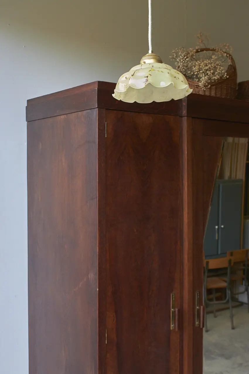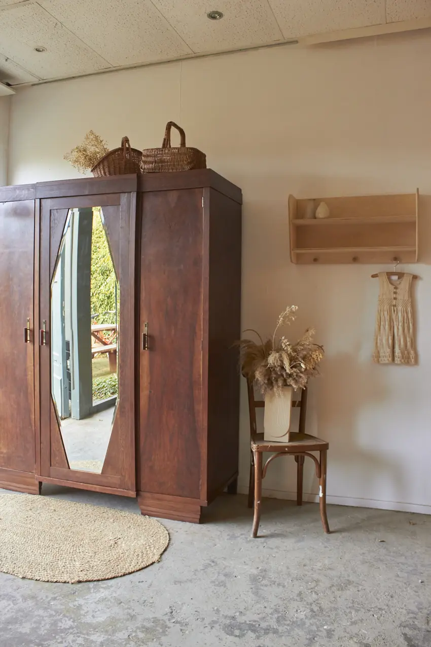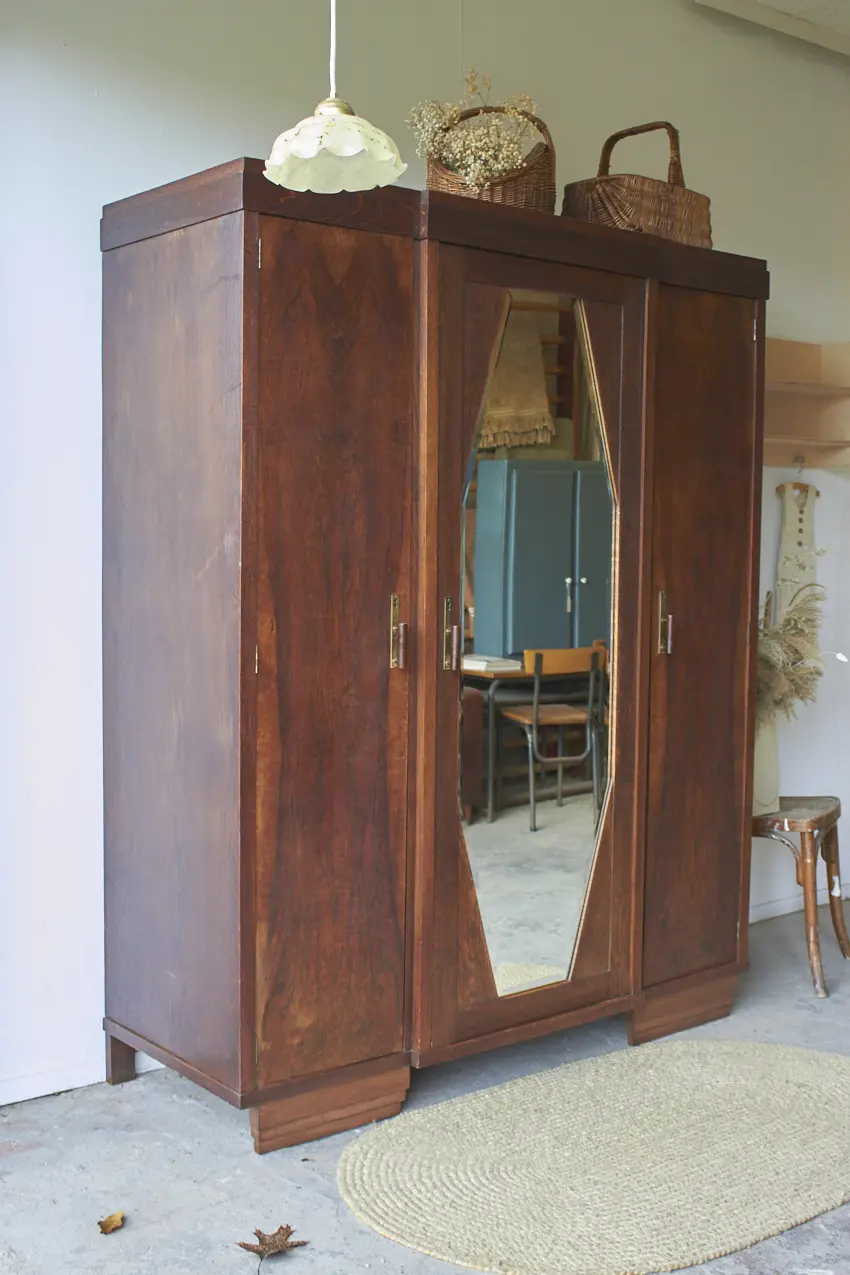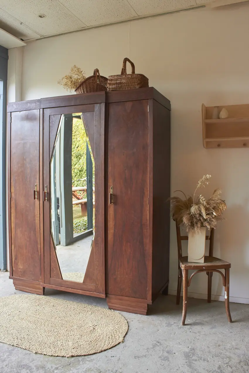 Wauw, wat een cadeau is deze prachtige demontabele spiegelkast! We hebben ze niet vaak, kasten die nog in zo’n mooie staat zijn dat we ze niet hoeven te schilderen. En dan is het ook nog zo’n mooi exemplaar met drie deuren en een geslepen spiegel, met van die oude vlekjes. De jaar kringen op de deuren zijn echt prachtig en zelfs alle handgreepjes zijn origineel. Wat een plaatje! Aan de rechterkant zie een een aantal krassen, wij vinden dit niet erg, het is tenslotte een hele oude kast.
