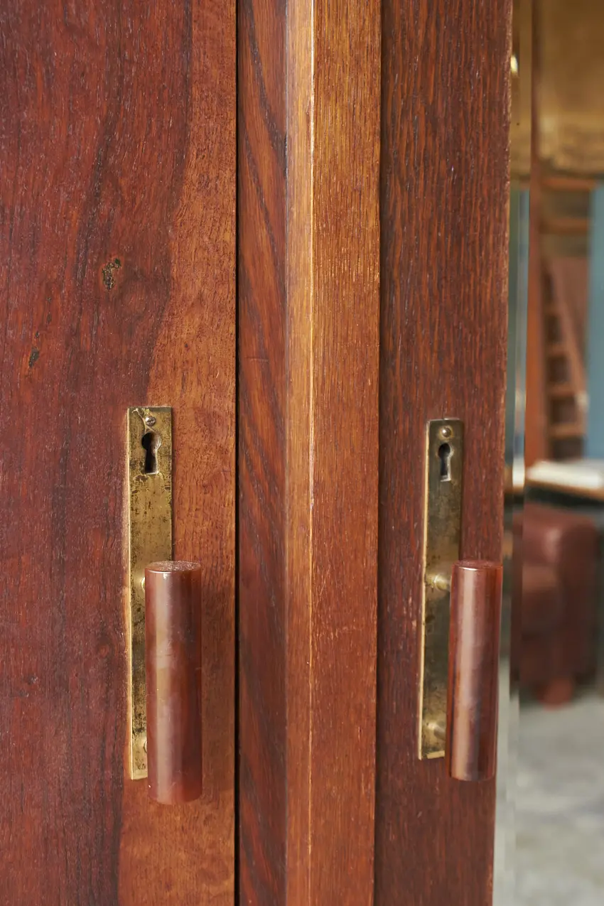 We hebben alle onderdelen goed schoongemaakt en behandeld met een anti-houtworm spray. Zo zijn we er zeker van dat die niet meer leven. Hij is demontabel en kan helemaal uit elkaar gehaald worden. Heel fijn als je hem moet verplaatsen of naar boven wilt tillen via de trap. We hebben hem helemaal nagelopen en we hebben hem voorzien van een verse, nieuwe laag meubelolie. De indeling is origineel van prachtig stevig eikenhout. We kunnen er nog een nieuwe plank in maken onder de roede.