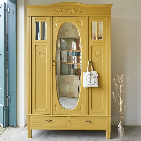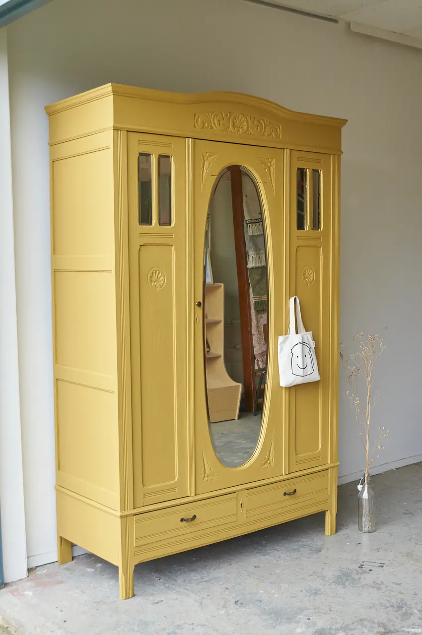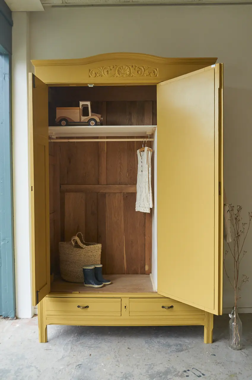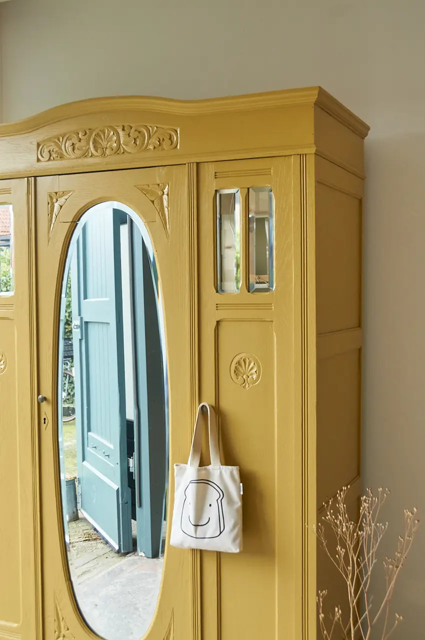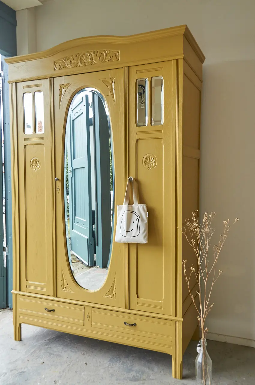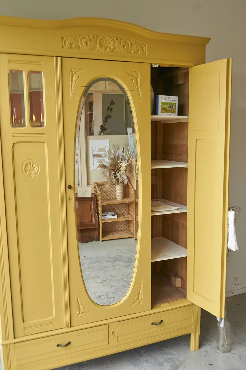 Een grote, stevige, eikenhouten driedeurs spiegelkast. De kast hebben we grondig schoongemaakt en behandeld tegen houtworm. Toen de kast eenmaal in elkaar gezet was begonnen we aan de indeling en de nodige reparaties. Een van de pootjes moest wat verhoogd, de deuren zijn wat aangepast zodat ze nu soepel open en dicht gaan. De indeling is volledig nieuw, super fijn zowel planken als een roede! We kozen ervoor de kast in onze mooie Saffraan te schilderen. De originele handgrepen hebben we op de lades terug geplaatst en op de deuren hebben we bronzen knoppen gezet die daar goed bij combineren. De linker deur sluit van binnen met een schuifje, de middelste en de rechter deur sluiten met een magneetje. Deze kast is weer helemaal klaar voor een nieuwe plek!