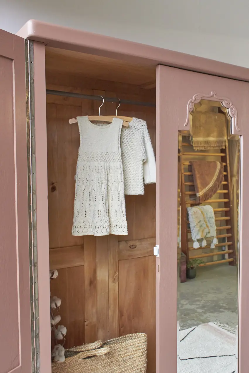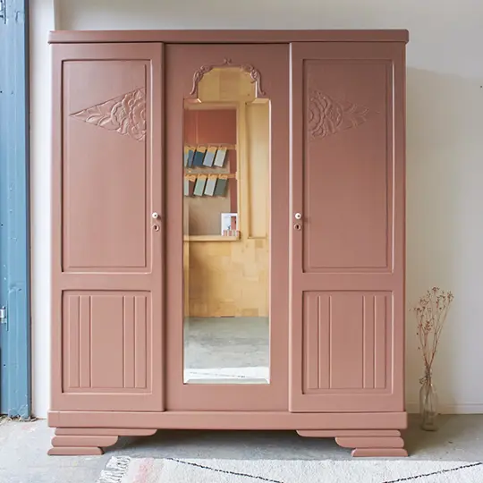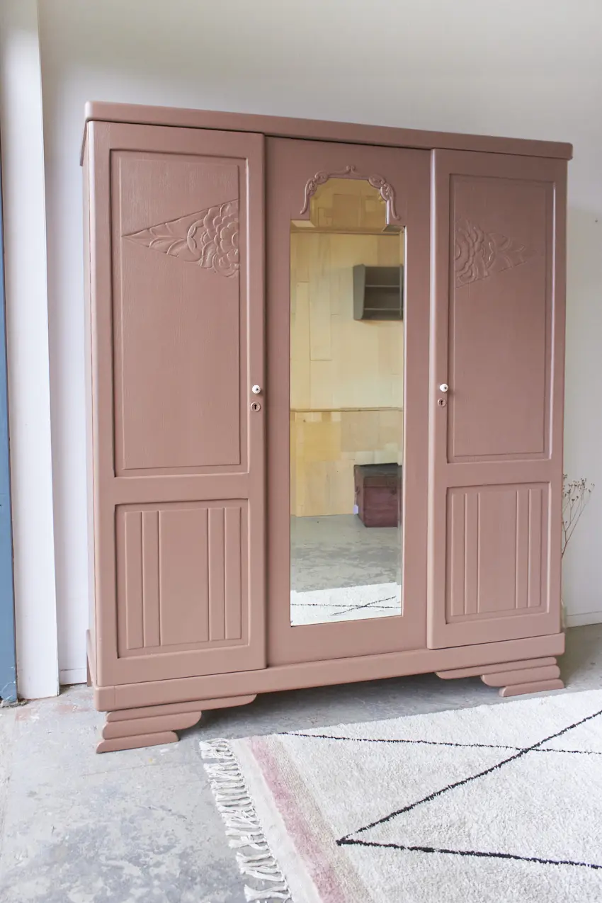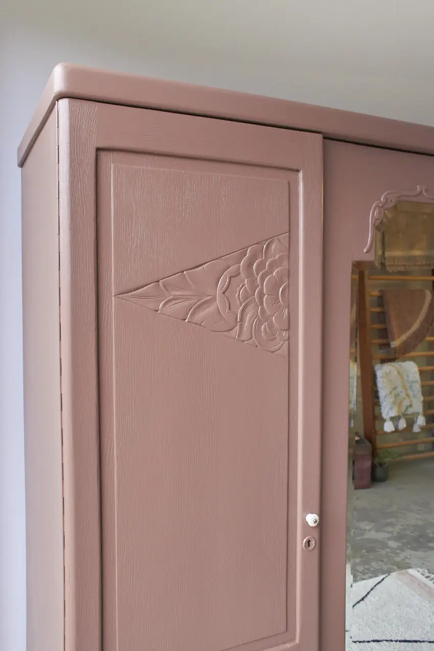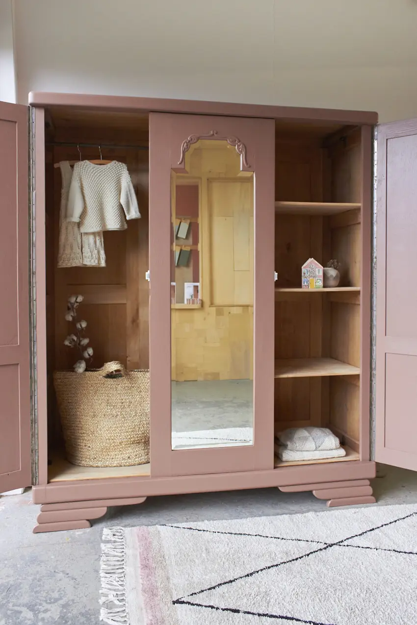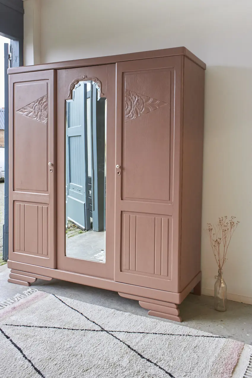 We hebben ervoor gekozen om de spiegelkast te schilderen in onze kleur Vijg. Een warme, oudroze kleur die de kast nog meer karakter geeft. De porseleinen knoppen maken hem helemaal af. Wat een fijn resultaat!